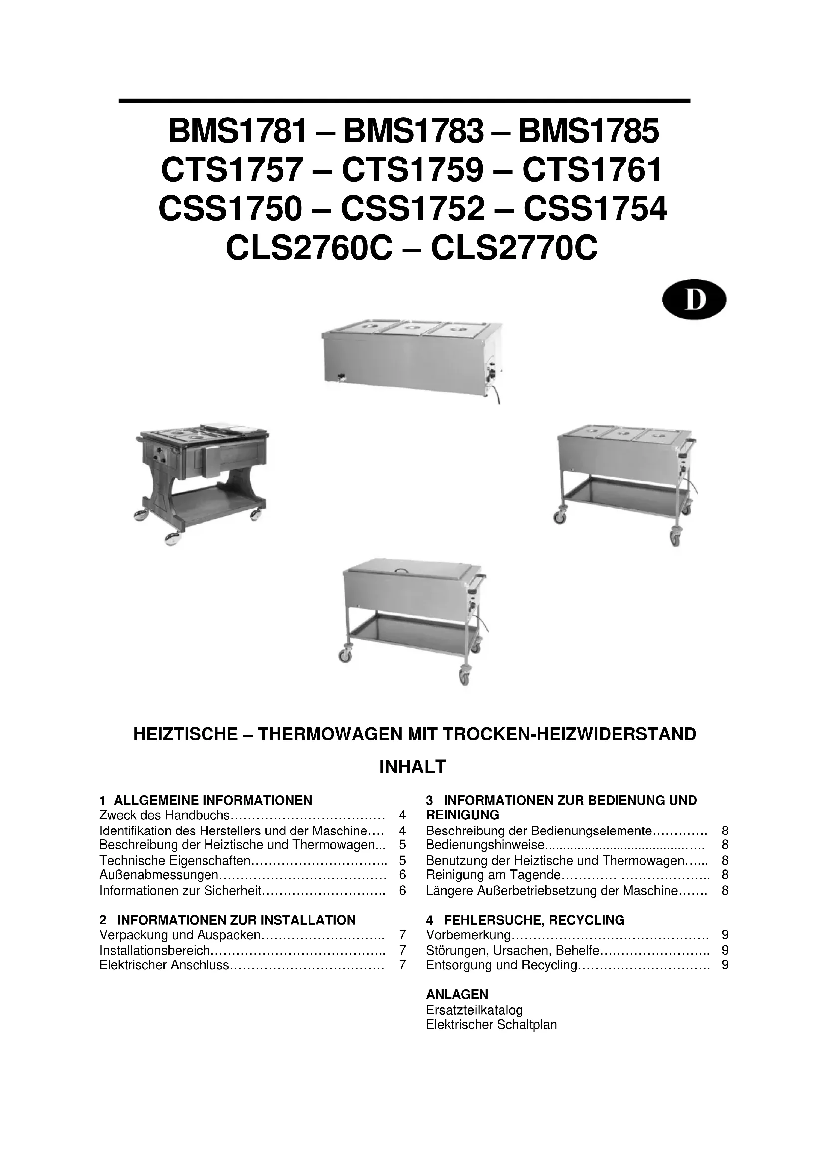REINIGUNG Beschreibung der Bedienungselemente…………. Bedienungshinweise.......................................….. Benutzung der Heiztische und Thermowagen…... Reinigung am Tagende…………………………….. Längere Außerbetriebsetzung der Maschine……. 4 FEHLERSUCHE, RECYCLING Vorbemerkung………………………………………. Störungen, Ursachen, Behelfe…………………….. Entsorgung und Recycling…………………………. ANLAGEN Ersatzteilkatalog Elektrischer Schaltplan