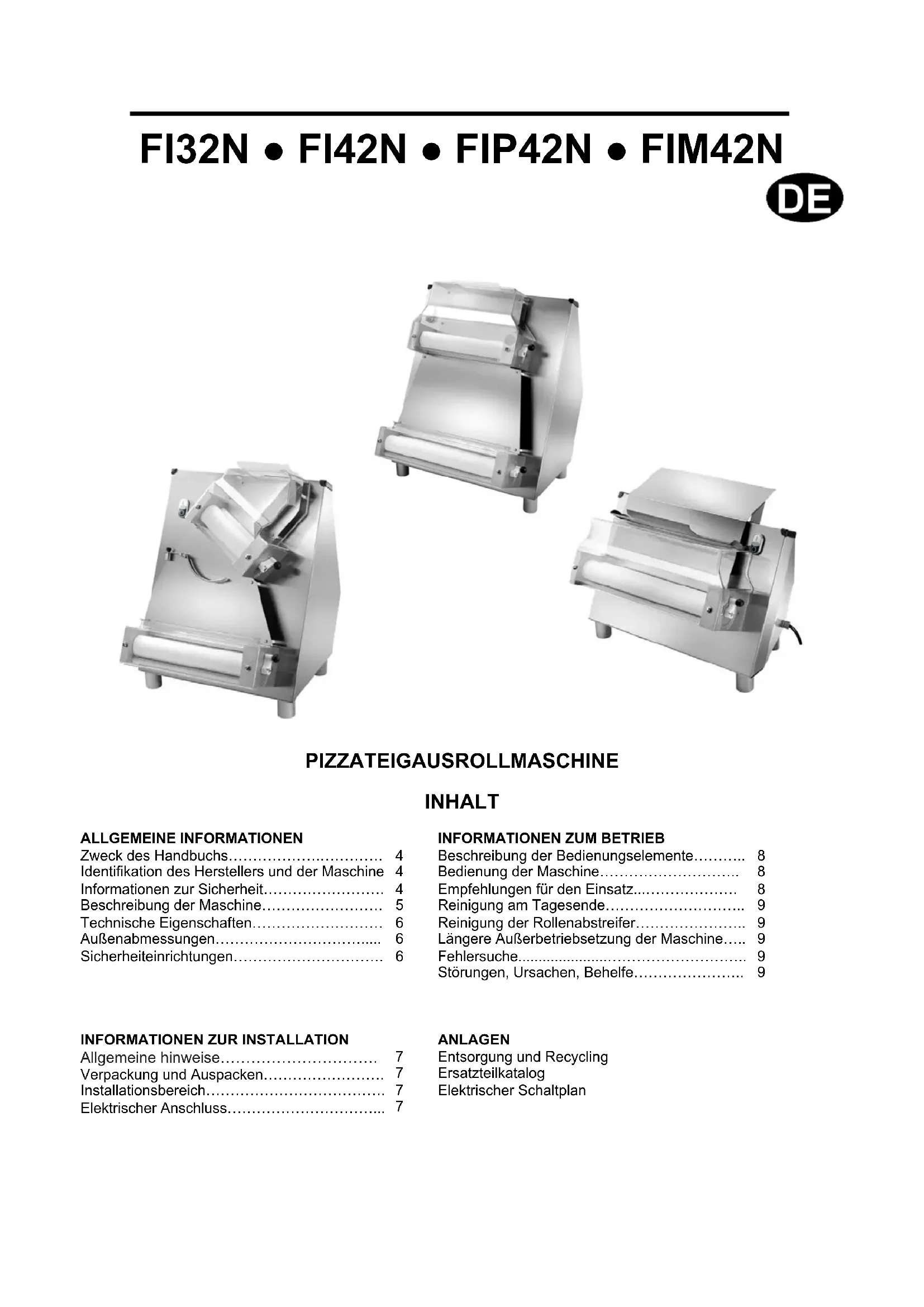 Informationen zur Sicherheit - Es ist von grundlegender Wichtigkeit, dieses Handbuch vor Installation und Gebrauch aufmerksam zu lesen. Die ständige Befolgung der im Handbuch enthaltenen Anweisungen gewährleisten die Sicherheit von Mensch und Maschine. - Manipulieren Sie in keinem Fall die Sicherheitseinrichtungen. - Die von den zuständigen Stellen in jedem Land herausgegebenen Arbeitssicherheitsvorschriften sind unbedingt einzuhalten. - Der Hersteller übernimmt keinerlei Haftung für Schäden an Personen oder Gegenständen infolge der Nichtbeachtung von Sicherheitsvorschriften. - Das für den elektrischen Anschluss befugte Personal muss prüfen, dass die Eigenschaften der Versorgungslinie mit den auf dem Schild der Maschine angegebenen übereinstimmen, und dass sie mit einem Differentialschalter und mit den geltenden Gesetzen und Normen entsprechenden Komponenten ausgerüstet ist. - Die korrekte Aufstellung der Maschine, Beleuchtung und Sauberkeit des Arbeitsplatzes sind wichtige Voraussetzungen für die Personalsicherheit. - Vor der Installation muss geprüft werden, dass der gewählte Bereich geeignet, ausreichend beleuchtet und stabil ist, und dass rund um die Maschine herum genügend Freiraum besteht, um die Wartungs- und Reinigungsarbeiten bequem ausführen zu können. - Setzen Sie die Maschine keinen äußeren Agenzien aus.ALLGEMEINE INFORMATIONEN - Anschluss und Inbetriebnahme der Maschine sind nur von technischem Fachpersonal durchzuführen. - Stellen Sie sicher, dass die Kenndaten der Anlage am Aufstellungsort der Maschine den auf dem Typenschild eingeprägten Werten entsprechen. - Stellen Sie sicher, dass die Maschine mit einer Erdungsanlage verbunden ist. - Der Arbeitsbereich um die Maschine herum ist stets sauber und trocken zu halten. - Tragen Sie die von den Unfallverhütungsvorschriften vorgesehene Schutzkleidung. - Diese Maschine darf nur für den vorgesehenen Einsatzbereich verwendet werden. Jeder andere Einsatz ist als unsachgemäß und somit als gefährlich zu betrachten. - Überprüfen Sie die Eignung und das Gewicht der zu verarbeitenden Produkte. Überlasten Sie die Maschine nicht über Ihre Kapazität hinaus. - Das Einführen von Gegenständen, Werkzeugen sowie das Greifen mit den Händen ins Innere gefährlicher Teile ist verboten. - Kinder sind von der Maschine fern zu halten. - Ziehen Sie den Netzstecker, wenn die Maschine nicht benutzt wird. - Nehmen Sie bei Defekten und/oder Schäden keine eigenständigen Reparaturen vor, sondern wenden Sie sich an einen autorisierten Händler. - Verlangen Sie stets Originalersatzteile. - Vor der Reinigung der Maschine ziehen Sie den Netzstecker, um die Stromversorgung zu unterbrechen. - Auf der Maschine dürfen keine losen Gegenstände herumliegen (Lappen, Werkzeug, Schlüssel, usw….), alle Schutzabdeckungen müssen gut befestigt und die Schutzvorrichtungen eingeschaltet sein. - Verwenden Sie zur Reinigung der Maschine keine Hochdruck-Wasserstrahlen. - Die Schaber unterhalb der unteren Walzen müssen korrekt und gut befestigt sein. - Die Maschine wurde in Übereinstimmung mit den diesbezüglichen, anwendbaren Richtlinien der Europäischen Union hergestellt, als sie auf den Markt gelangte. Beschreibung der Maschine Die Maschine ist ideal zum Ausrollen von rund geformtem Pizzateig. FI32N (maximaler Pizzadurchmesser 300 mm) FI42N (maximaler Pizzadurchmesser 400 mm) Einheit Mikroschalter Schalttafel Teigwender Untere Rutsche Stärkeregelungs-hebel