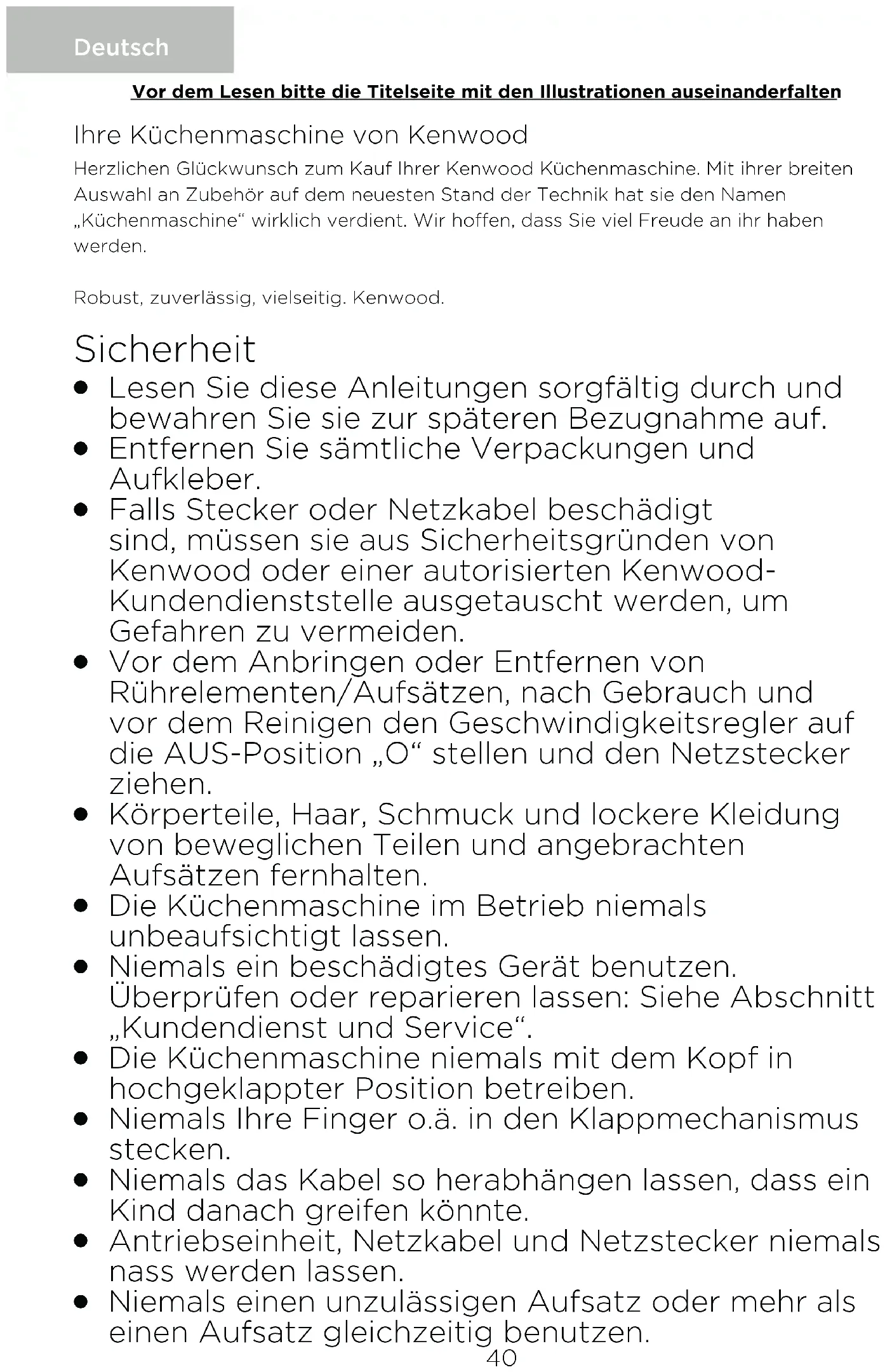 Niemals einen unzulässigen Aufsatz oder mehr als einen Aufsatz gleichzeitig benutzen. Deutsch Ihre Küchenmaschine von Kenwood Herzlichen Glückwunsch zum Kauf Ihrer Kenwood Küchenmaschine. Mit ihrer breiten Auswahl an Zubehör auf dem neuesten Stand der Technik hat sie den Namen „Küchenmaschine“ wirklich verdient. Wir hoffen, dass Sie viel Freude an ihr haben werden. Robust, zuverlässig, vielseitig. Kenwood. Vor dem Lesen bitte die Titelseite mit den Illustrationen auseinanderfalten 40O Niemals die in der Höchstmengen-Tabelle angegebenen Mengen überschreiten.