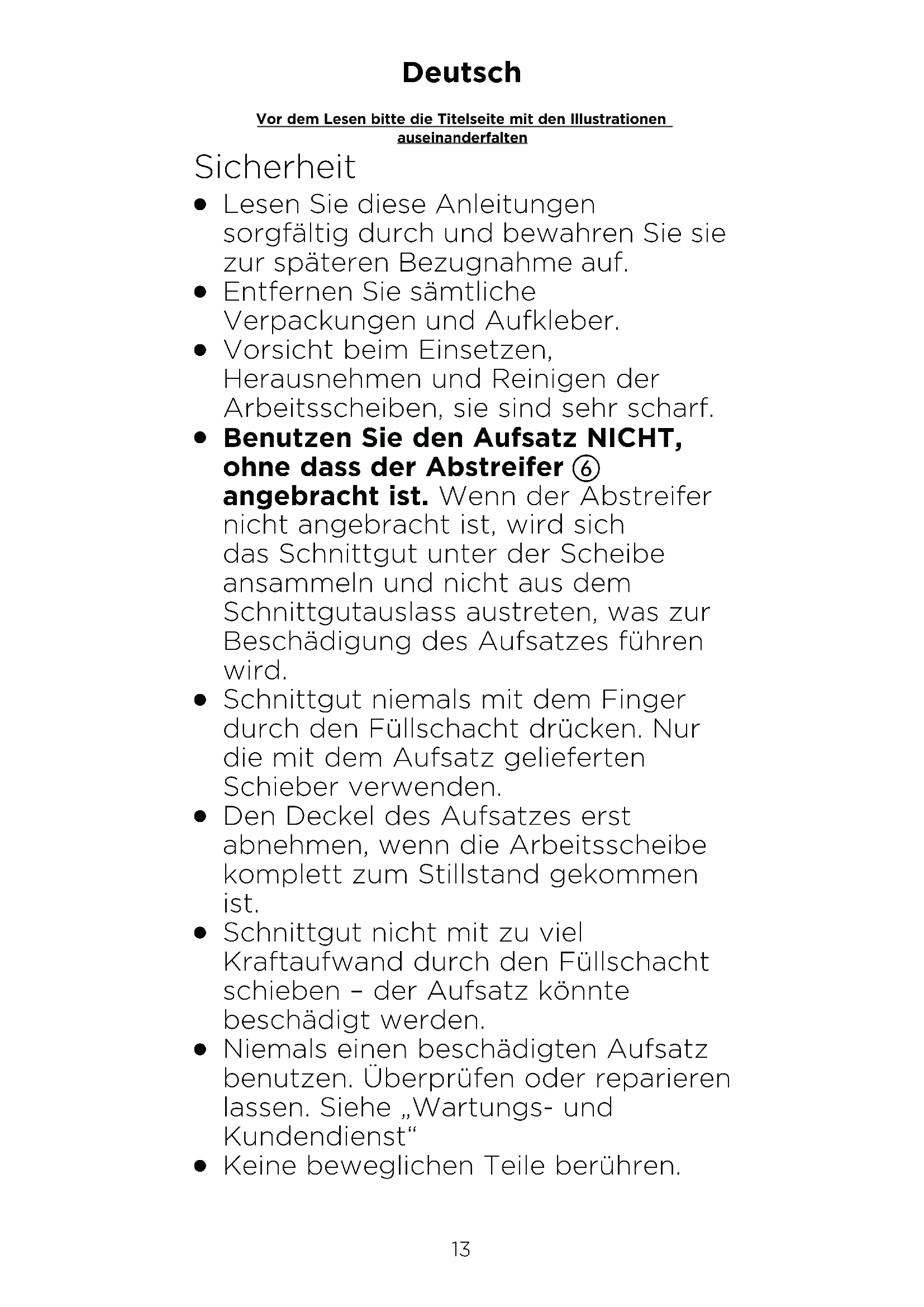 Schnittgut niemals mit dem Finger durch den Füllschacht drücken. Nur die mit dem Aufsatz gelieferten Schieber verwenden.