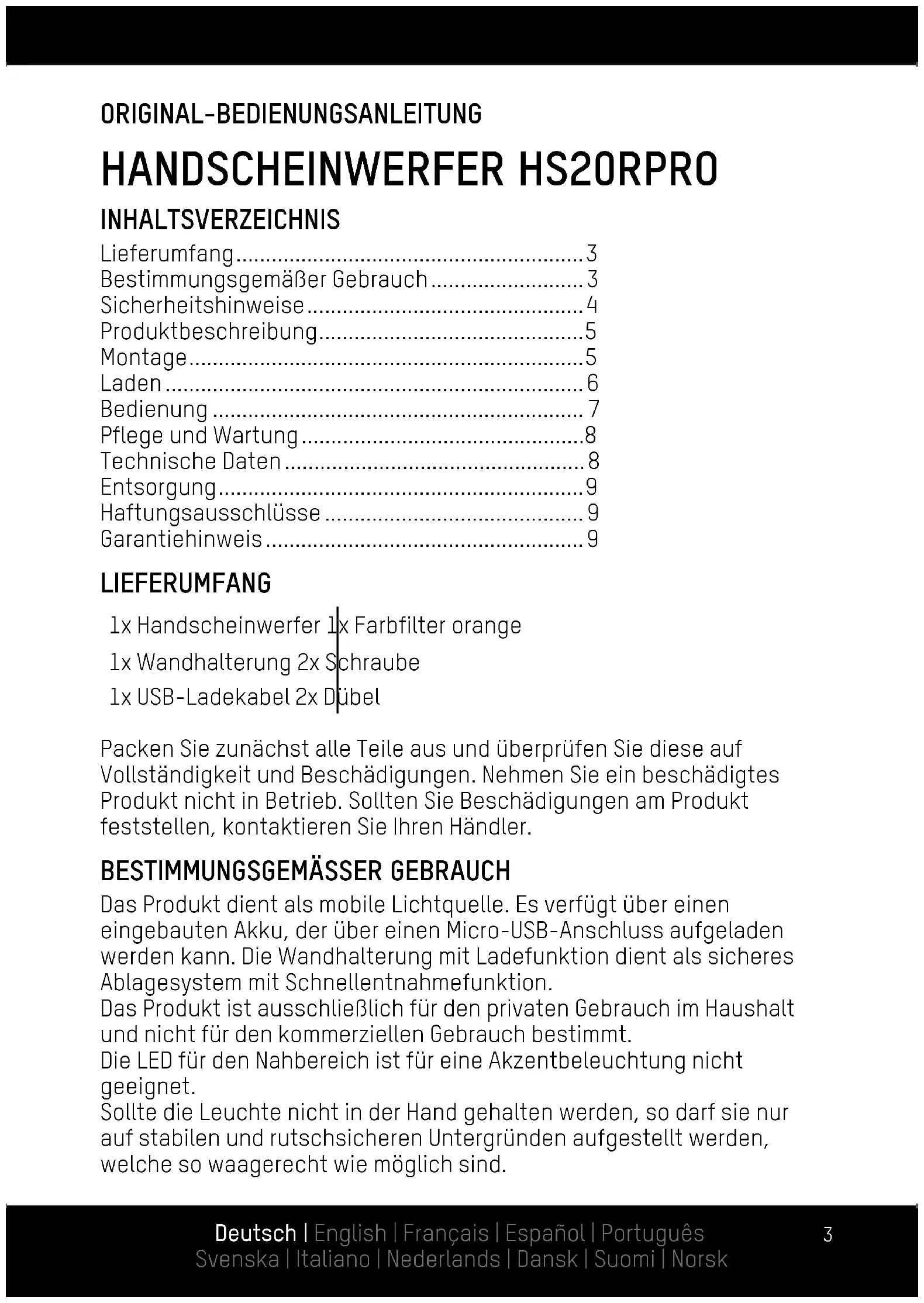 - Garantiehinweis LIEFERUMFANG 1x Handscheinwerfer 1x Farbfilter orange 1x Wandhalterung 2x Schraube 1x USB-Ladekabel 2x Dübel Packen Sie zunächst alle Teile aus und überprüfen Sie diese auf Vollständigkeit und Beschädigungen. Nehmen Sie ein beschädigtes Produkt nicht in Betrieb. Sollten Sie Beschädigungen am Produkt feststellen, kontaktieren Sie Ihren Händler. p. 9