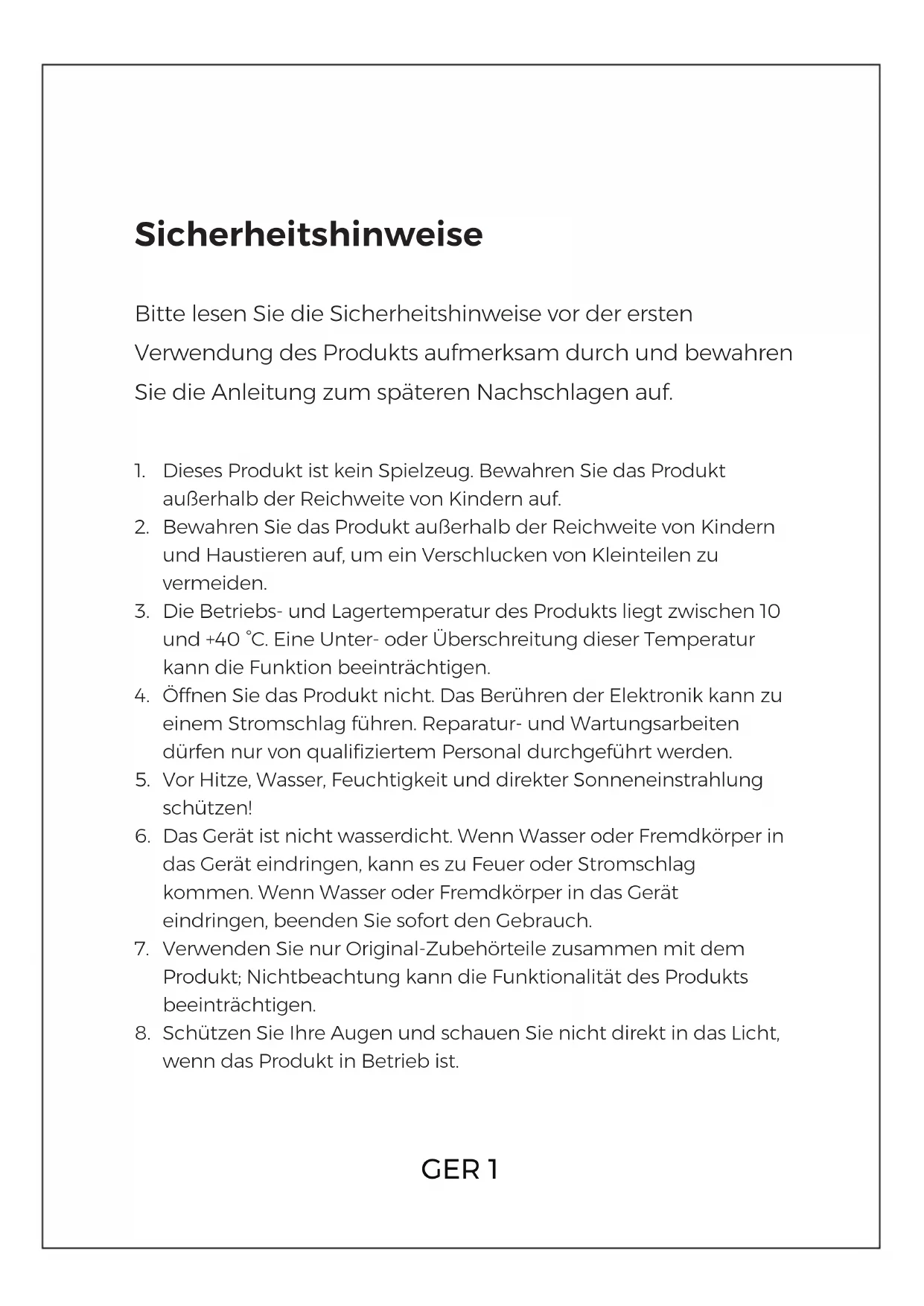 GER 1 Dieses Produkt ist kein Spielzeug. Bewahren Sie das Produkt außerhalb der Reichweite von Kindern auf. Bewahren Sie das Produkt außerhalb der Reichweite von Kindern und Haustieren auf, um ein Verschlucken von Kleinteilen zu vermeiden. Die Betriebs- und Lagertemperatur des Produkts liegt zwischen 10 und +40 °C. Eine Unter- oder Überschreitung dieser Temperatur kann die Funktion beeinträchtigen. Öffnen Sie das Produkt nicht. Das Berühren der Elektronik kann zu einem Stromschlag führen. Reparatur- und Wartungsarbeiten dürfen nur von qualifiziertem Personal durchgeführt werden. Vor Hitze, Wasser, Feuchtigkeit und direkter Sonneneinstrahlung schützen! Das Gerät ist nicht wasserdicht. Wenn Wasser oder Fremdkörper in das Gerät eindringen, kann es zu Feuer oder Stromschlag kommen. Wenn Wasser oder Fremdkörper in das Gerät eindringen, beenden Sie sofort den Gebrauch. Verwenden Sie nur Original-Zubehörteile zusammen mit dem Produkt; Nichtbeachtung kann die Funktionalität des Produkts beeinträchtigen. Schützen Sie Ihre Augen und schauen Sie nicht direkt in das Licht, wenn das Produkt in Betrieb ist. Bitte lesen Sie die Sicherheitshinweise vor der ersten Verwendung des Produkts aufmerksam durch und bewahren Sie die Anleitung zum späteren Nachschlagen auf.Disco light with remote control