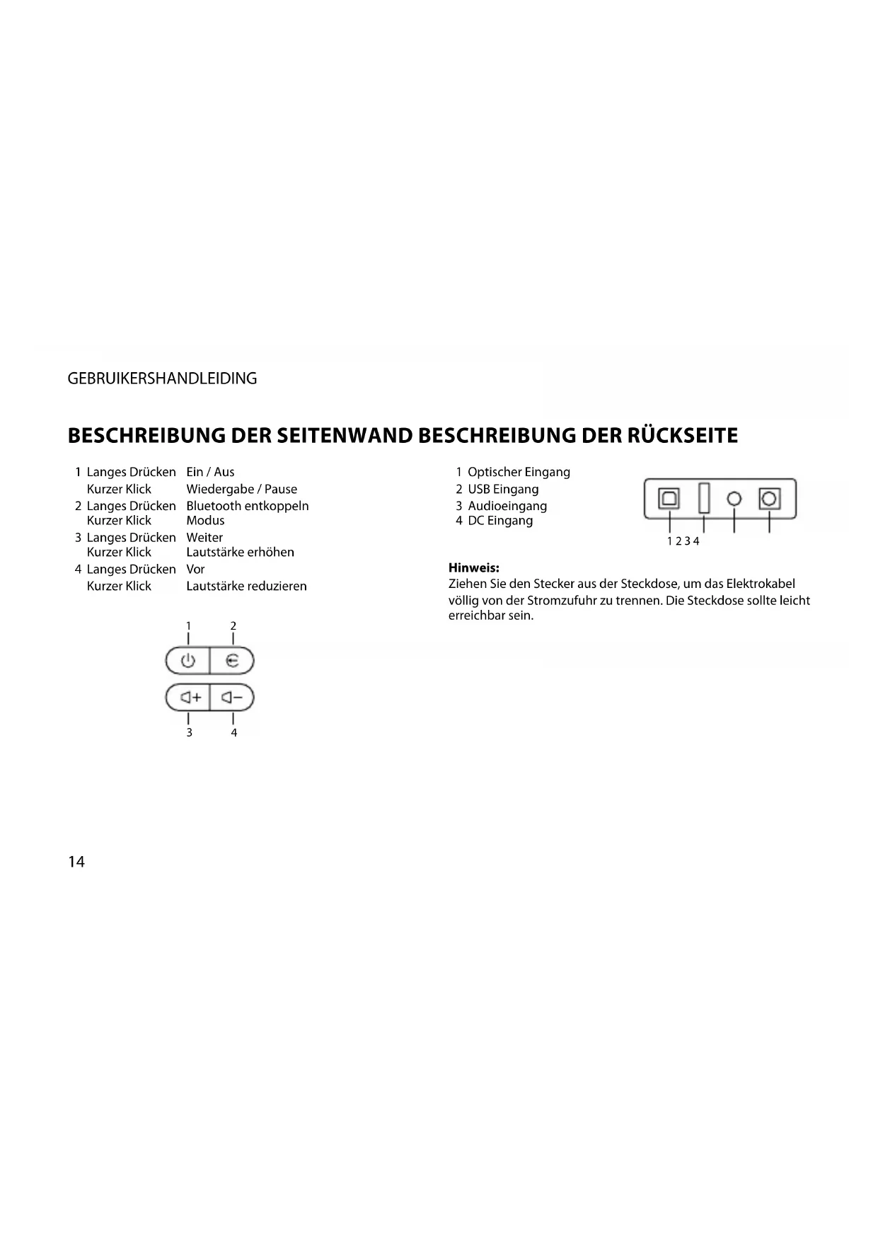 Langes Drücken Kurzer Klick Langes Drücken Kurzer Klick Langes Drücken Kurzer Klick Langes Drücken Kurzer Klick Ein / Aus Wiedergabe / Pause Bluetooth entkoppeln Modus Weiter Lautstärke erhöhen Vor Lautstärke reduzieren Optischer Eingang USB Eingang Audioeingang DC Eingang