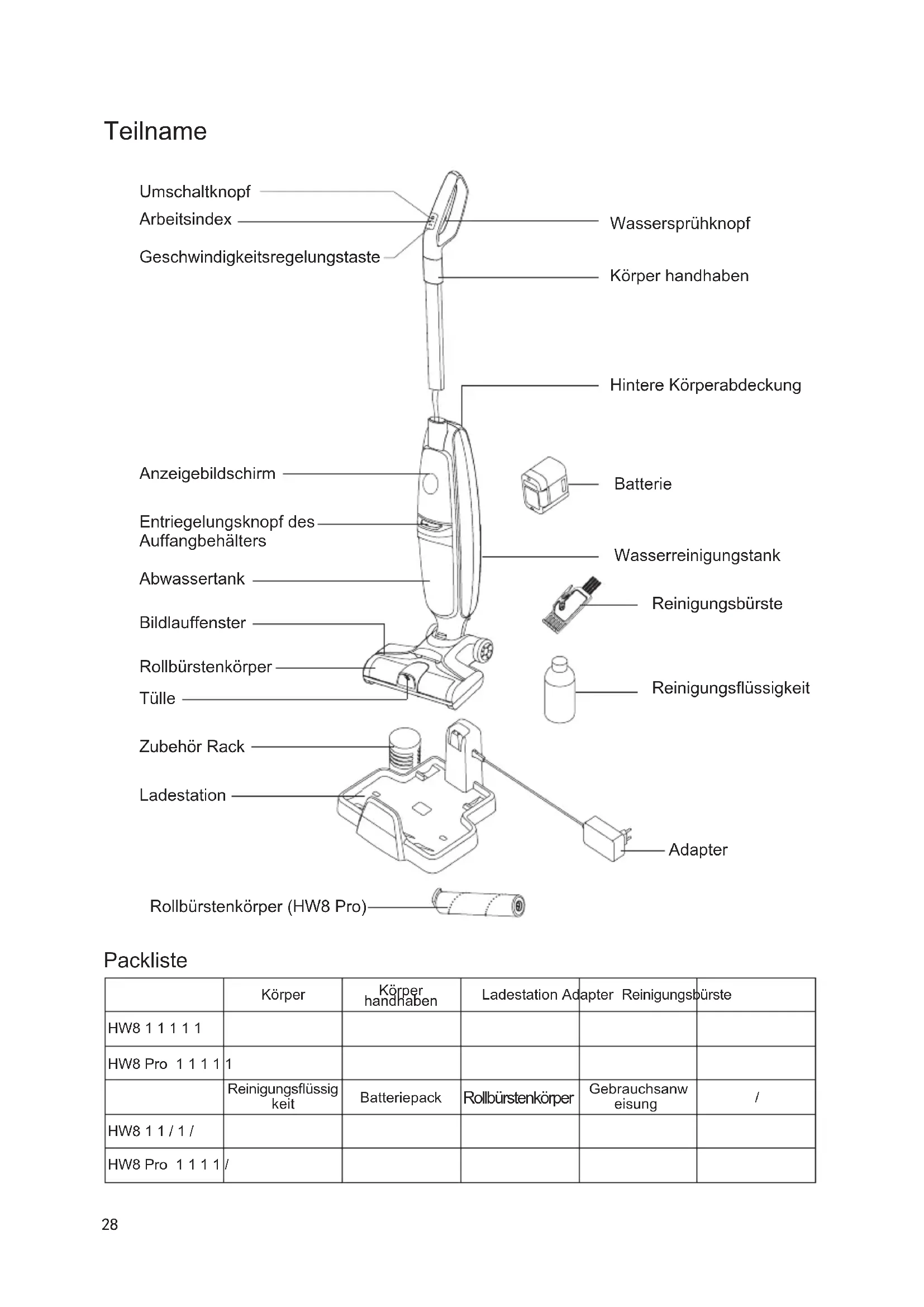 muss der Akku aus dem Gerät entfernt werden. 2.Wenn Sie den Akku entfernen, schaltet sich das Produkt aus und der Ladestecker wird nicht abgezogen. 3.Bitte entsorgen Sie den weggeworfenen Akku sicher und ordnungsgemäß. Werfen Sie ihn nicht in Feuer, Wasser oder Erde. 4.Wenn die Altbatterie ausläuft und die Haut oder Kleidung kontaminiert, entsorgen Sie sie bitte mit sauberem Wasser und suchen Sie rechtzeitig einen Arzt auf.38 Risoluzione dei problemi Si prega di controllare i seguenti punti prima di contattare il servizio post vendita. Fehlfunktion Möglicher Grund Lösung Maschine funktioniert nicht Batterie leer oder schwach Laden und rechtzeitig verwenden Maschine funktioniert nicht Schaltertaste nicht gedrückt Drücken Sie die Schaltertaste Maschine funktioniert nicht Starker Wirrwarr der Bürste Reinigen Sie die Walzenbürste rechtzeitig Maschine funktioniert nicht Das Abwasser im Abwassertank erreicht die MAX-Leitung Abwassertank aufräumen Maschine funktioniert nicht Halten Sie gleichzeitig die Sprühtaste und die Schalter- / Geschwindigkeitsregelungsta ste gedrückt Lassen Sie die Wassersprüht aste los und drücken Sie normalerweise nur den Schal ter / die Geschwindigkeitsreg elungstaste Maschine funktioniert nicht Drücken Sie die Schaltertaste, wenn Sie aufrecht stehen Kippen Sie die gesamte Maschine und rollen Sie die Bürste zur Arbeit Die Saugleistung wird kleiner Das Abwasser im Abwassertank erreicht die MAX-Leitung Abwassertank aufräumen Die Saugleistung wird kleiner Rollfenster und Rückgewinnungstanks sind nicht installiert Bringen Sie das Rollenbürstenfenster und den Papierkorb wieder an Die Saugleistung wird kleiner Bürstenkörper mit Haaren verwickelt Reinigen des Hauptkörpers der Walzenbürste Die Saugleistung wird kleiner Schmutziger Filter Reinigen oder ersetzen Sie den Filter Die Saugleistung wird kleiner Geringer Strom Nach dem Auaden verwenden Das Geräusch der gesamten Maschine ist abnormal Absaugung blockiert Fremdkörper in der Düse entfernen Das Geräusch der gesamten Maschine ist abnormal Das Abwasser im Abwassertank erreicht die MAX-Leitung Abwassertank aufräumen39 Kein Wasser am Boden Wassermangel im Reinwassertank Wasser in den Reinwassertank geben Kein Wasser am Boden Den Sprühknopf nicht gedrückt halten Drücken Sie den Sprinklerschalter Kein Wasser am Boden Der Reinwassertank ist nicht installiert Setzen Sie den Reinwassertank wieder ein Kein Wasser am Boden Der Reinwassertank ist voll mit Abwasser und blockiert die Wasserstraße Bitte beachten Sie, dass der Reinwassertank nicht mit Abwasser gefüllt werden kann Wasserspray am Luftauslass Der Filter ist nach der Reinigung nicht trocken Nach der Reinigung sollte der Filter vor Gebrauch getrocknet werden Wasserspray am Luftauslass Das Abwasser im Abwassertank erreicht die MAX-Leitung Abwassertank aufräumen Wasserspray am Luftauslass Während des Gebrauchs schüttelt oder schlägt die Maschine heftig gegen die Wand Abwassertank aufräumen Wasserspray am Luftauslass Kein Filter installiert Filter installieren Wasserspray am Luftauslass Kein Schwimmer Installationsschwimmer Wasserspray am Luftauslass Nachdem der Filter gereinigt wurde, kann er ohne Trocknung verwendet werden Trocknen Sie den Filter nach der Reinigung Hinweis: Wenn die oben beschriebene Anleitung zur Fehlerbehebung keine Lösung bietet, wenden Sie sich an den Kundendienst oder Ihren lokalen Vertreter.40 Produktspezikation Technische Parameter Modellnummer HW8 HW8 Pro Adaptereingang 100-240V