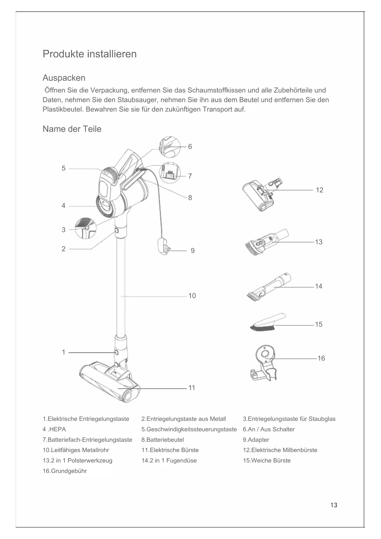 16.Grundgebühr 2.Entriegelungstaste aus Metall 5.Geschwindigkeitssteuerungstaste 8.Batteriebeutel 11.Elektrische Bürste