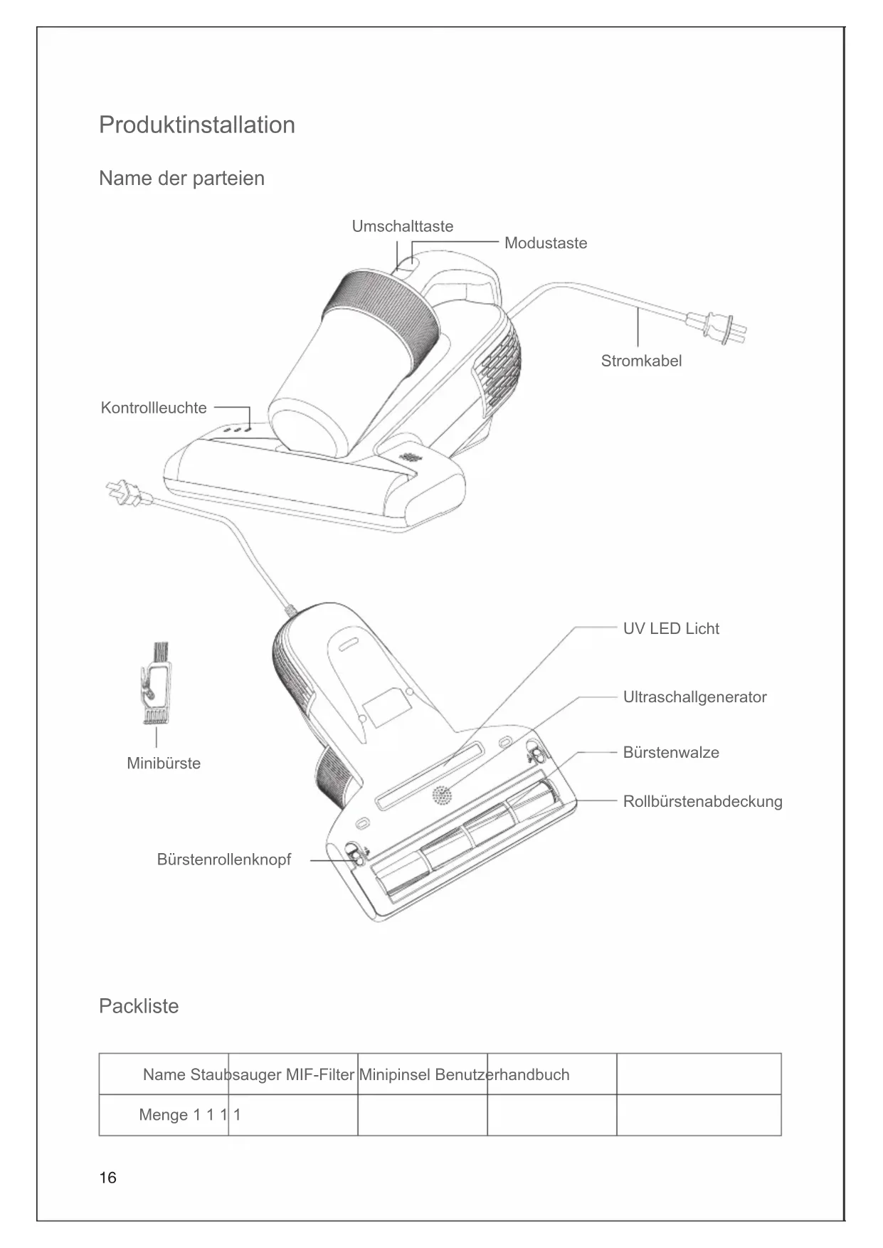 Rollbürstenabdeckung Walzenbür- stenanordnung19 trennen, um eine versehentliche Aktivierung der Bürstenrolle und Verletzungen zu vermeiden. Tägliche Wartung und Lagerung Es wird empfohlen, den Staubbecher und die MIF-Filterwatte nach jedem Gebrauch für den nächsten Gebrauch zu reinigen. Wenn der Staubbecher während des Gebrauchs voller Staub ist, wird empfohlen, ihn sofort zu reinigen, da sonst der Gebrauchseffekt beeinträchtigt wird; Nachdem die kumulative Nutzungszeit des MIF-Filters 30h-50h erreicht hat (je nach Verwendung des MIF-Filters), wird empfohlen, den MIF-Filter an der dafür vorgesehenen Stelle zu kaufen und zu ersetzen, um die Leistung des Geräts nicht zu beeinträchtigen. Die Durchdringung ultravioletter Strahlen ist schwach, und jedes Papier, gewöhnliches Glas oder Kunststoff verringert die Intensität der ultravioletten Strahlung erheblich. Darüber hinaus wirken sich die Staub- und Ölecken auf der unteren transparenten Abdeckung direkt auf die Durchdringungsfähigkeit aus, daher sollte die transparente Abdeckung regelmäßig abgewischt und gereinigt werden, um das Eindringen und die Stärke der ultravioletten Strahlen nicht zu beeinträchtigen. Berühren Sie die transparente Abdeckung nicht mit den Fingern, da Flecken das Eindringen von ultravioletten Strahlen beeinträchtigen. Wenn Sie das Gerät längere Zeit nicht benutzen, stellen Sie es bitte an einem kühlen und trockenen Ort auf und stellen Sie es nicht direktem Sonnenlicht oder einer feuchten Umgebung aus.20 Vorsichtsmaßnahmen 1.Lesen Sie diese Bedienungsanleitung vor dem Gebrauch sorgfältig durch und bewahren Sie sie zur späteren Verwendung an einem sicheren Ort auf. 2.Lassen Sie die Maschine niemals unbeaufsichtigt laufen. 3.Bitte schalten Sie den Netzschalter aus und ziehen Sie den Netzstecker, wenn das Gerät inaktiv sein soll. Ziehen Sie das Netzkabel bei einem Stromschlag nicht mit nassen Händen heraus. 4.Schalten Sie die Stromquelle während der Wartung oder bei Außerbetriebnahme aus. 5.Halten Sie die Stromleitung von scharfen Gegenständen fern und ziehen Sie das Kabel nicht heraus, um die Maschine zu bewegen, wenn das Kabel beschädigt ist. 6.Verwenden Sie das Produkt aus Sicherheitsgründen nicht zum Reinigen von heißen Gegenständen wie Kohlenstoff, Zigarettenkippen, scharfen Gegenständen, Glasscherben, ätzenden Flüssigkeiten, brennbaren und explosiven Stoffen, Benzin und Alkohol Dies kann das Produkt beschädigen oder einen Brand verursachen. 7.Verwenden Sie dieses Produkt nicht zum Reinigen von Wasser oder feuchtem Staub. Verwenden Sie es nicht an feuchten Orten (z. B. Bad, WC, Wäsche usw.), um Störungen zu vermeiden. 8.Stellen Sie das Gerät nicht in der Nähe von Heizkörpern auf und setzen Sie es bei Brandgefahr keinem direkten Sonnenlicht aus. 9.Halten Sie dieses Produkt von besonderen Personen wie Kindern fern, die nicht von Erwachsenen beaufsichtigt werden. 10.Betreiben Sie die Maschine nicht mit blockierter Ansaugöffnung, wenn das Produkt beschädigt ist. 11.Das Produkt ist mit UV-Licht ausgestattet. Schauen Sie aus Sicherheitsgründen nicht auf den Boden des Geräts, wenn die UV-Strahlung eingeschaltet ist. 12.Wenden Sie dieses Produkt nicht auf Pflanzen an, um übermäßige UV-Schäden und Schäden an Gegenständen zu vermeiden. 13.Setzen Sie sich NICHT auf dieses Produkt, um eine Beschädigung des Produkts zu vermeiden. 14.Entfernen Sie nicht die Bürstenwalzenabdeckung und drücken Sie die Abdeckung nicht nach außen, während die Maschine eingeschaltet oder in Betrieb ist. 15.Dieses Produkt darf NUR zur Reinigung von Textilien wie Matratzen, Decken, Kissen, Sofas usw. verwendet werden. 16.Wenn die Stromleitung beschädigt ist, wenden Sie sich an den Hersteller und andere Sicherheitsexperten.21 Fehlerbehebung Wenn der Fehler nach den folgenden Lösungen weiterhin besteht, wenden Sie sich sofort an den Kundendienst oder den örtlichen Händler. Schwierigkeiten Mögliche Gründe Lösung Lebensmittelversagen Die Stromleitung ist nicht fest eingesteckt Stecken Sie die Stromleitung fest ein. Kein Strom an der Steckdose Überprüfen Sie die Steckdose Interrupteur d'alimentation non appuyé Appuyez sur le bouton Marche / Arrêt. Niedrige Saugleistung Mundstück blockiert Sauganschluss reinigen Ansammlung von Staub auf dem Filter Reinigen Sie den Filter Staubansammlung auf dem Zyklon Reinigen Sie den Zyklon UV-Röhrenversagen Die UV-Funktion wird aus Sicherheitsgründen oder zur Verringerung der Reexion des Objekts automatisch deaktiviert Die UV-Funktion funktioniert bei einer Höhe des Objekts von weniger als 3 cm Die Maschine arbeitet lange in der gleichen Position Bewegen Sie die Maschine vorwärts und rückwärts Die Maschine steht senkrecht Die Maschine kippte nicht mehr als 30 Grad. Das Sensorfenster ist verschmutzt Reinigen Sie das Sensorfenster mit einem halbtrockenen Tuch. UV-Lichtschäden Wenden Sie sich an den Kundendienst Schaltet sich automatisch aus Der Staubbecher ist voll Die Maschine stoppt automatisch, um zu verhindern, dass der Motor längere Zeit läuft. Wenn sich die Maschine automatisch abgestellt hat, reinigen Sie den Staubbehälter und den Filter, ziehen Sie den Netzstecker und verwenden Sie ihn nach 2 Stunden wieder Sauganschluss verstopft Filter verstopft Bürstenwalzenfehler Bürstenwalze mit Fremdkörpern verheddert Entfernen Sie die Abdeckung und reinigen Sie die Bürstenwalze gemäß der Gebrauchsanweisung Der Gürtel ist kaputt. Entfernen Sie die Abdeckung gemäß der Gebrauchsanweisung und überprüfen Sie, ob der Riemen gebrochen ist. Wenden Sie sich zur Reparatur an den Kundendienst Anmerkungen: Wenn nach der Einführung der folgenden Lösungen ein Problem auftritt, wenden Sie sich sofort an den Kundendienst oder den Händler vor Ort.22 Produktspezikationen Technische Parameter Modell BX6 Nennspannung 220V-240V ~ Nennfrequenz 50Hz Nennleistung 600W Bodenbürstenmotor 220V-240V ~50Hz Entstaubungsmotor