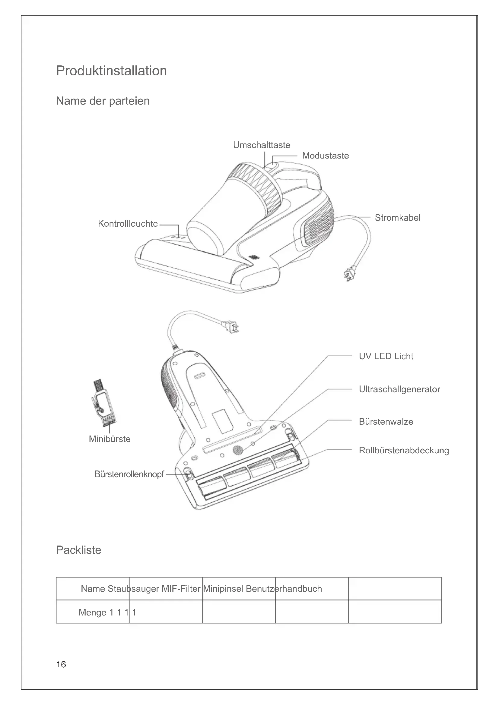 Schließung Offen Staubbecherabdeckung -sbaugruppe19 trennen, um eine versehentliche Aktivierung der Bürstenrolle und Verletzungen zu vermeiden. Tägliche Wartung und Lagerung Es wird empfohlen, den Staubbecher und die MIF-Filterwatte nach jedem Gebrauch für den nächsten Gebrauch zu reinigen. Wenn der Staubbecher während des Gebrauchs voller Staub ist, wird empfohlen, ihn sofort zu reinigen, da sonst der Gebrauchseffekt beeinträchtigt wird; Nachdem die kumulative Nutzungszeit des MIF-Filters 30h-50h erreicht hat (je nach Verwendung des MIF-Filters), wird empfohlen, den MIF-Filter an der dafür vorgesehenen Stelle zu kaufen und zu ersetzen, um die Leistung des Geräts nicht zu beeinträchtigen. Die Durchdringung ultravioletter Strahlen ist schwach, und jedes Papier, gewöhnliches Glas oder Kunststoff verringert die Intensität der ultravioletten Strahlung erheblich. Darüber hinaus wirken sich die Staub- und Ölecken auf der unteren transparenten Abdeckung direkt auf die Durchdringungsfähigkeit aus, daher sollte die transparente Abdeckung regelmäßig abgewischt und gereinigt werden, um das Eindringen und die Stärke der ultravioletten Strahlen nicht zu beeinträchtigen. Berühren Sie die transparente Abdeckung nicht mit den Fingern, da Flecken das Eindringen von ultravioletten Strahlen beeinträchtigen. Wenn Sie das Gerät längere Zeit nicht benutzen, stellen Sie es bitte an einem kühlen und trockenen Ort auf und stellen Sie es nicht direktem Sonnenlicht oder einer feuchten Umgebung aus.20 Vorsichtsmaßnahmen 1.Lesen Sie diese Bedienungsanleitung vor dem Gebrauch sorgfältig durch und bewahren Sie sie zur späteren Verwendung an einem sicheren Ort auf. 2.Lassen Sie die Maschine niemals unbeaufsichtigt laufen. 3.Bitte schalten Sie den Netzschalter aus und ziehen Sie den Netzstecker, wenn das Gerät inaktiv sein soll. Ziehen Sie das Netzkabel bei einem Stromschlag nicht mit nassen Händen heraus. 4.Schalten Sie die Stromquelle während der Wartung oder bei Außerbetriebnahme aus. 5.Halten Sie die Stromleitung von scharfen Gegenständen fern und ziehen Sie das Kabel nicht heraus, um die Maschine zu bewegen, wenn das Kabel beschädigt ist. 6.Verwenden Sie das Produkt aus Sicherheitsgründen nicht zum Reinigen von heißen Gegenständen wie Kohlenstoff, Zigarettenkippen, scharfen Gegenständen, Glasscherben, ätzenden Flüssigkeiten, brennbaren und explosiven Stoffen, Benzin und Alkohol Dies kann das Produkt beschädigen oder einen Brand verursachen. 7.Verwenden Sie dieses Produkt nicht zum Reinigen von Wasser oder feuchtem Staub. Verwenden Sie es nicht an feuchten Orten (z. B. Bad, WC, Wäsche usw.), um Störungen zu vermeiden. 8.Stellen Sie das Gerät nicht in der Nähe von Heizkörpern auf und setzen Sie es bei Brandgefahr keinem direkten Sonnenlicht aus. 9.Halten Sie dieses Produkt von besonderen Personen wie Kindern fern, die nicht von Erwachsenen beaufsichtigt werden. 10.Betreiben Sie die Maschine nicht mit blockierter Ansaugöffnung, wenn das Produkt beschädigt ist. 11.Das Produkt ist mit UV-Licht ausgestattet. Schauen Sie aus Sicherheitsgründen nicht auf den Boden des Geräts, wenn die UV-Strahlung eingeschaltet ist. 12.Wenden Sie dieses Produkt nicht auf Pflanzen an, um übermäßige UV-Schäden und Schäden an Gegenständen zu vermeiden. 13.Setzen Sie sich NICHT auf dieses Produkt, um eine Beschädigung des Produkts zu vermeiden. 14.Entfernen Sie nicht die Bürstenwalzenabdeckung und drücken Sie die Abdeckung nicht nach außen, während die Maschine eingeschaltet oder in Betrieb ist. 15.Dieses Produkt darf NUR zur Reinigung von Textilien wie Matratzen, Decken, Kissen, Sofas usw. verwendet werden. 16.Wenn die Stromleitung beschädigt ist, wenden Sie sich an den Hersteller und andere Sicherheitsexperten.21 Fehlerbehebung Wenn der Fehler nach den folgenden Lösungen weiterhin besteht, wenden Sie sich sofort an den Kundendienst oder den örtlichen Händler. Schwierigkeiten Mögliche Gründe Lösung Lebensmittelversagen Die Stromleitung ist nicht fest eingesteckt Stecken Sie die Stromleitung fest ein Kein Strom an der Steckdose. Überprüfen Sie die Steckdose Interrupteur d'alimentation non appuyé Appuyez sur le bouton Marche / Arrêt Niedrige Saugleistung Mundstück blockiert Sauganschluss reinigen Ansammlung von Staub auf dem Filter Reinigen Sie den Filter Staubansammlung auf dem Zyklon Reinigen Sie den Zyklon UV-Röhrenversagen Die UV-Funktion wird aus Sicherheitsgründen oder zur Verringerung der Reexion des Objekts automatisch deaktiviert. Die UV-Funktion funktioniert bei einer Höhe des Objekts von weniger als 3 cm Die Maschine arbeitet lange in der gleichen Position Bewegen Sie die Maschine vorwärts und rückwärts Die Maschine steht senkrecht Die Maschine kippte nicht mehr als 30 Grad Das Sensorfenster ist verschmutzt Reinigen Sie das Sensorfenster mit einem halbtrockenen Tuch UV-Lichtschäden Wenden Sie sich an den Kundendienst Schaltet sich automatisch aus Der Staubbecher ist voll Die Maschine stoppt automatisch, um zu verhindern, dass der Motor längere Zeit läuft. Wenn sich die Maschine automatisch abgestellt hat, reinigen Sie den Staubbehälter und den Filter, ziehen Sie den Netzstecker und verwenden Sie ihn nach 2 Stunden wieder Sauganschluss verstopft Filter verstopft Bürstenwalzenfehler Bürstenwalze mit Fremdkörpern verheddert Entfernen Sie die Abdeckung und reinigen Sie die Bürstenwalze gemäß der Gebrauchsanweisung Der Gürtel ist kaputt Entfernen Sie die Abdeckung gemäß der Gebrauchsanweisung und überprüfen Sie, ob der Riemen gebrochen ist. Wenden Sie sich zur Reparatur an den Kundendienst Anmerkungen: Wenn nach der Einführung der folgenden Lösungen ein Problem auftritt, wenden Sie sich sofort an den Kundendienst oder den Händler vor Ort.22 Produktspezikationen Technische Parameter Modell WB73 Nennspannung 220V-240V ~ Nennfrequenz 50Hz Nennleistung 600W Bodenbürstenmotor 220V-240V ~50Hz Entstaubungsmotor
