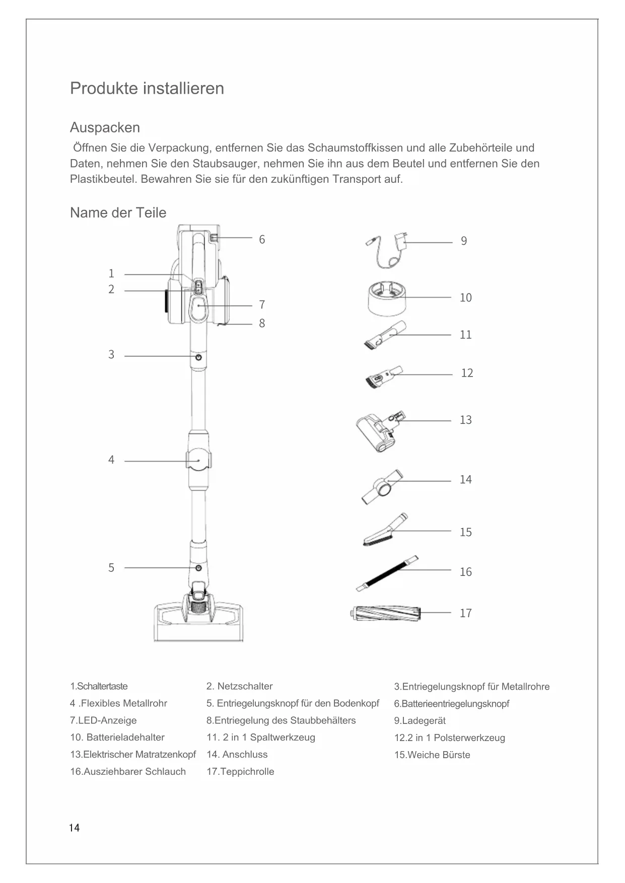 17.Teppichrolle 3.Entriegelungsknopf für Metallrohre 6.Batterieentriegelungsknopf 9.Ladegerät