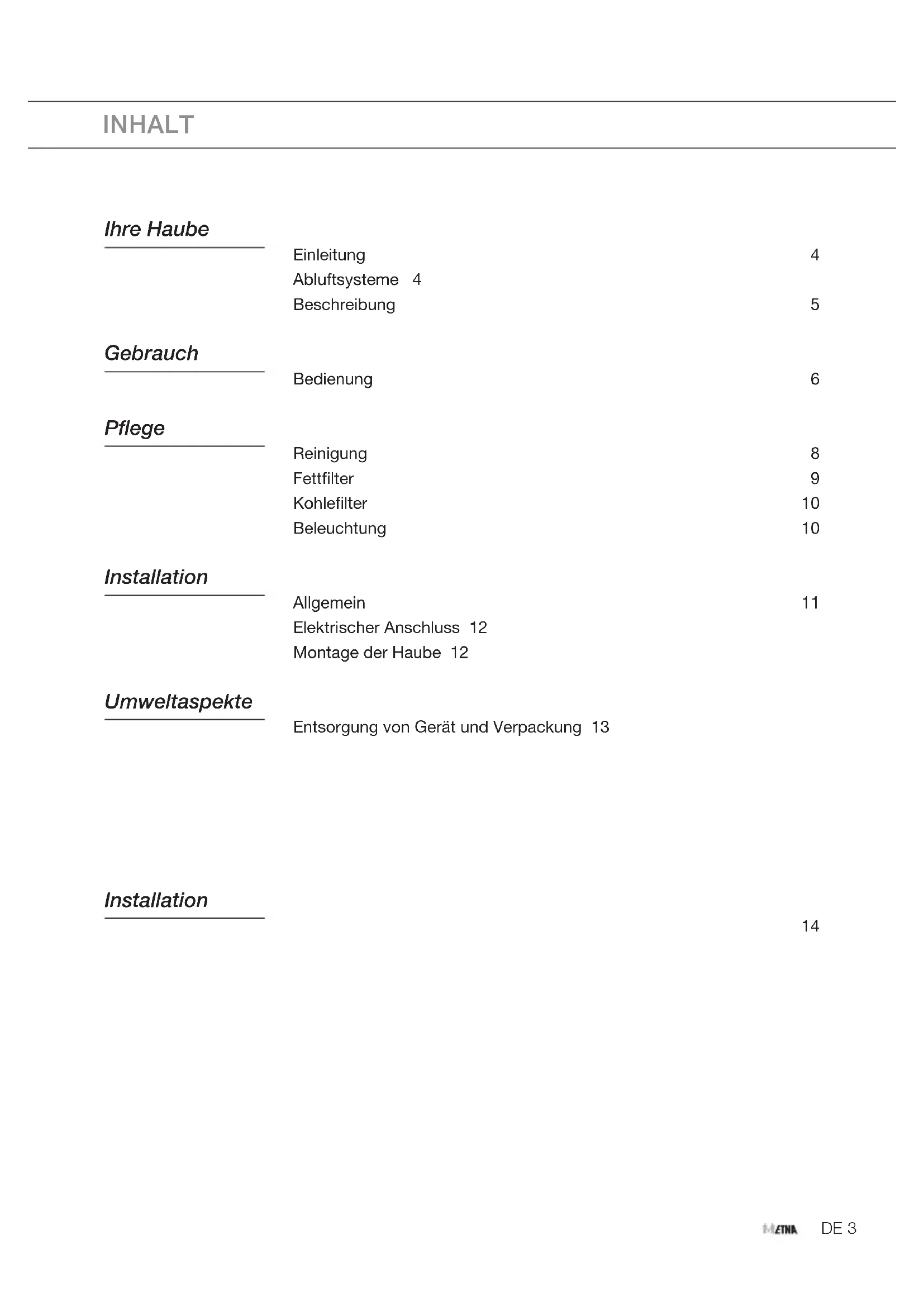- CFRP-freies Polystyrol (PS-Hartschaum). Diese Werkstoffe sind ordnungsgemäß und gemäß den behördlichen Vorschriften zu entsorgen. Zur Erinnerung an die Verpflichtung, die Elektrohaushaltsgeräte getrennt zu beseitigen, ist das Produkt mit einer durchgestrichenen Mülltonne gekennzeichnet. Dies bedeutet, dass das Produkt am Ende seiner Nutzungszeit nicht zusammen mit dem Hausabfall beseitigt werden darf. Stattdessen muss es zur Entsorgung bei einer von den städtischen Behörden eingerichteten Sammelstelle oder zu einem Fachhändler, der einen Rücknahmeservice anbietet, gebracht werden. Die getrennte Entsorgung eines Haushaltsgerätes vermeidet mögliche negative Auswirkungen auf die Umwelt und die menschliche Gesundheit, die eine nicht vorschriftsmäßige Entsorgung zur Folge hat. Außerdem wird die Wiederverwertung der Materialien ermöglicht, aus denen das Gerät besteht, was wiederum eine bedeutende Einsparung an Energie und Ressourcen mit sich bringt. Konformitätserklärung Wir erklären, dass unsere Produkte die für sie relevanten europäischen Richtlinien, Beschlüsse und Verordnungen erfüllen, sowie die Anforderungen der angegebenen Normen.DE 14EN 3 CONTENTS Your cooker hood Introduction 4 Extraction systems 4 Description 5 Use Controls 6 Maintenance Cleaning 8 Grease filter 9 Carbon filter 10 Lighting 10 Installation General 11 Electrical connection 12 Installing the cooker hood 12 Environmental aspects Disposal of the appliance and packaging 13 Installation 14EN 4 Introduction This user manual gives you a quick overview of all the possibilities offered by the appliance. You will find information on safety measures and maintaining the appliance. Please retain this user manual and the installation guide. They may be of use to future users of the appliance. You can find the most recent version of the instructions for use on our website. Read the separate safety instructions before using the device! Extraction systems The cooker hood can be connected in two ways: