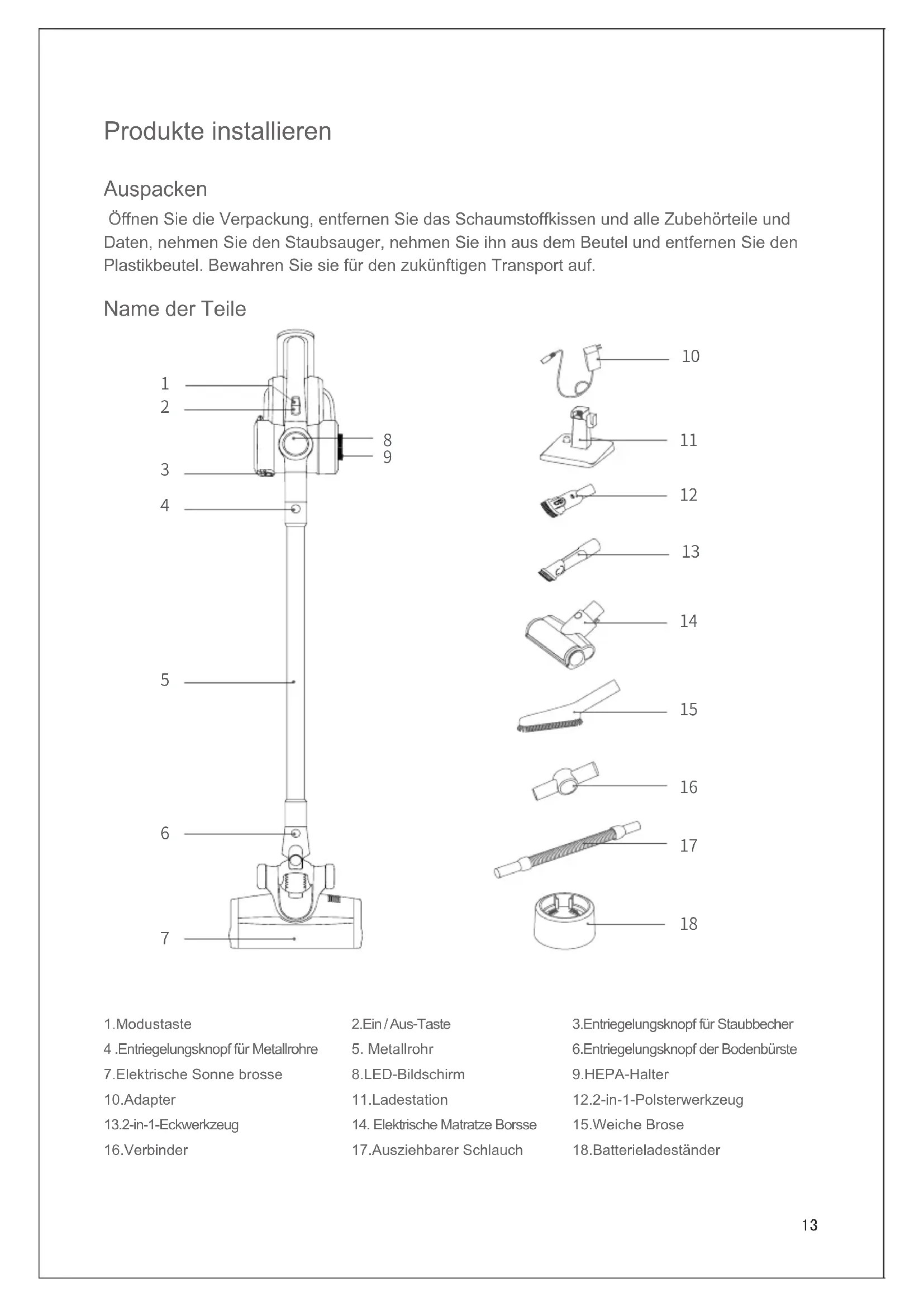 17.Ausziehbarer Schlauch 3.Entriegelungsknopf für Staubbecher 6.Entriegelungsknopf der Bodenbürste 9.HEPA-Halter 12.2-in-1-Polsterwerkzeug 15.Weiche Brose 18.Batterieladeständer
