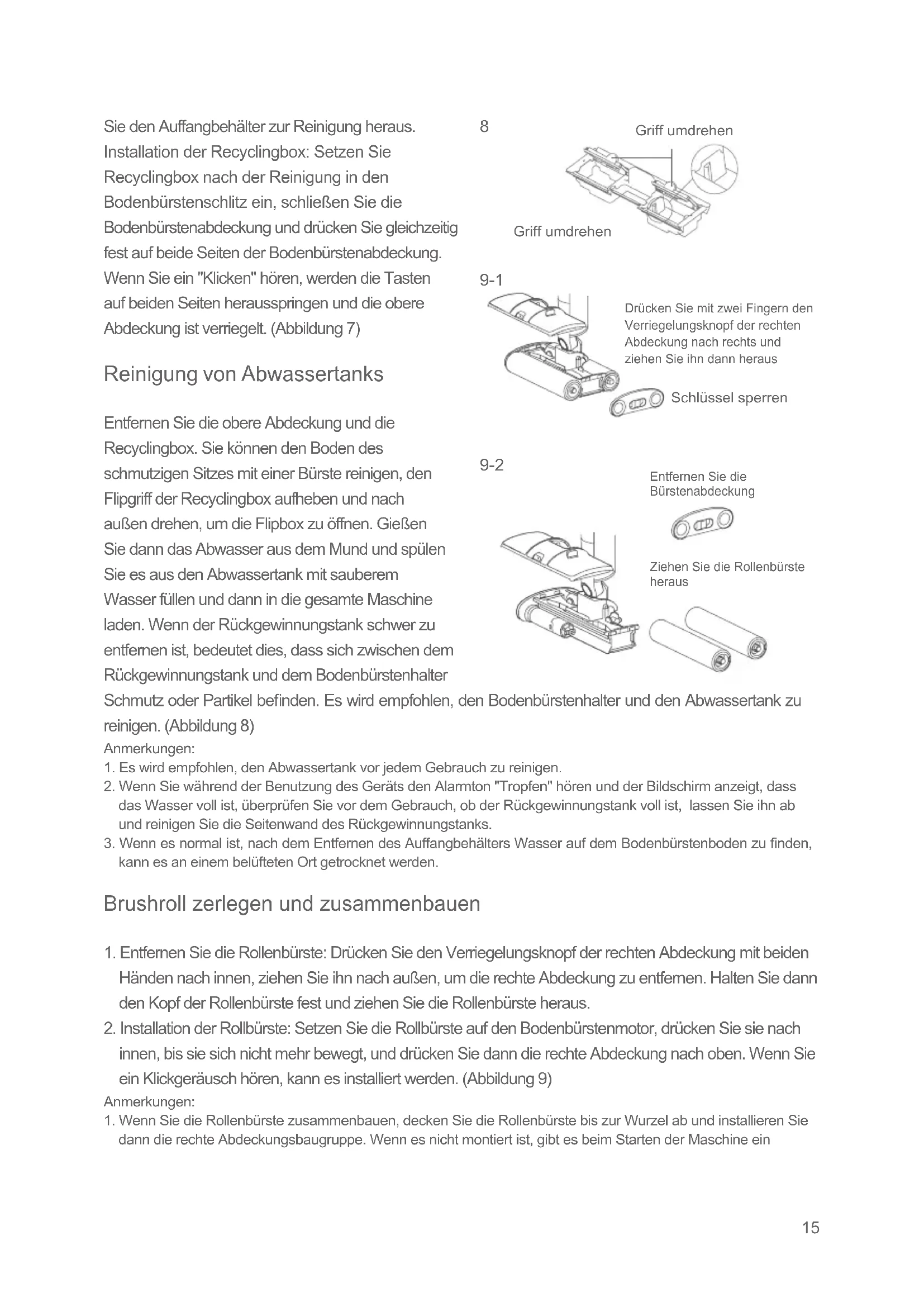 9-1 9-2 Griff umdrehen Griff umdrehen Drücken Sie mit zwei Fingern den Verriegelungsknopf der rechten Abdeckung nach rechts und ziehen Sie ihn dann heraus Schlüssel sperren Entfernen Sie die Bürstenabdeckung Ziehen Sie die Rollenbürste heraus16 ungewöhnliches Geräusch. Beenden Sie in diesem Fall sofort den Vorgang und setzen Sie die Walzenbürste wieder zusammen.