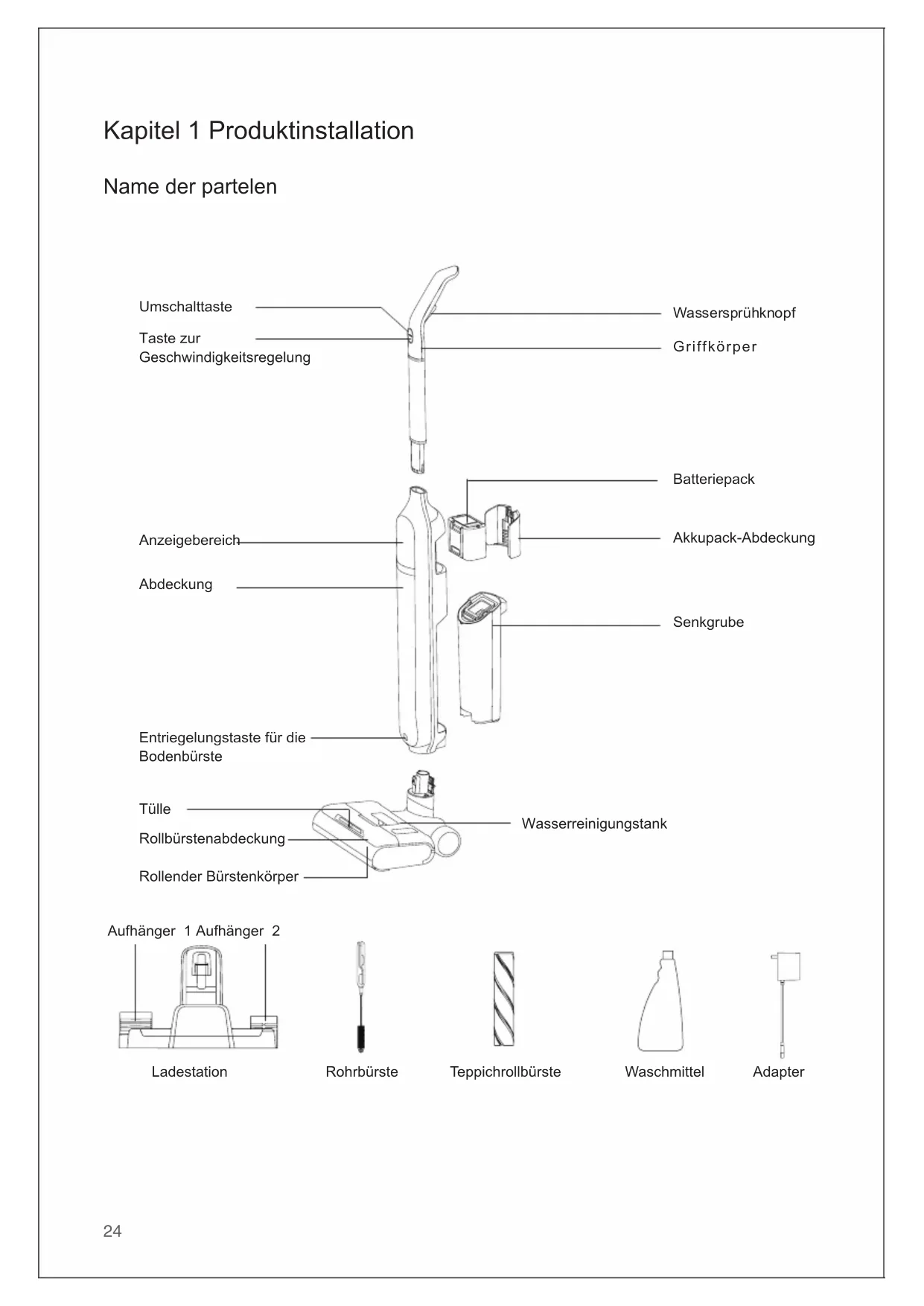 Name Körper Griffkörper Bodenbürst eneinheit Batterie Ladestation Adapter Menge 1 1 1 1 1 1 Name Reinigungsf lüssigkeit Rohrbürste Aufhänger 1 Aufhänger 2 Teppichroll bürste Benutzerha ndbuch Menge 1 1 1 1 1 1 Aufhänger 1 Aufhänger 226