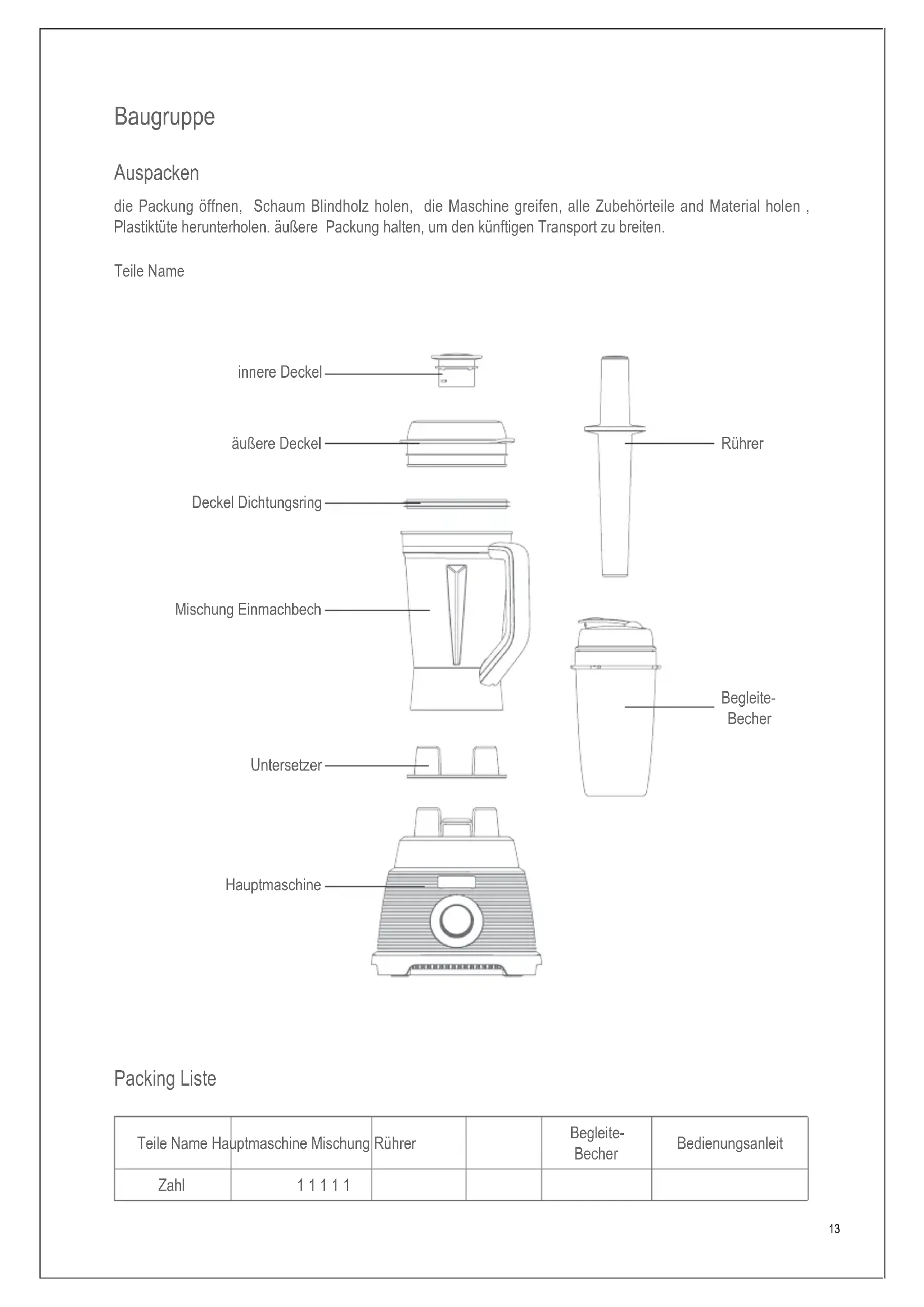 Die Tasse bendet sich nicht in der richtigen Position Entfernen Sie die Tasse und positionieren Sie sie wieder Die Klinge dreht sich nicht Nachdem Sie die gewünschte Funktionaus gewählthaben, drücken Sie den Funktionsknopf . Drücken Sie den Funktionsknopf Das Produkt hat beim Arbeiten einen Geruch Bei der ersten Verwendung des Produkts ist die Einlaufphase des Motors normal. Nach mehrmaliger Anwendung wird der Geruch automatisch beseitigt, wenn es nicht beseitigt werden kann, wenden Sie sich an unseren Kundendienst oder direkt an das Unternehmen, um Wartungspunkte für die Inspektion zu vereinbaren Überladung der gesamten Maschine Überprüfen Sie das Verarbeitungsvolumen und die Verarbeitungszeit nach den Anweisungen Überprüfen Sie, ob die Spannung der auf dem Typenschild angegebenen Spannung entspricht(220V-240V) Anormaler Lärm während der Arbeit Tassen, Kissen usw. sind nicht richtig installiert Schalten Sie die Maschine aus und prüfen Sie, ob der Bechersitz richtig ist. Fremdkörper in der Tasse Schalten Sie die Maschine aus und überprüfen Sie den Becher auf Fremdkörper. Hinweis: Wenn andere Fehler auftreten, sind Spezialwerkzeuge erforderlich, die an der dafür vorgesehenen Servicestelle ausgetauscht werden müssen.20 Produktspezikationen Technische Parameter Maschinenmodell B53 Nennspannung 220V-240V~ Nennfrequenz 50Hz Nennleistung 1000W Maximale Kapazität 1.5L Lärm 88dB(A) Netzkabellänge 1.2m Schaltplan Stromleiste Netzkabel Hauptmotor Bedienfeld Anzeigefeld21 Kochbuch Kochbuch Material Kochmethode Superenergiesuppe Kopfkohl 20g, Erbsensamling 10 g, Ananas 80g, Apfel 100g, Reis Kornreis 1/2 Tasse, gesamte Nüsse 1 Esslöffel Leinsamen 1 Esslöffel, Seetang Knospen 1 Teelöffel, Soja Peptid 1 Esslöffel warmes gekochtes Wasser 700ml Stellen Sie alle Zutaten in die Tasse, schließen Sie den Deckel, wählen Sie und drücken Sie dann den Knopf, herunterfahren nach Abschluss zurückgesetzt. Öffnen Sie den Deckel und füllen Sie ihn in den Behälter, um die Superenergiesuppe zu vervollständigen. Tomatendruck reduzierende Energiesuppe 2 und eine halbe Tomaten (ca. 300 g), 40 g Yam, 40 g Klette, 1 Esslöffel gesamte Nüsse, 400 ml kaltes gekochtes Wasser Stellen Sie alle Zutaten in die Tasse, schließen Sie den Deckel, wählen Sie und drücken Sie dann den Knopf , herunterfahren nach Abschluss zurückgesetzt. Öffnen Sie den Deckel und füllen Sie ihn in den Behälter, um die Tomatendruck reduzierende Energiesuppe zu vervollständigen. Heidelbeere-Apfel- Energiesuppe Purpurkohl 15g, Heidelbeere 60g, Apfel 1,(ca. 170 g), 150 g Trauben (ca. 15 ~ 18), 1 Esslöffel integrierte Nüsse, 400 ml kaltes gekochtes Wasser Stellen Sie alle Zutaten in die Tasse, schließen Sie den Deckel, wählen Sie und drücken Sie dann den Knopf , herunterfahren nach Abschluss zurückgesetzt. Öffnen Sie den Deckel und füllen Sie ihn in den Behälter, um die Heidelbeer-Apfel-Energiesuppe zu vervollständigen. Sellerie- Energiesuppe Erbsensämling 10 g, Sellerie 60 g, Apfel 1 (ca. 170 g), Ananas 100 g, integrierte Nüsse 1 Esslöffel, kalt gekochtes Wasser 500 ml Stellen Sie alle Zutaten in die Tasse, schließen Sie den Deckel, wählen Sie und drücken Sie dann den Knopf, herunterfahren nach Abschluss zurückgesetzt. Öffnen Sie den Deckel und füllen Sie ihn in den Behälter,um die Sellerie-Energiesuppe zu vervollständigen. Karotte- Energiesuppe Erbsensämling 10g, Möhre 50g, Apfel 1 (ca. 170 g), Ananas 150 g, integrierte Nuss 1 Esslöffel, kalt gekochtes Wasser 700 ml Stellen Sie alle Zutaten in die Tasse, schließen Sie den Deckel, wählen Sie und drücken Sie dann den Knopf , herunterfahren nach Abschluss zurückgesetzt. Öffnen Sie den Deckel und füllen Sie ihn in den Behälter, um die Karotte-Energiesuppe zu vervollständigen.22 Papaya-Milch Papaya 250g, frische Milch 360ml, Eiswürfel 5-6 Stellen Sie alle Zutaten in den Kochtopf, schließen Sie den Deckel, wählen Sie und drücken Sie die Taste, herunterfahren nach Abschluss zurückgesetzt. Öffnen Sie den Deckel und füllen Sie ihn in den Behälter, um die Papaya-Milch zu vervollständigen. Karotte- Moosbeeren-Saft Karotte 110g,Ananas 250g, trockene Moosbeeren 1 Esslöffel, Eiswürfel 5-6, kalt gekochtes Wasser 500 ml Stellen Sie alle Zutaten in den Kochtopf, schließen Sie den Deckel, wählen Sie und drücken Sie die Taste, herunterfahren nach Abschluss zurückgesetzt. Öffnen Sie den Deckel und füllen Sie ihn in den Behälter, um der Karotte-Moosbeeren-Saft zu vervollständigen. Apfelsaft 2 Äpfel, kalt gekochtes Wasser 400ml, Zitronensaft 30ml Stellen Sie kalt gekochtes Wasser 400ml, Zitronensaft in den Becher. Die Äpfel waschen, schälen und entkernen,dann in den Becher stellen, schließen Sie den Deckel, wählen Sie und drücken Sie die Taste, herunterfahren nach Abschluss zurückgesetzt. Öffnen Sie den Deckel und füllen Sie ihn in den Behälter, um der Apfelsaft zu vervollständigen. Tomatensaft