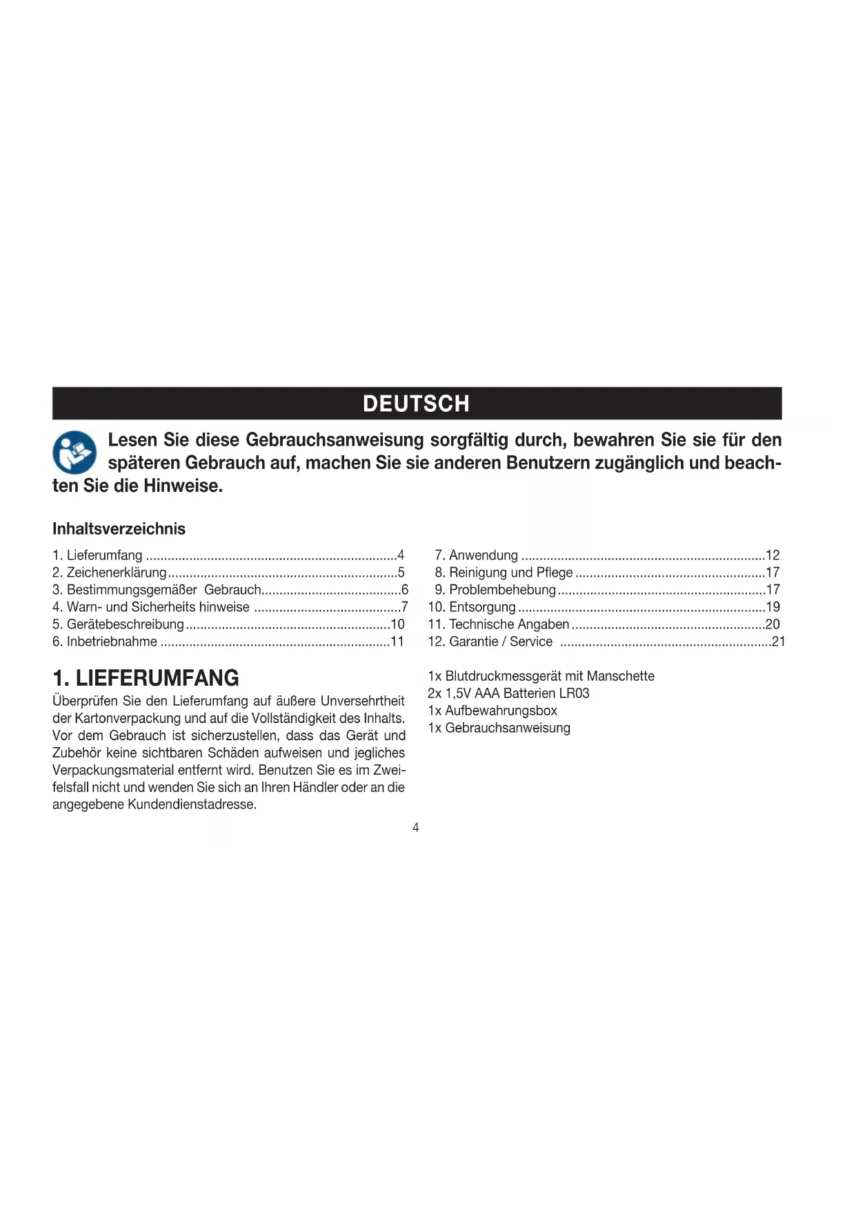 Überprüfen Sie den Lieferumfang auf äußere Unversehrtheit der Kartonverpackung und auf die Vollständigkeit des Inhalts. Vor dem Gebrauch ist sicherzustellen, dass das Gerät und Zubehör keine sichtbaren Schäden aufweisen und jegliches Verpackungsmaterial entfernt wird. Benutzen Sie es im Zwei- felsfall nicht und wenden Sie sich an Ihren Händler oder an die angegebene Kundendienstadresse. 1x Blutdruckmessgerät mit Manschette 2x 1,5V AAA Batterien LR03 1x Aufbewahrungsbox 1x Gebrauchsanweisung