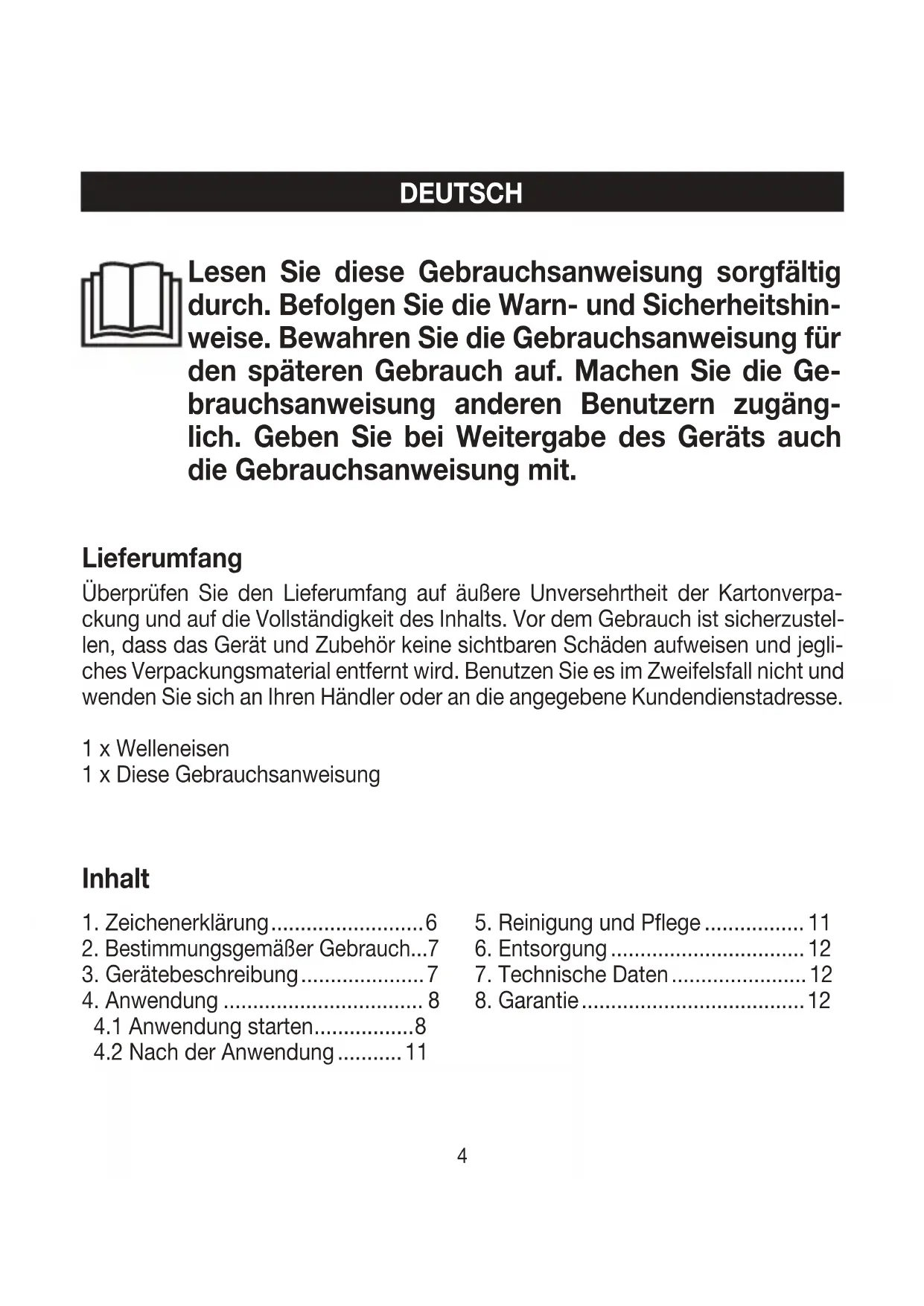 DEUTSCH Lieferumfang Überprüfen Sie den Lieferumfang auf äußere Unversehrtheit der Kartonverpa- ckung und auf die Vollständigkeit des Inhalts. Vor dem Gebrauch ist sicherzustel- len, dass das Gerät und Zubehör keine sichtbaren Schäden aufweisen und jegli- ches Verpackungsmaterial entfernt wird. Benutzen Sie es im Zweifelsfall nicht und wenden Sie sich an Ihren Händler oder an die angegebene Kundendienstadresse. 1 x Welleneisen 1 x Diese Gebrauchsanweisung Lesen Sie diese Gebrauchsanweisung sorgfältig durch. Befolgen Sie die Warn- und Sicherheitshin