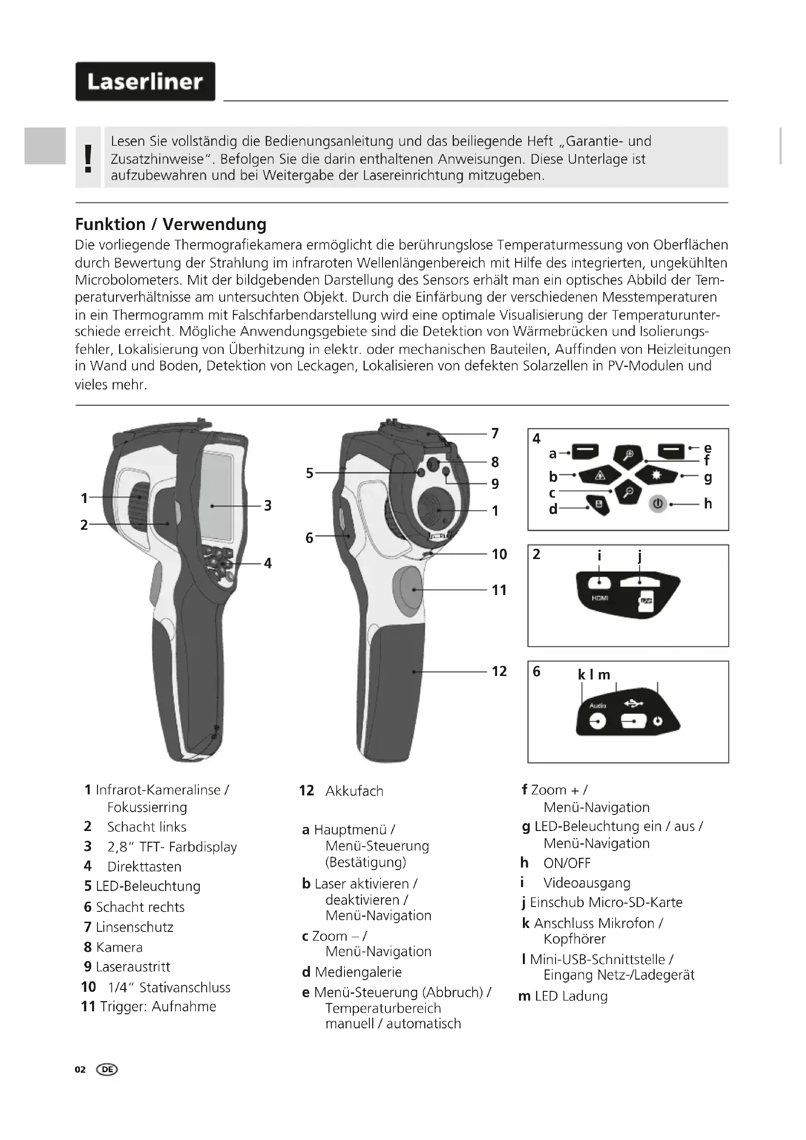 Videoausgang j Einschub Micro-SD-Karte k Anschluss Mikrofon / Kopfhörer l Mini-USB-Schnittstelle / Eingang Netz-/Ladegerät m LED LadungThermoCamera Compact Plus / Pro