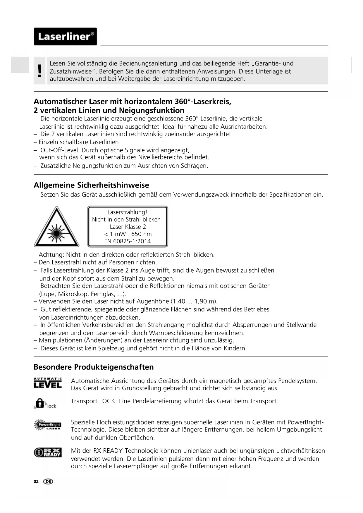 Automatischer Laser mit horizontalem 360°-Laserkreis, 2 vertikalen Linien und Neigungsfunktion – Die horizontale Laserlinie erzeugt eine geschlossene 360° Laserlinie, die vertikale Laserlinie ist rechtwinklig dazu ausgerichtet. Ideal für nahezu alle Ausrichtarbeiten. – Die 2 vertikalen Laserlinien sind rechtwinklig zueinander ausgerichtet. – Einzeln schaltbare Laserlinien – Out-Off-Level: Durch optische Signale wird angezeigt, wenn sich das Gerät außerhalb des Nivellierbereichs bendet. – Zusätzliche Neigungsfunktion zum Ausrichten von Schrägen. Allgemeine Sicherheitshinweise Laserstrahlung! Nicht in den Strahl blicken! Laser Klasse 2 < 1 mW · 650 nm EN 60825-1:2014 – Achtung: Nicht in den direkten oder reektierten Strahl blicken. – Den Laserstrahl nicht auf Personen richten. – Falls Laserstrahlung der Klasse 2 ins Auge trifft, sind die Augen bewusst zu schließen und der Kopf sofort aus dem Strahl zu bewegen. – Betrachten Sie den Laserstrahl oder die Reektionen niemals mit optischen Geräten (Lupe, Mikroskop, Fernglas, ...). – Verwenden Sie den Laser nicht auf Augenhöhe (1,40 ... 1,90 m). – Gut reektierende, spiegelnde oder glänzende Flächen sind während des Betriebes von Lasereinrichtungen abzudecken. – In öffentlichen Verkehrsbereichen den Strahlengang möglichst durch Absperrungen und Stellwände begrenzen und den Laserbereich durch Warnbeschilderung kennzeichnen. – Manipulationen (Änderungen) an der Lasereinrichtung sind unzulässig. – Dieses Gerät ist kein Spielzeug und gehört nicht in die Hände von Kindern. – Setzen Sie das Gerät ausschließlich gemäß dem Verwendungszweck innerhalb der Spezikationen ein. Besondere Produkteigenschaften Automatische Ausrichtung des Gerätes durch ein magnetisch gedämpftes Pendelsystem. Das Gerät wird in Grundstellung gebracht und richtet sich selbständig aus. Transport LOCK: Eine Pendelarretierung schützt das Gerät beim Transport. Spezielle Hochleistungsdioden erzeugen superhelle Laserlinien in Geräten mit PowerBright- Technologie. Diese bleiben sichtbar auf längere Entfernungen, bei hellem Umgebungslicht und auf dunklen Oberflächen. Mit der RX-READY-Technologie können Linienlaser auch bei ungünstigen Lichtverhältnissen verwendet werden. Die Laserlinien pulsieren dann mit einer hohen Frequenz und werden durch spezielle Laserempfänger auf große Entfernungen erkannt. DESuperLine-Laser 360°