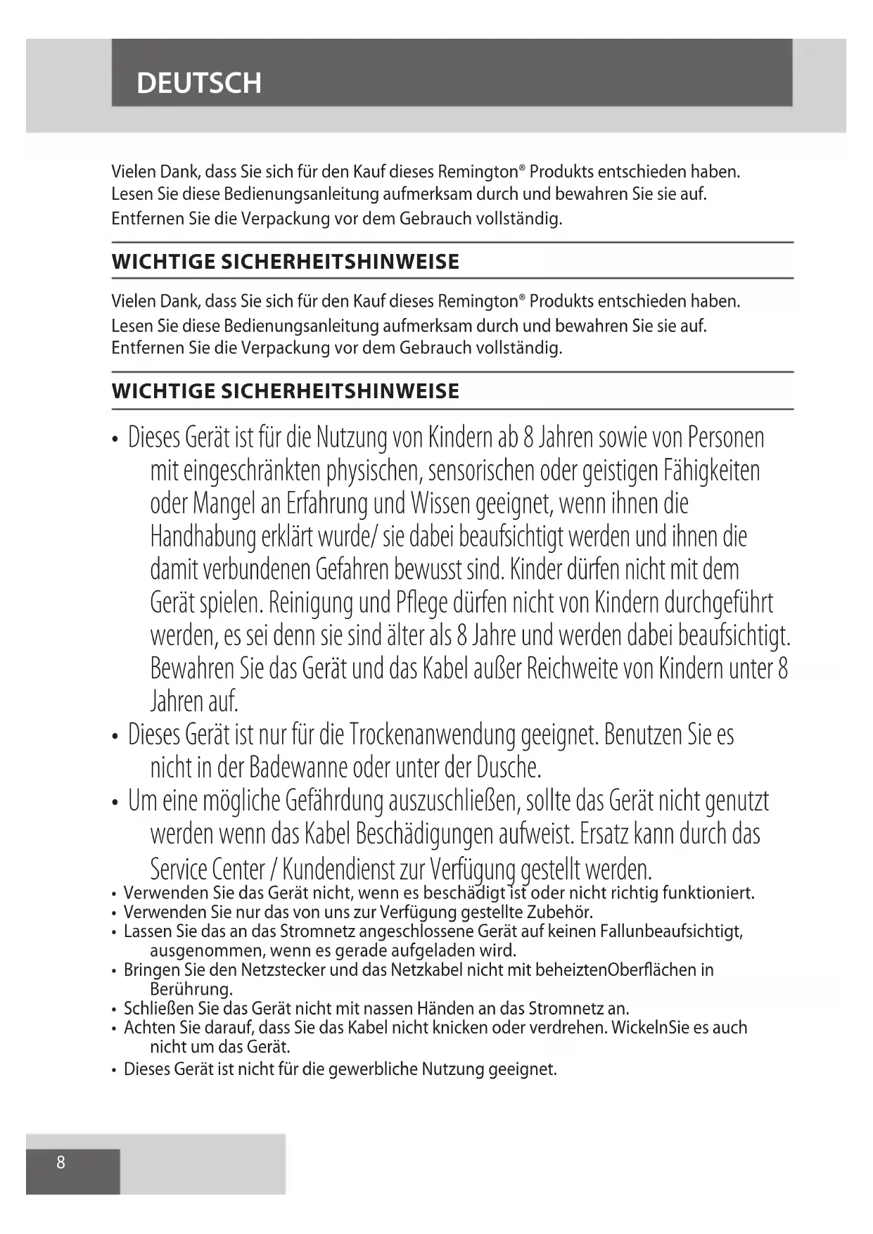 AE8 Vielen Dank, dass Sie sich für den Kauf dieses Remington® Produkts entschieden haben. Lesen Sie diese Bedienungsanleitung aufmerksam durch und bewahren Sie sie auf. Entfernen Sie die Verpackung vor dem Gebrauch vollständig. WICHTIGE SICHERHEITSHINWEISE Vielen Dank, dass Sie sich für den Kauf dieses Remington® Produkts entschieden haben. Lesen Sie diese Bedienungsanleitung aufmerksam durch und bewahren Sie sie auf. Entfernen Sie die Verpackung vor dem Gebrauch vollständig. WICHTIGE SICHERHEITSHINWEISE