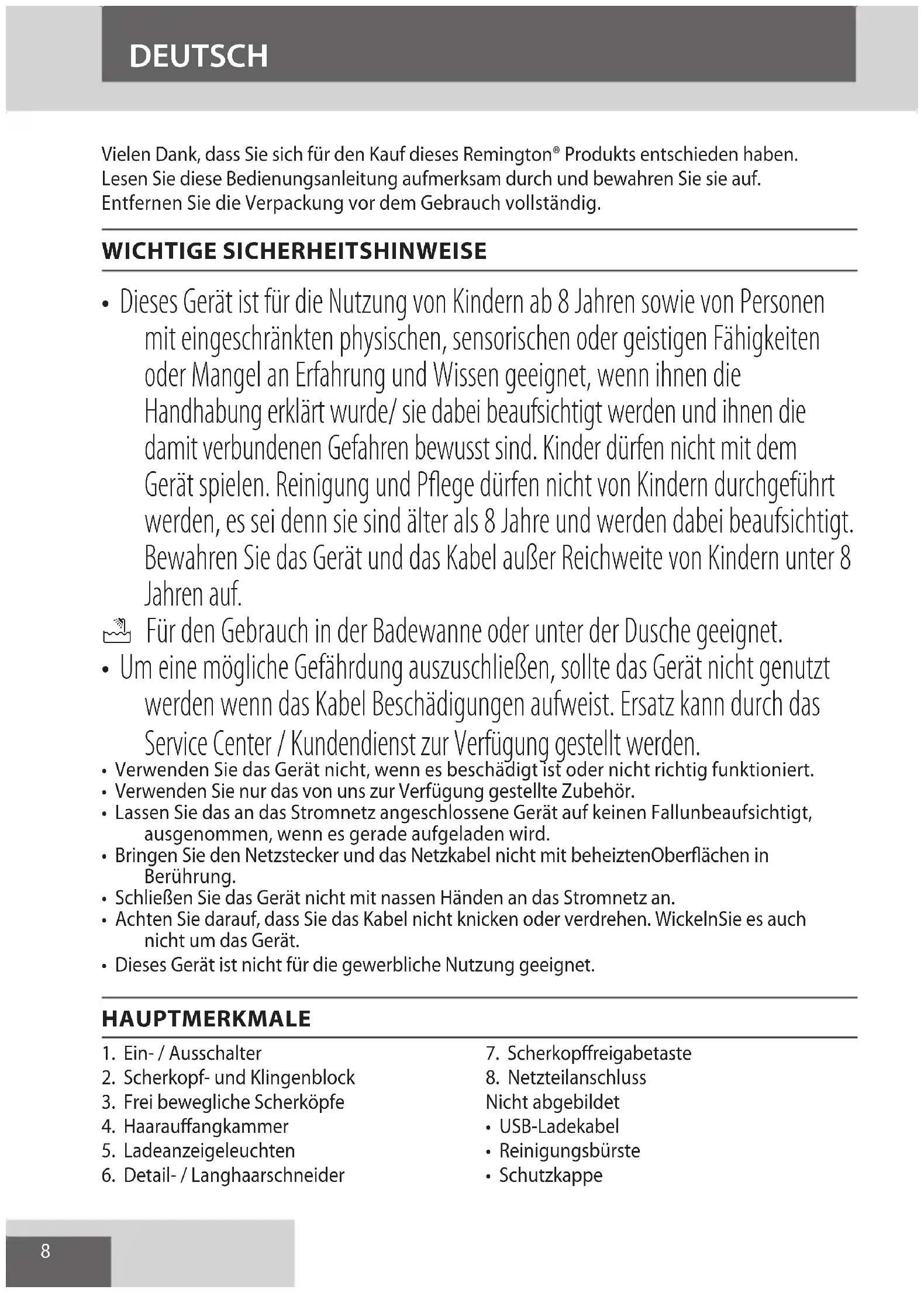 AE8 DEUTSCH Vielen Dank, dass Sie sich für den Kauf dieses Remington® Produkts entschieden haben. Lesen Sie diese Bedienungsanleitung aufmerksam durch und bewahren Sie sie auf. Entfernen Sie die Verpackung vor dem Gebrauch vollständig. WICHTIGE SICHERHEITSHINWEISE