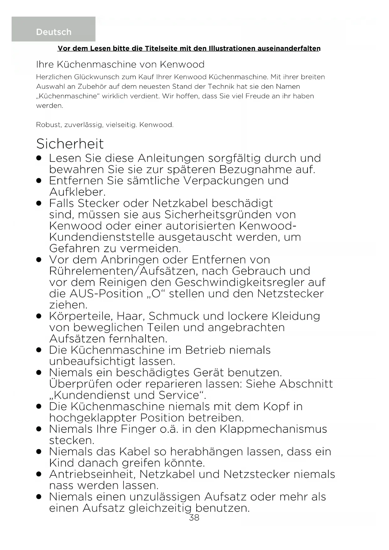 Niemals einen unzulässigen Aufsatz oder mehr als einen Aufsatz gleichzeitig benutzen. Deutsch Ihre Küchenmaschine von Kenwood Herzlichen Glückwunsch zum Kauf Ihrer Kenwood Küchenmaschine. Mit ihrer breiten Auswahl an Zubehör auf dem neuesten Stand der Technik hat sie den Namen „Küchenmaschine“ wirklich verdient. Wir hoffen, dass Sie viel Freude an ihr haben werden. Robust, zuverlässig, vielseitig. Kenwood. Vor dem Lesen bitte die Titelseite mit den Illustrationen auseinanderfalten 38O Niemals die in der Höchstmengen-Tabelle angegebenen Mengen überschreiten.