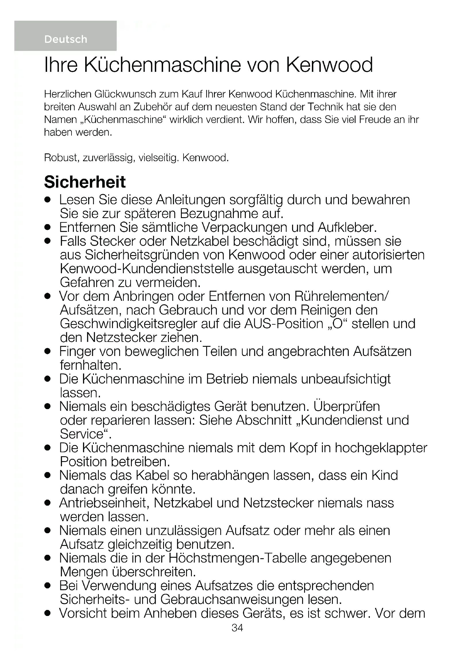 Vorsicht beim Anheben dieses Geräts, es ist schwer. Vor dem Ihre Küchenmaschine von Kenwood Herzlichen Glückwunsch zum Kauf Ihrer Kenwood Küchenmaschine. Mit ihrer breiten Auswahl an Zubehör auf dem neuesten Stand der Technik hat sie den Namen „Küchenmaschine“ wirklich verdient. Wir hoffen, dass Sie viel Freude an ihr haben werden. Robust, zuverlässig, vielseitig. Kenwood. Deutsch35 Anheben sicherstellen, dass der Maschinenkopf nach unten geklappt sowie verriegelt ist und Schüssel, Rührelemente, Anschlussdeckel und Kabel fest sitzen bzw. gut verstaut sind.