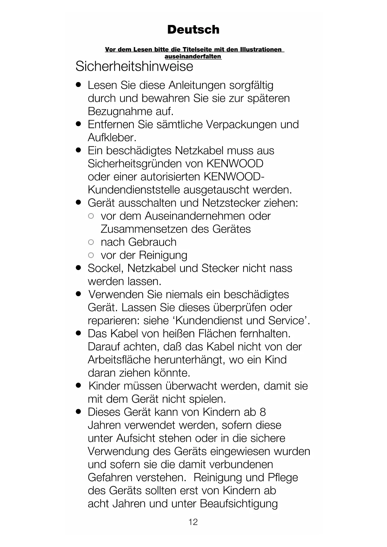 Dieses Gerät kann von Kindern ab 8 Jahren verwendet werden, sofern diese unter Aufsicht stehen oder in die sichere Verwendung des Geräts eingewiesen wurden und sofern sie die damit verbundenen Gefahren verstehen. Reinigung und Pflege des Geräts sollten erst von Kindern ab acht Jahren und unter Beaufsichtigung Deutsch Vor dem Lesen bitte die Titelseite mit den Illustrationen auseinanderfalten13 14 vorgenommen werden. Gerät und Netzkabel müssen für Kinder unter 8 Jahren unzugänglich sein.
