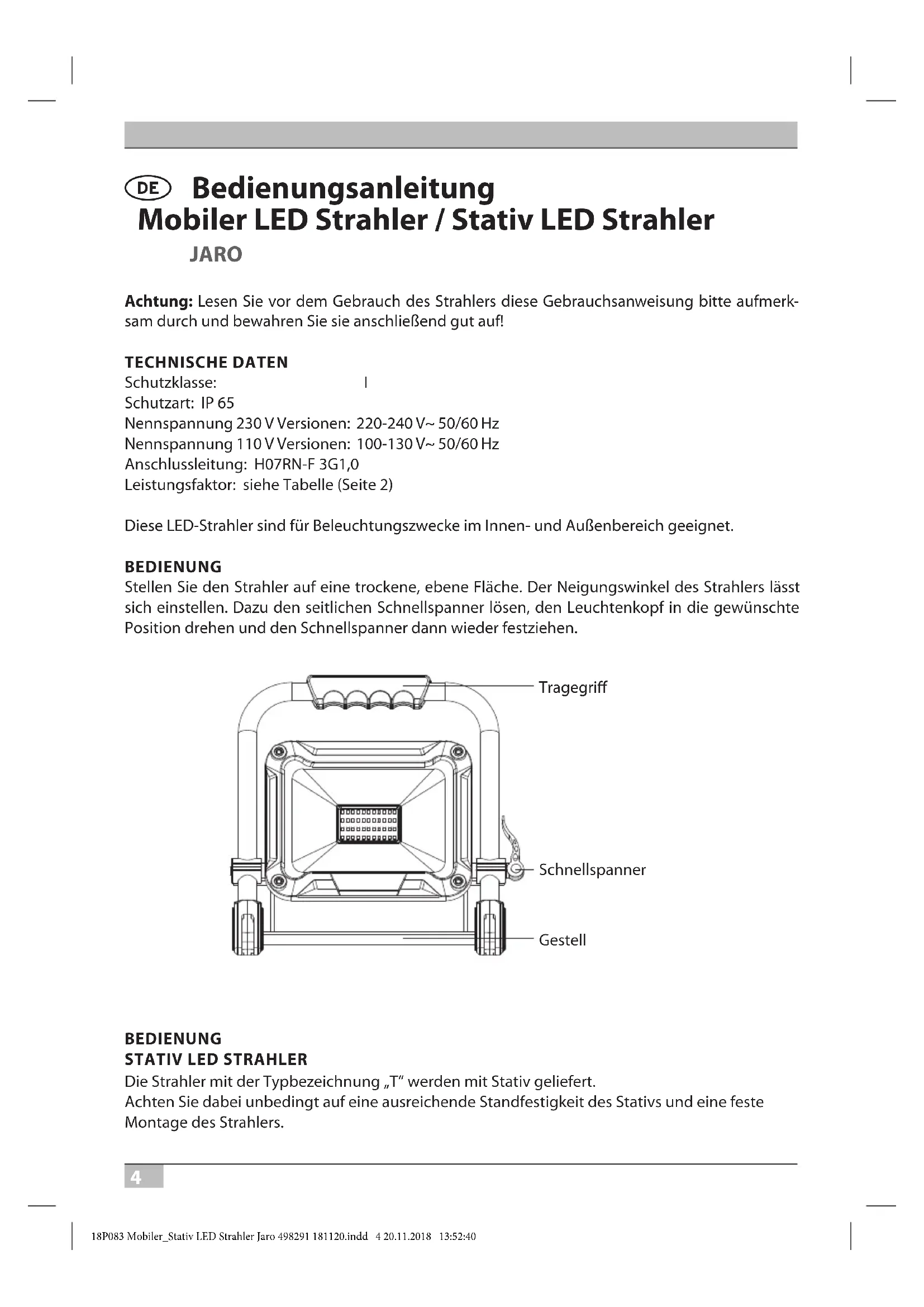 4,68 1400 402 x 204 x 340 18P083 Mobiler_Stativ LED Strahler Jaro 498291 181120.indd 3 20.11.2018 13:52:394 A Bedienungsanleitung Mobiler LED Strahler / Stativ LED Strahler JARO Achtung: Lesen Sie vor dem Gebrauch des Strahlers diese Gebrauchsanweisung bitte aufmerk- sam durch und bewahren Sie sie anschließend gut auf! TECHNISCHE DATEN Schutzklasse: I Schutzart: IP 65 Nennspannung 230 V Versionen: 220-240 V~ 50/60 Hz Nennspannung 110 V Versionen: 100-130 V~ 50/60 Hz Anschlussleitung: H07RN-F 3G1,0 Leistungsfaktor: siehe Tabelle (Seite 2) Diese LED-Strahler sind für Beleuchtungszwecke im Innen- und Außenbereich geeignet. BEDIENUNG Stellen Sie den Strahler auf eine trockene, ebene Fläche. Der Neigungswinkel des Strahlers lässt sich einstellen. Dazu den seitlichen Schnellspanner lösen, den Leuchtenkopf in die gewünschte Position drehen und den Schnellspanner dann wieder festziehen. Schnellspanner Gestell Tragegri BEDIENUNG