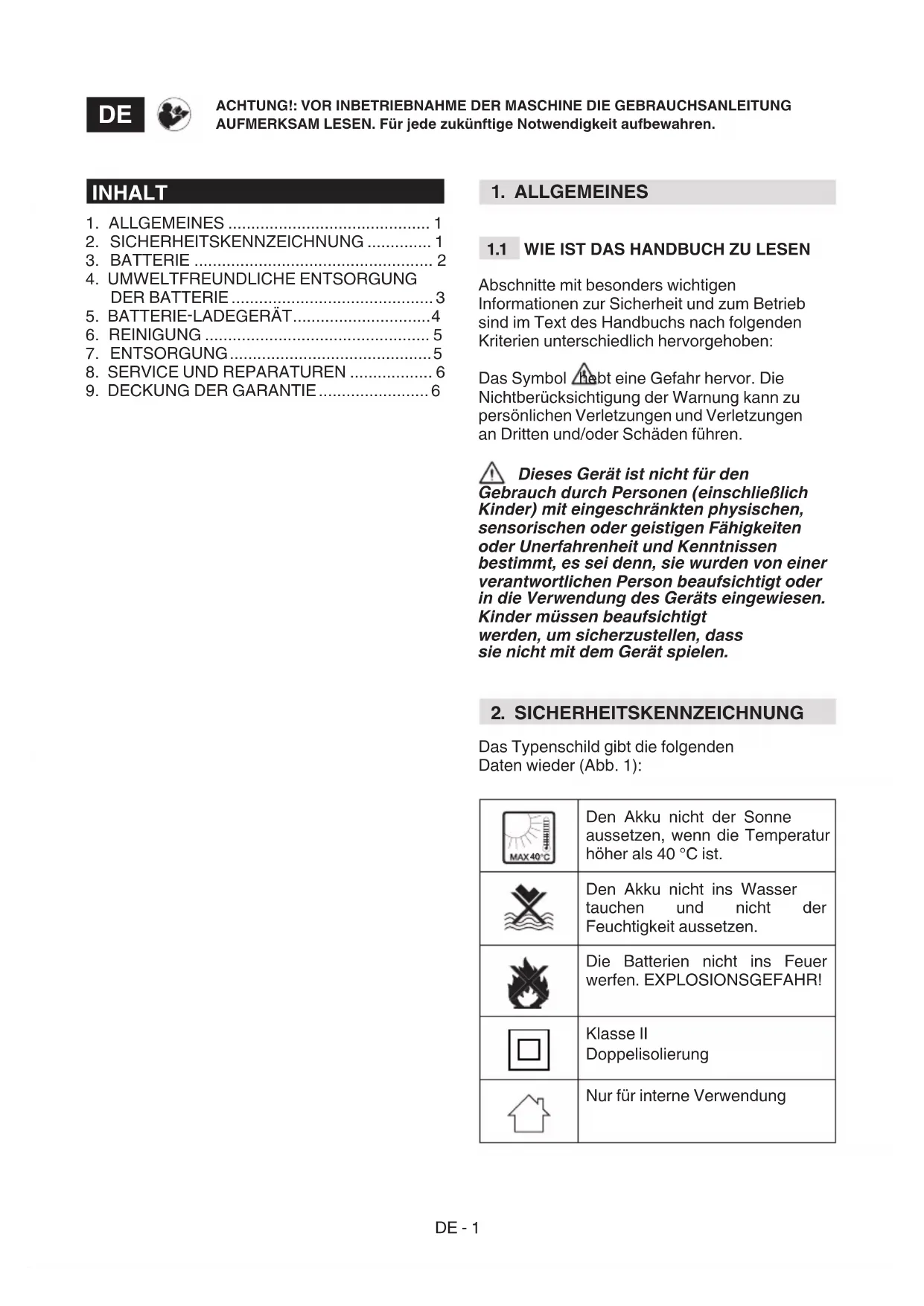Den Akku nicht der Sonne aussetzen, wenn die Temperatur höher als 40 °C ist. Den Akku nicht ins Wasser tauchen und nicht der Feuchtigkeit aussetzen. Die Batterien nicht ins Feuer werfen. EXPLOSIONSGEFAHR! Klasse II Doppelisolierung Nur für interne Verwendung ACHTUNG!: VOR INBETRIEBNAHME DER MASCHINE DIE GEBRAUCHSANLEITUNG AUFMERKSAM LESEN. Für jede zukünftige Notwendigkeit aufbewahren.
