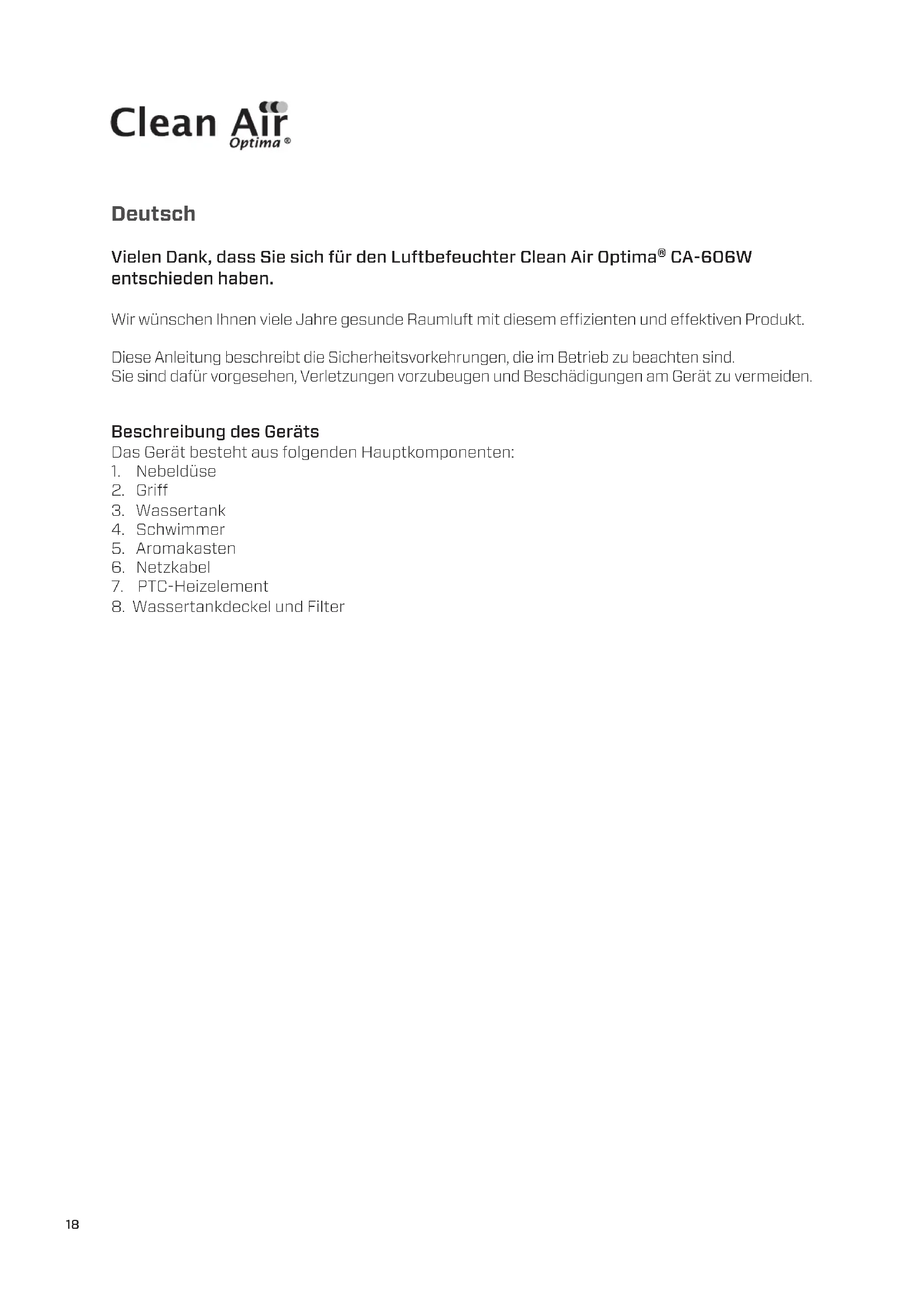 Clean Air Optima International B.V. | David Ricardostraat 9-7 / 9-9 | 7559 SH Hengelo (ov) The Netherlands | Phone: +31 (0) 74 - 2670145 Clean Air Optima Germany GmbH | Enschedestraße 14 | 48529 Nordhorn | Germany Phone: +49 (0) 5921 879-121 E-mail: info@cleanairoptima.com Internet: www.cleanairoptima.com18 Deutsch Vielen Dank, dass Sie sich für den Luftbefeuchter Clean Air Optima® CA-606W entschieden haben. Wir wünschen Ihnen viele Jahre gesunde Raumluft mit diesem ezienten und eektiven Produkt. Diese Anleitung beschreibt die Sicherheitsvorkehrungen, die im Betrieb zu beachten sind. Sie sind dafür vorgesehen, Verletzungen vorzubeugen und Beschädigungen am Gerät zu vermeiden. Beschreibung des Geräts Das Gerät besteht aus folgenden Hauptkomponenten: