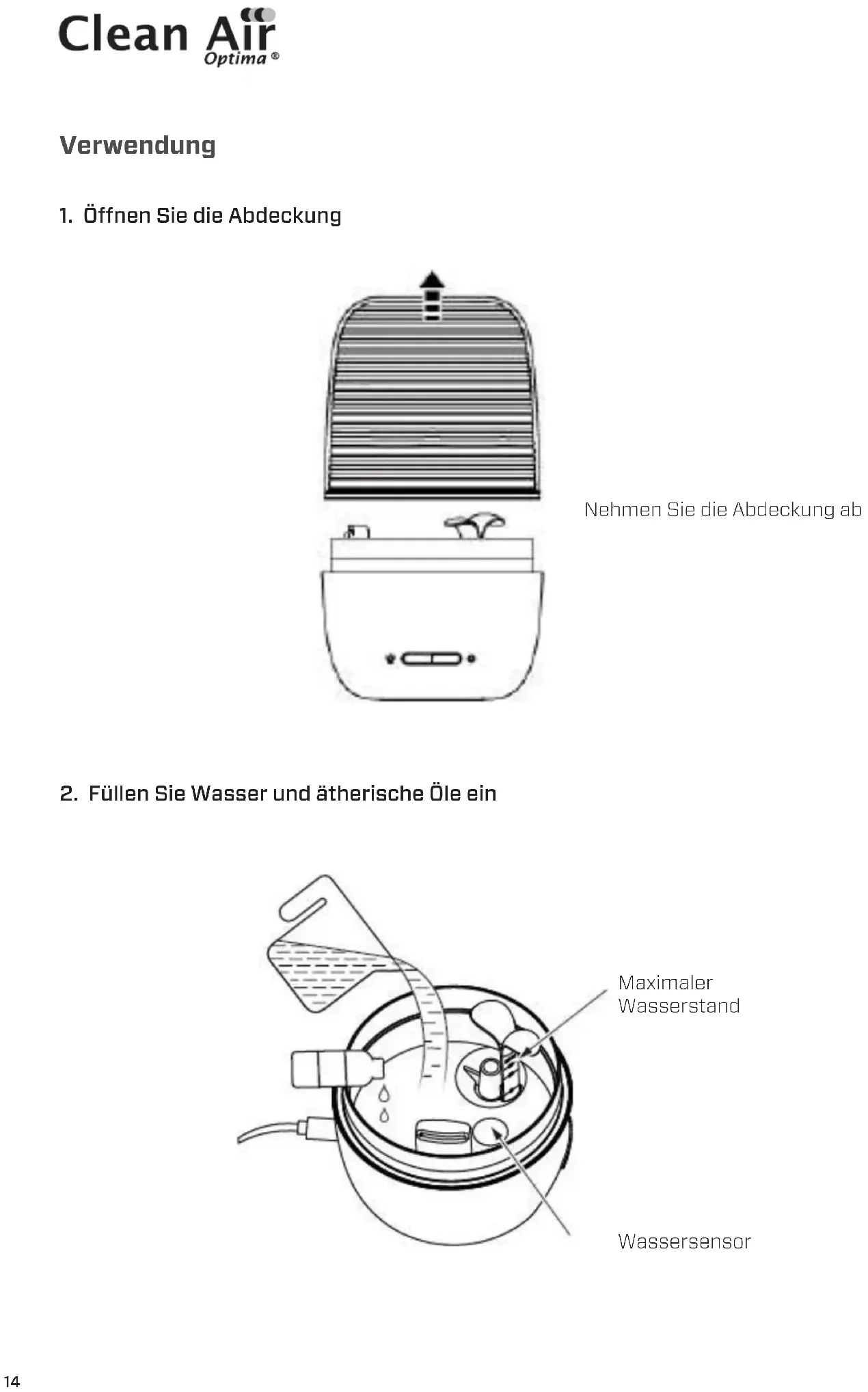undder Umstände bei, unter denen diese Probleme aufgetreten sind. Der Clean Air Optima Aroma Diuser Ambiente AD-301 wird vor Verlassen des Werks strengen Prüfverfahren unterzogen. Wenn das Produkt innerhalb von zwei Jahren ab Kaufdatum nicht den Spezifikationen entspricht, hat der Käufer aufgrund von Fertigungsmängeln das Recht auf kostenlose Reparatur oder Ersatz von Teilen gegen Vorlage dieser Garantie (vorausgesetzt, dass die Fehlfunktion oder Beschädigung des Geräts und/oder der Teile unter normalen Betriebsbedingungen aufgetreten ist). Die Garantie gilt: Für alle in Material und Verarbeitung fehlerhaften Teile. Wie lange: zwei Jahre ab Kaufdatum.Das werden wir tun: Fehlerhafte Teile reparieren oder ersetzen. Sonstige Bedingungen Die Bestimmungen dieser Garantie ersetzen alle anderen schriftlichen Garantien, obausdrücklich oder stillschweigend, schriftlich oder mündlich, einschließlich der Garantie der Marktgängigkeit oder Eignung für einen bestimmten Zweck. Die maximale Haftung des Herstellers überschreitet nicht den tatsächlichen Kaufpreis, den Sie für das Produkt gezahlt haben. In keinem Fall haftet der Hersteller für besondere, zufällige, Folge- oder indirekte Schäden. Diese Garantie erstreckt sich nicht auf einen Mangel, der nach unserem alleinigen Ermessen auf unsachgemäße oder unangemessene Verwendung oder Wartung, fehlerhafte Montage, Unfall oder Naturkatastrophen, unsachgemäße Verpackung oder unbefugte Manipulationen, Änderungen oder Modifikationen zurückzuführen ist. Diese Garantie erlischt, wenn der Aufkleber mit der Seriennummer entfernt oder entstellt wurde.20 Vielen Dank für das Lesen! Äußern Sie Ihre Meinung über den Clean Air Optima Aroma-Diuser Ambiente AD-301 auf: www.cleanairoptima.com Häufig gestellte Fragen zum AD-301 finden Sie auf: www.cleanairoptima.com, suchen Sie dort nach AD-301. Laden Sie die PDF-Bedienungsanleitung herunter unter: www.cleanairoptima.com/info/manuals Alle Videos mit Produktanimationen von Clean Air Optima finden Sie auf: www.youtube.com Clean Air Optima International B.V. | David Ricardostraat 9-7 / 9-9 | 7559 SH Hengelo (ov) Niederlande | Telefon: +31 (0) 74 - 2670145 Clean Air Optima Germany GmbH | Enschedestraße 14 | 48529 Nordhorn | Deutschland Telefon: +49 (0)5921 879-121 E-Mail: info@cleanairoptima.com Internet: www.cleanairoptima.com21 Nederlands Bedankt voor de aankoop van de Clean Air Optima Diuser Ambiente AD-301. Wij wensen u vele jaren gezonde binnenlucht gecombineerd met aromatherapie toe, dankzij diteciënte en doeltreende product. Voor de juiste werking van dit elektrische apparaat is het belangrijk dat alle veiligheidsvoorschriften tijdens het gebruik in acht worden genomen. Deze instructies beschrijven de veiligheidsvoorschriften die tijdens het gebruik moeten worden nageleefd. Zezijn bedoeld om verwondingen en schade aan het apparaat te voorkomen. Beschrijving van het apparaat Het apparaat bestaat uit de volgende hoofdonderdelen: