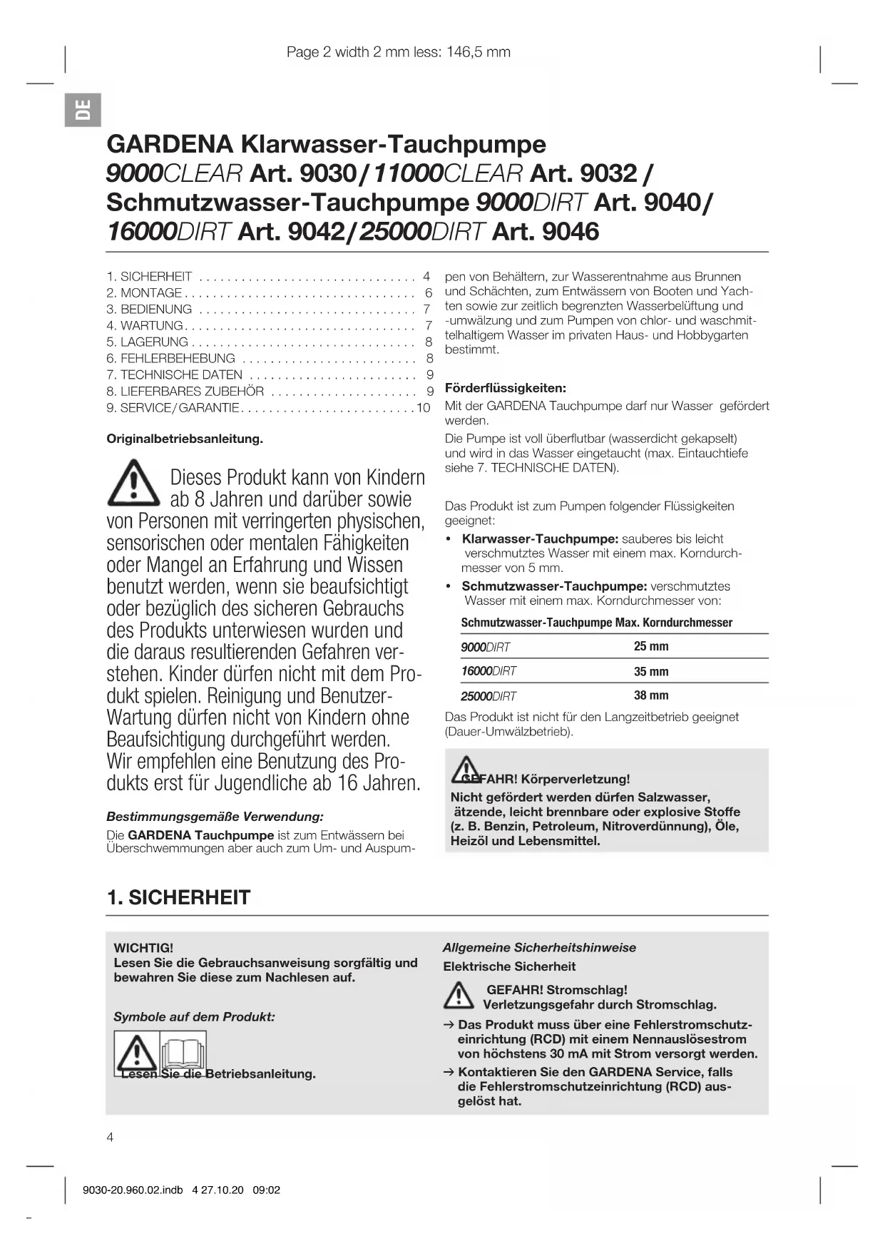 WICHTIG! Lesen Sie die Gebrauchsanweisung sorgfältig und bewahren Sie diese zum Nachlesen auf. Symbole auf dem Produkt: Lesen Sie die Betriebsanleitung. Allgemeine Sicherheitshinweise Elektrische Sicherheit GEFAHR! Stromschlag! Verletzungsgefahr durch Stromschlag. v Das Produkt muss über eine Fehlerstromschutz- einrichtung (RCD) mit einem Nennauslösestrom von höchstens 30 mA mit Strom versorgt werden. v Kontaktieren Sie den GARDENA Service, falls die Fehlerstromschutzeinrichtung (RCD) aus- gelöst hat. GARDENA Klarwasser-Tauchpumpe 9000CLEAR Art. 9030 / 11000CLEAR Art. 9032 / Schmutzwasser-Tauchpumpe 9000DIRT Art. 9040 / 16000DIRT Art. 9042 / 25000DIRT Art. 9046 Page 2 width 2 mm less: 146,5 mm