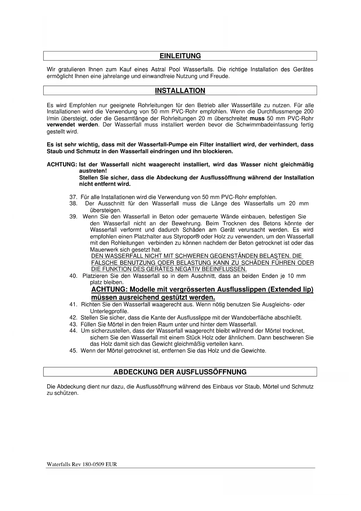 Wir gratulieren Ihnen zum Kauf eines Astral Pool Wasserfalls. Die richtige Installation des Gerätes ermöglicht Ihnen eine jahrelange und einwandfrei Nutzung und Freude.