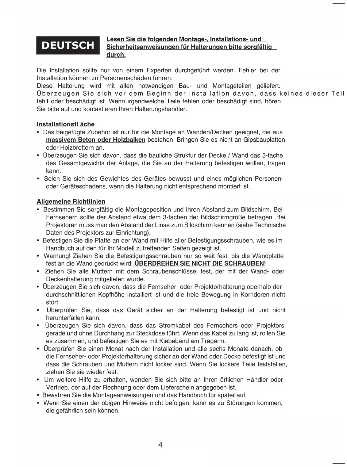 - All logos brands and product names are trademarks or registered trademarks of their respective holders and are hereby recognized as such.4 Lesen Sie die folgenden Montage-, Installations- und Sicherheitsanweisungen für Halterungen bitte sorgfältig durch. Die Installation sollte nur von einem Experten durchgeführt werden. Fehler bei der Installation können zu Personenschäden führen. Diese Halterung wird mit allen notwendigen Bau- und Montageteilen geliefert. Überzeugen Sie sich vor dem Beginn der Installation davon, dass keines dieser Teile fehlt oder beschädigt ist. Wenn irgendwelche Teile fehlen oder beschädigt sind, hören Sie bitte auf und kontaktieren Ihren Halterungshändler. Installationsfl äche