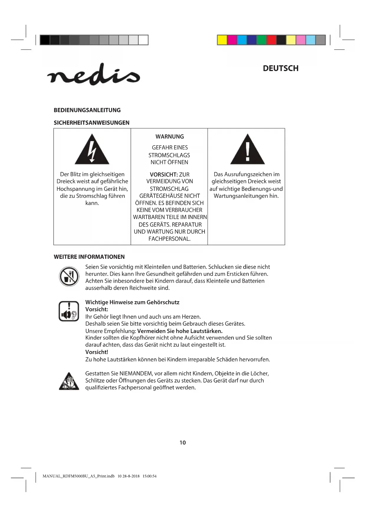 - Wenn die Lautstärke des Geräts nachlässt oder der Klang verzerrt wird, müssen die Batterien ersetzt werden. MANUAL_RDFM5000BU_A5_Print.indb 15 28-8-2018 15:00:5516 DEUTSCH Vorsicht mit Batterien