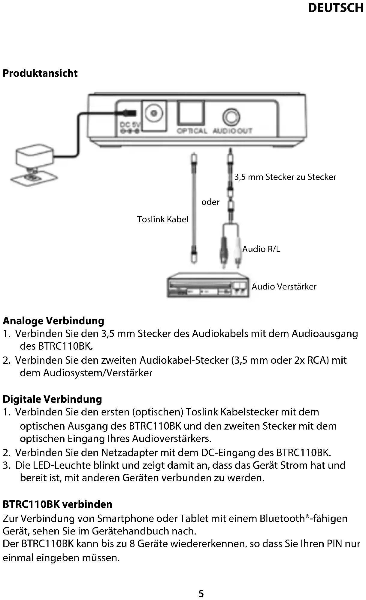 LED-Anzeige Anzeige Bedeutung Beschreibung Blinkt alle 5Sekunden Verbindungsaufbau Sucht das Gerät im Pairing- Modus/wartet auf eine Verbindung Leuchtet konstant Verbunden BTRC110BK und Gerät sind verbunden Fehlerbehebung Wenn Sie keinen Sound aus Ihren Lautsprechern hören, überprüfen Sie folgendes: - prüfen Sie, ob der BTRC110BK Strom hat; - prüfen Sie, ob das Audiokabel korrekt mit dem BTRC110BK verbunden ist; - prüfen Sie, ob die Musikquelle des Verstärkers richtig funktioniert; - prüfen Sie, ob die Lautstärke hoch genug eingestellt ist; - prüfen Sie, ob die Geräte mindestens 10Meter vom Audio-Transmitter entfernt stehen; - prüfen Sie, ob die Bluetooth®-Funktion auf Ihrem Gerät aktiviert ist; - prüfen Sie, ob Ihr Gerät Musik abspielt.DEUTSCH
