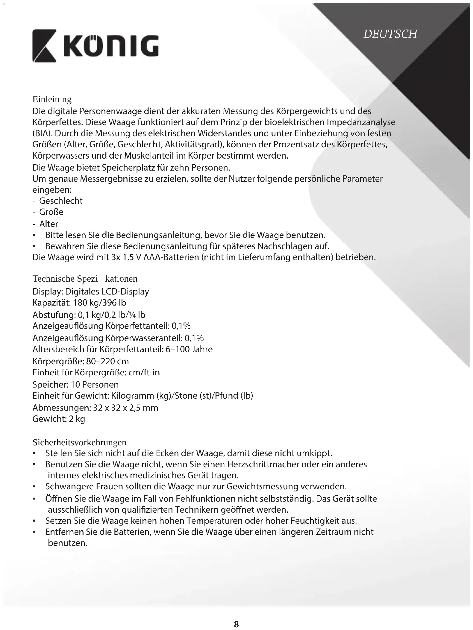 - Bewahren Sie diese Bedienungsanleitung für späteres Nachschlagen auf. Die Waage wird mit 3x 1,5 V AAA-Batterien (nicht im Lieferumfang enthalten) betrieben. Technische Spezikationen Display: Digitales LCD-Display Kapazität: 180 kg/396 lb Abstufung: 0,1 kg/0,2 lb/¼ lb Anzeigeauösung Körperfettanteil: 0,1% Anzeigeauösung Körperwasseranteil: 0,1% Altersbereich für Körperfettanteil: 6–100 Jahre Körpergröße: 80–220 cm Einheit für Körpergröße: cm/ft-in Speicher: 10 Personen Einheit für Gewicht: Kilogramm (kg)/Stone (st)/Pfund (lb) Abmessungen: 32 x 32 x 2,5 mm Gewicht: 2 kg Sicherheitsvorkehrungen