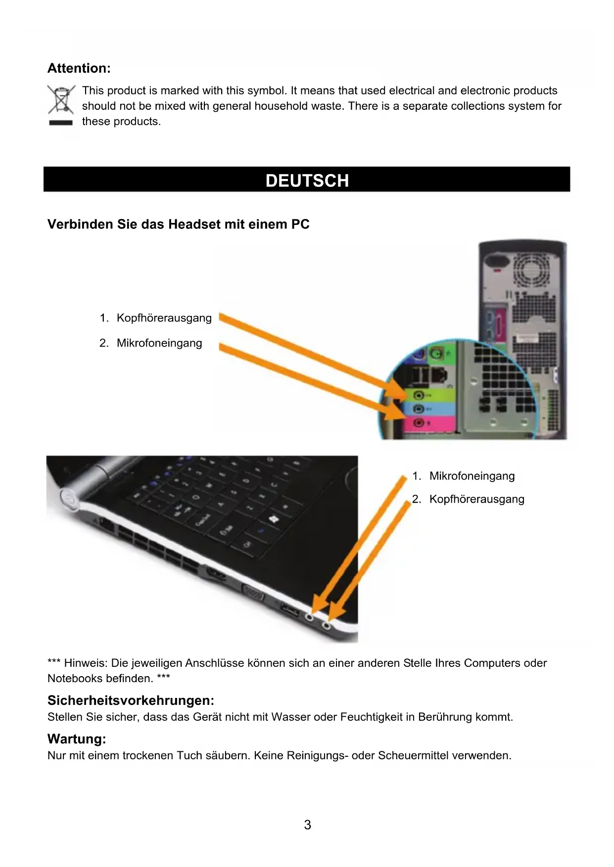 *** Hinweis: Die jeweiligen Anschlüsse können sich an einer anderen Stelle Ihres Computers oder Notebooks befinden. *** Sicherheitsvorkehrungen: Stellen Sie sicher, dass das Gerät nicht mit Wasser oder Feuchtigkeit in Berührung kommt. Wartung: Nur mit einem trockenen Tuch säubern. Keine Reinigungs- oder Scheuermittel verwenden.4 Garantie: Es kann keine Garantie oder Haftung für irgendwelche Änderungen oder Modifikationen des Produkts oder für Schäden übernommen werden, die aufgrund einer nicht ordnungsgemäßen Anwendung des Produkts entstanden sind. Allgemeines: - Design und technische Daten können ohne vorherige Ankündigung geändert werden. - Alle Logos, Marken und Produktnamen sind Marken oder eingetragene Marken ihrer jeweiligen Eigentümer und werden hiermit als solche anerkannt. - Diese Bedienungsanleitung wurde sorgfältig verfasst. Dennoch können daraus keine Rechte und Pflichten hergeleitet werden. König Electronic haftet nicht für mögliche Fehler in dieser Bedienungsanleitung oder deren Folgen. - Bitte bewahren Sie Bedienungsanleitung und Verpackung für spätere Verwendung auf. Achtung: Dieses Produkt ist mit diesem Symbol gekennzeichnet. Es bedeutet, dass die ausgedienten elektrischen und elektronischen Produkte nicht mit dem allgemeinen Haushaltsmüll entsorgt werden dürfen. Für diese Produkte stehen gesonderte Sammelsysteme zur Verfügung.
