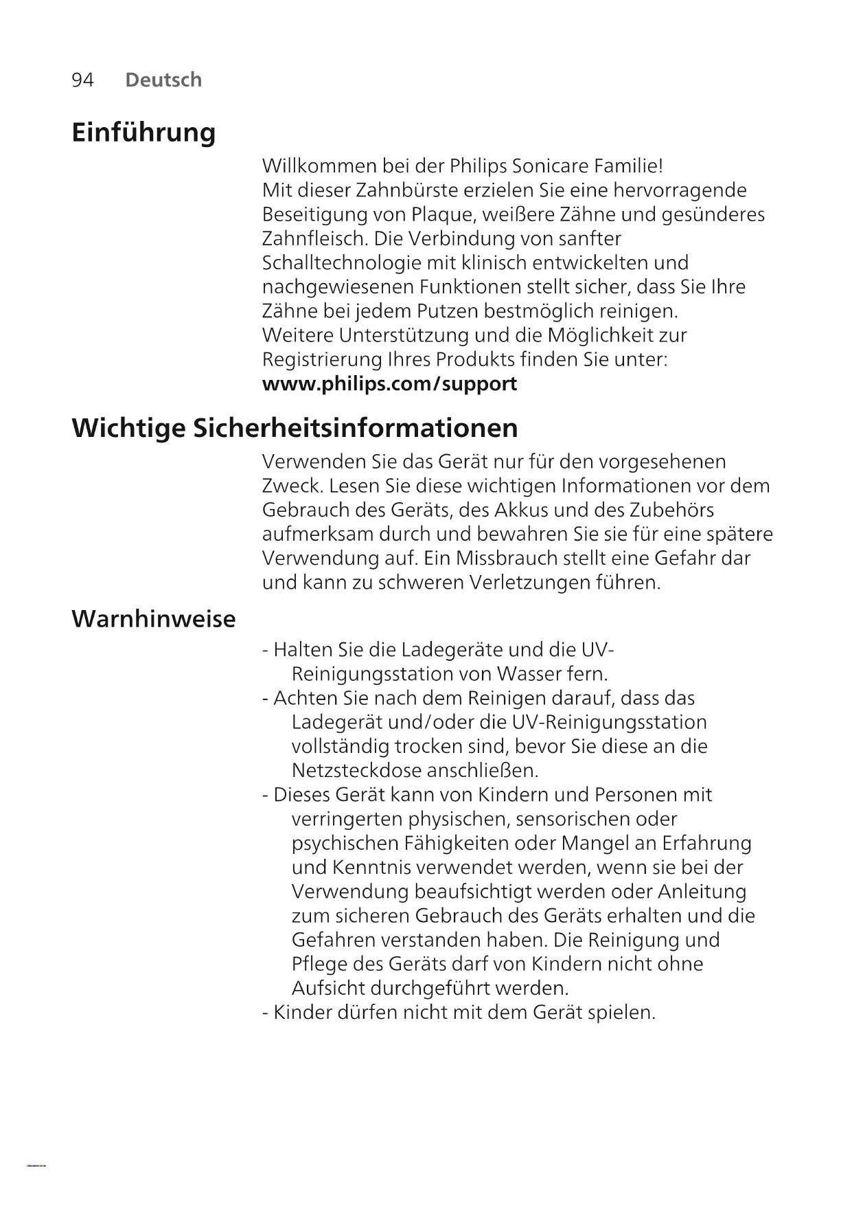 Deutsch Einführung Willkommen bei der Philips Sonicare Familie! Mit dieser Zahnbürste erzielen Sie eine hervorragende Beseitigung von Plaque, weißere Zähne und gesünderes Zahnfleisch. Die Verbindung von sanfter Schalltechnologie mit klinisch entwickelten und nachgewiesenen Funktionen stellt sicher, dass Sie Ihre Zähne bei jedem Putzen bestmöglich reinigen. Weitere Unterstützung und die Möglichkeit zur Registrierung Ihres Produkts finden Sie unter: www.philips.com/support Wichtige Sicherheitsinformationen Verwenden Sie das Gerät nur für den vorgesehenen Zweck. Lesen Sie diese wichtigen Informationen vor dem Gebrauch des Geräts, des Akkus und des Zubehörs aufmerksam durch und bewahren Sie sie für eine spätere Verwendung auf. Ein Missbrauch stellt eine Gefahr dar und kann zu schweren Verletzungen führen. Warnhinweise - Halten Sie die Ladegeräte und die UV- Reinigungsstation von Wasser fern. - Achten Sie nach dem Reinigen darauf, dass das Ladegerät und/oder die UV-Reinigungsstation vollständig trocken sind, bevor Sie diese an die Netzsteckdose anschließen. - Dieses Gerät kann von Kindern und Personen mit verringerten physischen, sensorischen oder psychischen Fähigkeiten oder Mangel an Erfahrung und Kenntnis verwendet werden, wenn sie bei der Verwendung beaufsichtigt werden oder Anleitung zum sicheren Gebrauch des Geräts erhalten und die Gefahren verstanden haben. Die Reinigung und Pflege des Geräts darf von Kindern nicht ohne Aufsicht durchgeführt werden. - Kinder dürfen nicht mit dem Gerät spielen.95 Deutsch - Verwenden Sie nur Original-Zubehörteile oder - Verbrauchsmaterialien von Philips. Verwenden Sie nur das Ladegerät, das im Lieferumfang des Produkts enthalten ist. Falls vorhanden, verwenden Sie nur das Original-USB-Kabel und -Netzteil. - Dieses Gerät enthält keine Teile, die vom Benutzer repariert werden können. Wenn das Gerät beschädigt ist, verwenden Sie es nicht mehr, und wenden Sie sich bitte an das Service‑Center in Ihrem Land. Nur für Geräte mit Kabel: Wenn das Kabel beschädigt ist, ersetzen Sie das Ladegerät mit Reinigungsstation durch ein neues. - Verwenden Sie das Ladegerät und/oder die UV- Reinigungsstation nie im Freien oder in der Nähe von heißen Oberflächen. - Die Produktteile dürfen nicht in der Spülmaschine gereinigt werden. - Dieses Gerät ist ausschließlich zum Reinigen von Zähnen, Zahnfleisch und Zunge gedacht. - Bewahren Sie die Reinigungsstation immer außerhalb der Reichweite von Kindern auf. - Verwenden Sie die Reinigungsstation nicht mehr, wenn die UV-Lampe bei geöffneter Klappe weiterhin leuchtet. UV-Licht kann für das menschliche Auge und die Haut schädlich sein. - Bedienen Sie die Reinigungsstation nur mit Schutzscheibe. - Berühren Sie die UV-Lampe der UV-Reinigungsstation nicht, wenn sie heiß ist. - Unterlassen Sie es, einen Bürstenkopf mit abgeknickten oder zerdrückten Borsten zu verwenden. Ersetzen Sie den Bürstenkopf alle 3Monate oder früher, falls Anzeichen von Abnutzung auftreten. - Vermeiden Sie direkten Kontakt mit Produkten, die ätherische Öle oder Kokosnussöl enthalten. Der Kontakt kann zum Lösen von Borsten führen.96 Deutsch - Verwenden Sie das Gerät nicht mehr, und konsultieren Sie Ihren Zahnarzt/Arzt, wenn übermäßiges Zahnfleischbluten auftritt oder Zahnfleischbluten länger als eine Woche anhält oder wenn Sie beim Gebrauch Unbehagen oder Schmerzen verspüren. - Wenn in den vergangenen 2Monaten ein chirurgischer Eingriff an Ihren Zähnen oder am Zahnfleisch vorgenommen wurde, sollten Sie vor Benutzung des Geräts Ihren Zahnarzt konsultieren. - Wenden Sie sich als Träger eines Herzschrittmachers oder eines anderen Implantats vor der Verwendung dieses Geräts an Ihren Arzt oder den Hersteller des implantierten Gerätes. - Sollten Sie Bedenken wegen Ihrer Gesundheit haben, konsultieren Sie vor Benutzung dieses Geräts Ihren Arzt. - Dieses Gerät ist ein Gerät zur individuellen Mundpflege und nicht für die Verwendung durch mehrere Patienten in einer Zahnarztpraxis oder Zahnklinik geeignet. Batterie-Sicherheitsanweisungen - Dieses Gerät verwendet Akkus, die nur von fachkundigen Personen entfernt werden dürfen. - Verwenden Sie das Gerät nur für den vorgesehenen Zweck. Lesen Sie diese Informationen vor dem Gebrauch des Geräts, des Akkus und des Zubehörs aufmerksam durch und bewahren Sie sie für eine spätere Verwendung auf. Ein Missbrauch stellt eine Gefahr dar und kann zu schweren Verletzungen führen. Das mitgelieferte Zubehör kann für verschiedene Produkte variieren. - Verwenden Sie nur Original-Zubehörteile und - Verbrauchsmaterialien von Philips. Verwenden Sie nur das abnehmbare Netzteil TCBxxxx, HX6100, HX6110, HX6160 oder WAAxxxx. - Halten Sie das Produkt und die Akkus von Feuer fern und setzen Sie sie keinem direkten Sonnenlicht oder hohen Temperaturen aus.97 Deutsch - Wenn das Produkt ungewöhnlich heiß wird, einen ungewöhnlichen Geruch entwickelt, die Farbe ändert oder wenn das Laden viel länger dauert als üblich, beenden Sie die Verwendung und das Laden des Produkts und wenden Sie sich an Philips. - Legen Sie die Produkte und die Batterien nicht in Mikrowellen oder auf Induktionsherde. - Um die Aufheizung oder die Freisetzung giftiger oder gefährlicher Substanzen aus den Akkus zu verhindern, sollten Sie das Produkt oder die Akkus nicht öffnen, modifizieren, durchbohren, beschädigen oder zerlegen. Überladen Sie die Akkus nicht, verursachen Sie keinen Kurzschluss und laden Sie sie nicht umgekehrt auf. - Dieses Gerät verwendet Akkus, die nicht austauschbar sind. Wenn der Akku das Ende seiner Lebenszeit erreicht hat, muss das Gerät ordnungsgemäß entsorgt werden (siehe Abschnitt zum Recycling). - Wenn Batterien beschädigt oder undicht sind, vermeiden Sie den Kontakt mit der Haut oder dem Auge. Wenn dies der Fall ist, spülen Sie die entsprechende Stelle sofort gründlich mit Wasser. Suchen Sie medizinische Hilfe. - Achten Sie beim Umgang mit Batterien dar