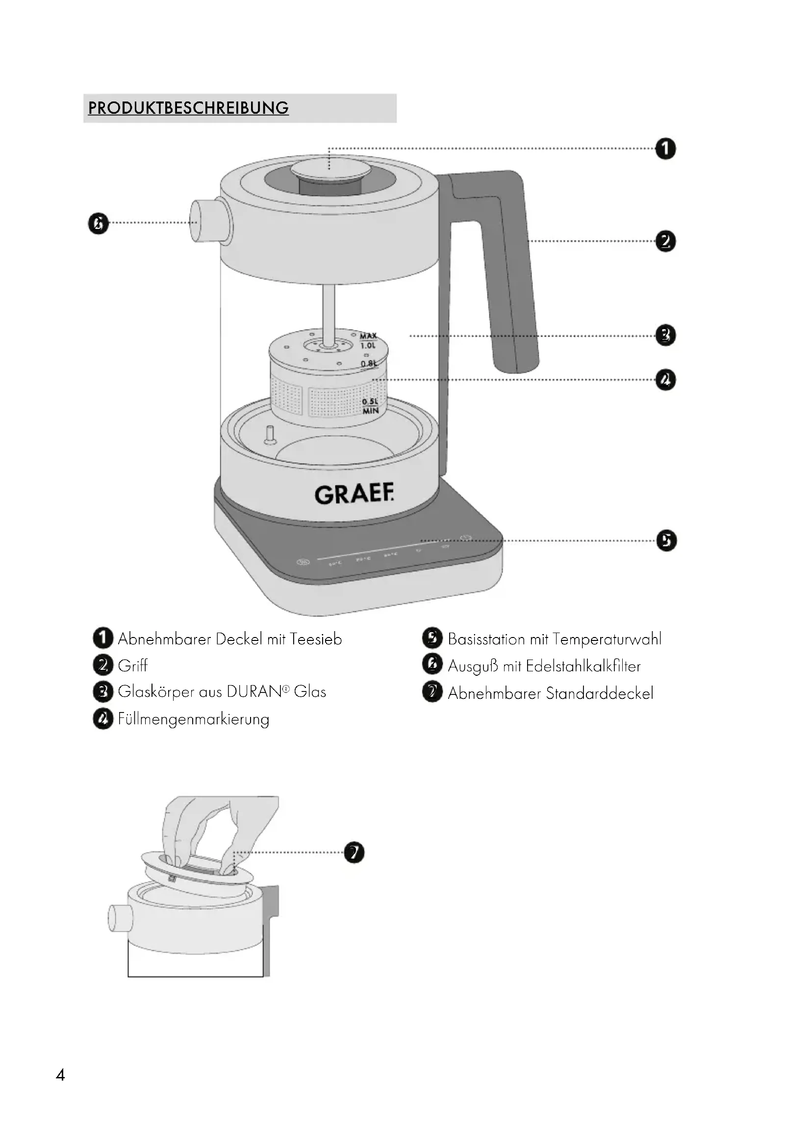 Um Teeablagerungen zu vermeiden, empfehlen wir den Wasserkocher nach jeder Benutzung zu reinigen. Das Innere des Wasserkochers kann mit warmen Wasser und einer Spülbürste gereinigt werden. Abhängig von dem Härtegrad des Wassers in Ihrer Region, kommt es mit der Zeit zu Kalkab- lagerungen am Boden und an der Innenwand des Glasbehälters. Je härter das Wasser, desto schneller bilden sich Kalkablagerungen. Entkalken Sie das Gerät regelmäßig, da zu viel Kalk die Leistung des Gerätes beeinträch- tigen kann. Ein Defekt, der auf eine mangelnde Entkalkung zurückzuführen ist, fällt nicht unter die Gewährleistung. Wenn Sie das Gerät regelmäßig entkalken, erhöht dies die Lebensdauer Ihres Gerätes. Wir empfehlen zur Entkalkung die Verwendung die Graef Entkalkungstabletten, diese sind auf un- sere Geräte abgestimmt. Sie erhalten die Entkalkungstabletten in unserem Online-Shop über www.graef.de unter der Artikel-Nr. 145618. Des Weiteren treten durch das Wasser Verschmut- zungen im Inneren des Behälters auf, diese können durch regelmäßiges Entkalken mit entfernt werden. Vorgang: ● Befüllen Sie das Gerät bis zur maximalen Füllmengenmarkierung mit Wasser. ● Legen Sie die Entkalkungstablette ein, lassen Sie diese ca. 5 Minuten einwirken. ● Kochen Sie das Entkalkungsgemisch auf. ● Leeren Sie das Gerät und spülen dieses mit klarem Wasser mehrfach aus. Für fehlende oder unzureichende Entkalkung übernehmen wir keine Haftung. In diesem Fall erlischt die Gewährleistung.2 JAHRE GEWÄHRLEISTUNG Für dieses Produkt übernehmen wir beginnend vom Verkaufsdatum 24 Monate Herstellerge- währleistung für Mängel, die auf Fertigungs- und Werkstofffehler zurückzuführen sind. Ihre gesetzlichen Gewährleistungsansprüche nach § 437 ff. BGB bleiben von dieser Regelung unberührt. In der Gewährleistung nicht enthalten sind Schäden, die durch unsachgemäße Be- handlung oder Einsatz entstanden sind sowie Mängel, welche die Funktion oder den Wert des Gerätes nur geringfügig beeinflussen. Darüber hinaus übernehmen wir für Schäden durch fehlende oder unzureichende Entkalkung und Pflege keine Haftung. In diesem Fall erlischt die Gewährleistung ebenfalls. Verwenden Sie ausschließlich die Graef Original-Entkalkungs- und Reinigungstabletten. Weitergehend sind Transportschäden, soweit wir dies nicht zu verantwor- ten haben, vom Gewährleistungsanspruch ausgeschlossen. Für Schäden, die durch eine nicht von uns oder eine unserer Vertretungen durchgeführte Reparatur entstehen, ist ein Gewährleis- tungsanspruch ausgeschlossen. Bei berechtigten Reklamationen werden wir das mangelhafte Produkt nach unserer Wahl reparieren oder gegen ein mängelfreies Produkt austauschen.17