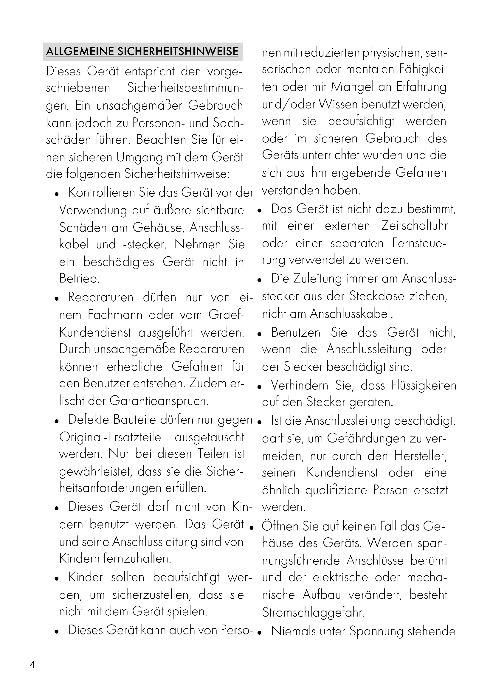 - 2 Jahre Motorgarantie ALLGEMEINE SICHERHEITSHINWEISE Dieses Gerät entspricht den vorge- schriebenen Sicherheitsbestimmun- gen. Ein unsachgemäßer Gebrauch kann jedoch zu Personen- und Sach- schäden führen. Beachten Sie für ei- nen sicheren Umgang mit dem Gerät die folgenden Sicherheitshinweise: ● Kontrollieren Sie das Gerät vor der Verwendung auf äußere sichtbare Schäden am Gehäuse, Anschluss- kabel und -stecker. Nehmen Sie ein beschädigtes Gerät nicht in Betrieb. ● Reparaturen dürfen nur von ei- nem Fachmann oder vom Graef- Kundendienst ausgeführt werden. Durch unsachgemäße Reparaturen können erhebliche Gefahren für den Benutzer entstehen. Zudem er- lischt der Garantieanspruch. ● Defekte Bauteile dürfen nur gegen Original-Ersatzteile ausgetauscht werden. Nur bei diesen Teilen ist gewährleistet, dass sie die Sicher- heitsanforderungen erfüllen. ● Dieses Gerät darf nicht von Kin- dern benutzt werden. Das Gerät und seine Anschlussleitung sind von Kindern fernzuhalten. ● Kinder sollten beaufsichtigt wer- den, um sicherzustellen, dass sie nicht mit dem Gerät spielen. ● Dieses Gerät kann auch von Perso- nen mit reduzierten physischen, sen- sorischen oder mentalen Fähigkei- ten oder mit Mangel an Erfahrung und/oder Wissen benutzt werden, wenn sie beaufsichtigt werden oder im sicheren Gebrauch des Geräts unterrichtet wurden und die sich aus ihm ergebende Gefahren verstanden haben. ● Das Gerät ist nicht dazu bestimmt, mit einer externen Zeitschaltuhr oder einer separaten Fernsteue- rung verwendet zu werden. ● Die Zuleitung immer am Anschluss- stecker aus der Steckdose ziehen, nicht am Anschlusskabel. ● Benutzen Sie das Gerät nicht, wenn die Anschlussleitung oder der Stecker beschädigt sind. ● Verhindern Sie, dass Flüssigkeiten auf den Stecker geraten. ● Ist die Anschlussleitung beschädigt, darf sie, um Gefährdungen zu ver- meiden, nur durch den Hersteller, seinen Kundendienst oder eine ähnlich qualifizierte Person ersetzt werden. ● Öffnen Sie auf keinen Fall das Ge- häuse des Geräts. Werden span- nungsführende Anschlüsse berührt und der elektrische oder mecha- nische Aufbau verändert, besteht Stromschlaggefahr. ● Niemals unter Spannung stehende5 p. 144