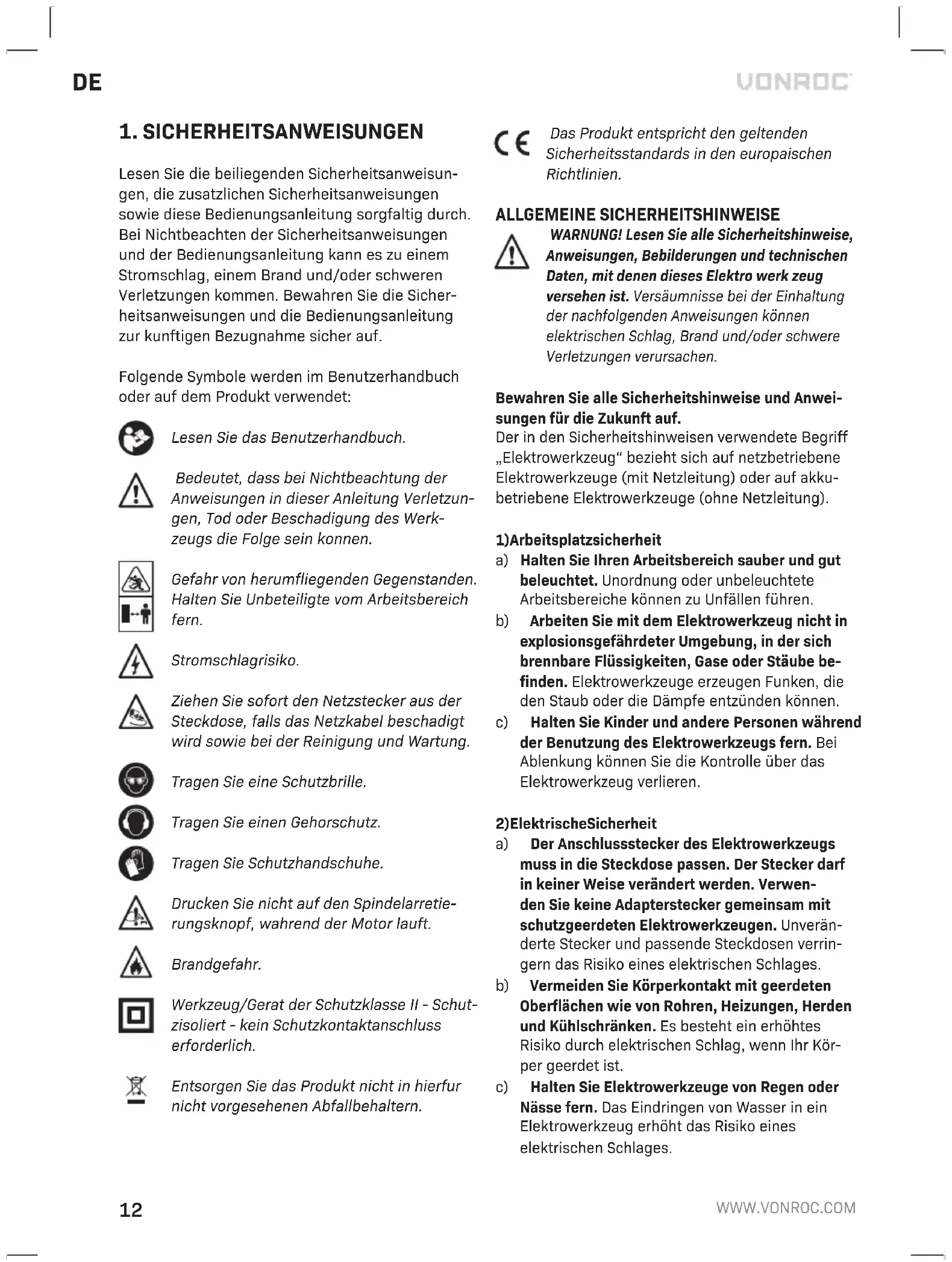Lesen Sie die beiliegenden Sicherheitsanweisun- gen, die zusatzlichen Sicherheitsanweisungen sowie diese Bedienungsanleitung sorgfaltig durch. Bei Nichtbeachten der Sicherheitsanweisungen und der Bedienungsanleitung kann es zu einem Stromschlag, einem Brand und/oder schweren Verletzungen kommen. Bewahren Sie die Sicher- heitsanweisungen und die Bedienungsanleitung zur kunftigen Bezugnahme sicher auf. Folgende Symbole werden im Benutzerhandbuch oder auf dem Produkt verwendet: Lesen Sie das Benutzerhandbuch. Bedeutet, dass bei Nichtbeachtung der Anweisungen in dieser Anleitung Verletzun- gen, Tod oder Beschadigung des Werk- zeugs die Folge sein konnen. Gefahr von herumfliegenden Gegenstanden. Halten Sie Unbeteiligte vom Arbeitsbereich fern. Stromschlagrisiko. Ziehen Sie sofort den Netzstecker aus der Steckdose, falls das Netzkabel beschadigt wird sowie bei der Reinigung und Wartung. Tragen Sie eine Schutzbrille. Tragen Sie einen Gehorschutz. Tragen Sie Schutzhandschuhe. Drucken Sie nicht auf den Spindelarretie- rungsknopf, wahrend der Motor lauft. Brandgefahr. Werkzeug/Gerat der Schutzklasse II - Schut- zisoliert - kein Schutzkontaktanschluss erforderlich. Entsorgen Sie das Produkt nicht in hierfur nicht vorgesehenen Abfallbehaltern. Das Produkt entspricht den geltenden Sicherheitsstandards in den europaischen Richtlinien. ALLGEMEINE SICHERHEITSHINWEISE WARNUNG! Lesen Sie alle Sicherheitshinweise, Anweisungen, Bebilderungen und technischen Daten, mit denen dieses Elektro werk zeug versehen ist. Versäumnisse bei der Einhaltung der nachfolgenden Anweisungen können elektrischen Schlag, Brand und/oder schwere Verletzungen verursachen. Bewahren Sie alle Sicherheitshinweise und Anwei- sungen für die Zukunft auf. Der in den Sicherheitshinweisen verwendete Begriff „Elektrowerkzeug“ bezieht sich auf netzbetriebene Elektrowerkzeuge (mit Netzleitung) oder auf akku- betriebene Elektrowerkzeuge (ohne Netzleitung).