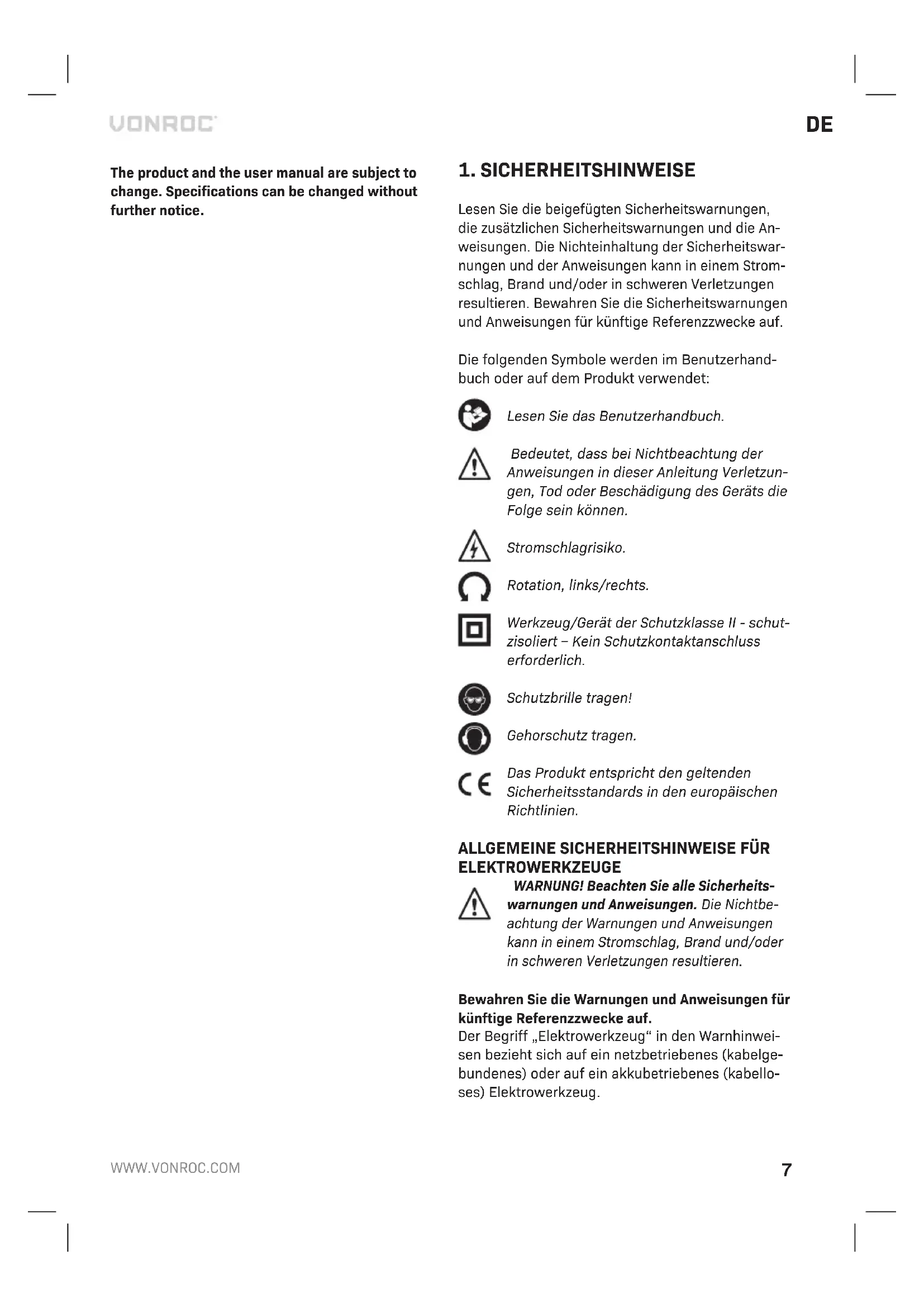 - Es wurden keine Originalersatzteile verwendet. Dies ist die einzige ausdrückliche oder stillschwei- gende Garantie, die das Unternehmen übernimmt. Es gibt keine weiteren ausdrücklichen oder still- schweigenden Garantien, die über die hierin ent- haltenen Angaben hinausgehen, einschließlich der stillschweigenden Garantien der Gebrauchstaug- lichkeit und Eignung für einen bestimmten Zweck. VONROC haftet in keinem Fall für zufällige Schäden oder Folgeschäden. Die Rechtsmittel des Händlers beschränken sich auf die Reparatur oder den Aus- tausch der nicht konformen Geräte oder Teile. Das Produkt und die Bedienungsanleitung können Änderungen unterliegen. Technische Daten können ohne vorherige Ankündigung geändert werden.NL