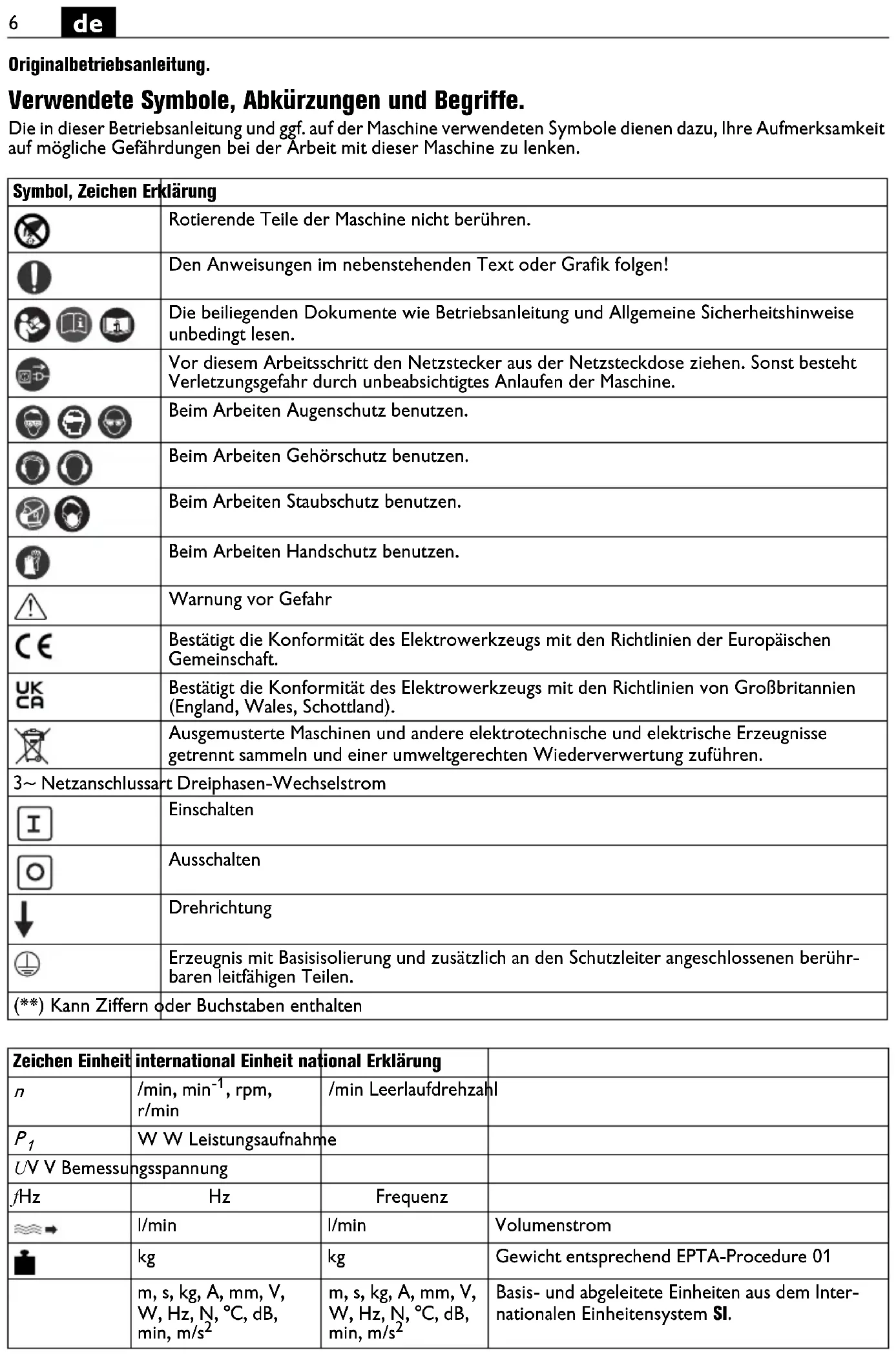 Originalbetriebsanleitung. Verwendete Symbole, Abkürzungen und Begriffe. Die in dieser Betriebsanleitung und ggf. auf der Maschine verwendeten Symbole dienen dazu, Ihre Aufmerksamkeit auf mögliche Gefährdungen bei der Arbeit mit dieser Maschine zu lenken. Symbol, Zeichen Erklärung Rotierende Teile der Maschine nicht berühren. Den Anweisungen im nebenstehenden Text oder Grafik folgen! Die beiliegenden Dokumente wie Betriebsanleitung und Allgemeine Sicherheitshinweise unbedingt lesen. Vor diesem Arbeitsschritt den Netzstecker aus der Netzsteckdose ziehen. Sonst besteht Verletzungsgefahr durch unbeabsichtigtes Anlaufen der Maschine. Beim Arbeiten Augenschutz benutzen. Beim Arbeiten Gehörschutz benutzen. Beim Arbeiten Staubschutz benutzen. Beim Arbeiten Handschutz benutzen. Warnung vor Gefahr Bestätigt die Konformität des Elektrowerkzeugs mit den Richtlinien der Europäischen Gemeinschaft. Bestätigt die Konformität des Elektrowerkzeugs mit den Richtlinien von Großbritannien (England, Wales, Schottland). Ausgemusterte Maschinen und andere elektrotechnische und elektrische Erzeugnisse getrennt sammeln und einer umweltgerechten Wiederverwertung zuführen. 3~ Netzanschlussart Dreiphasen-Wechselstrom Einschalten Ausschalten Drehrichtung Erzeugnis mit Basisisolierung und zusätzlich an den Schutzleiter angeschlossenen berühr- baren leitfähigen Teilen. (**) Kann Ziffern oder Buchstaben enthalten Zeichen Einheit international Einheit national Erklärung