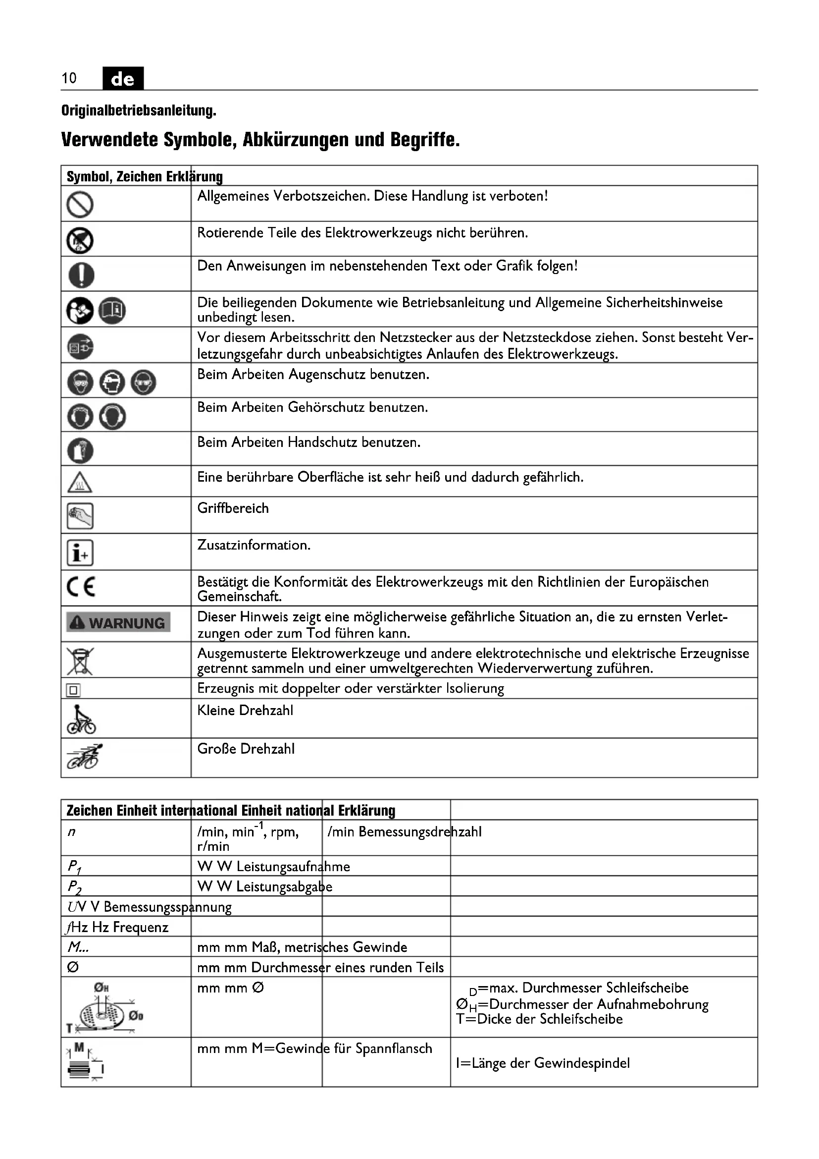 Originalbetriebsanleitung. Verwendete Symbole, Abkürzungen und Begriffe. Symbol, Zeichen Erklärung Allgemeines Verbotszeichen. Diese Handlung ist verboten! Rotierende Teile des Elektrowerkzeugs nicht berühren. Den Anweisungen im nebenstehenden Text oder Grafik folgen! Die beiliegenden Dokumente wie Betriebsanleitung und Allgemeine Sicherheitshinweise unbedingt lesen. Vor diesem Arbeitsschritt den Netzstecker aus der Netzsteckdose ziehen. Sonst besteht Ver- letzungsgefahr durch unbeabsichtigtes Anlaufen des Elektrowerkzeugs. Beim Arbeiten Augenschutz benutzen. Beim Arbeiten Gehörschutz benutzen. Beim Arbeiten Handschutz benutzen. Eine berührbare Oberfläche ist sehr heiß und dadurch gefährlich. Griffbereich Zusatzinformation. Bestätigt die Konformität des Elektrowerkzeugs mit den Richtlinien der Europäischen Gemeinschaft. Dieser Hinweis zeigt eine möglicherweise gefährliche Situation an, die zu ernsten Verlet- zungen oder zum Tod führen kann. Ausgemusterte Elektrowerkzeuge und andere elektrotechnische und elektrische Erzeugnisse getrennt sammeln und einer umweltgerechten Wiederverwertung zuführen. Erzeugnis mit doppelter oder verstärkter Isolierung Kleine Drehzahl Große Drehzahl WARNUNG Zeichen Einheit international Einheit national Erklärung