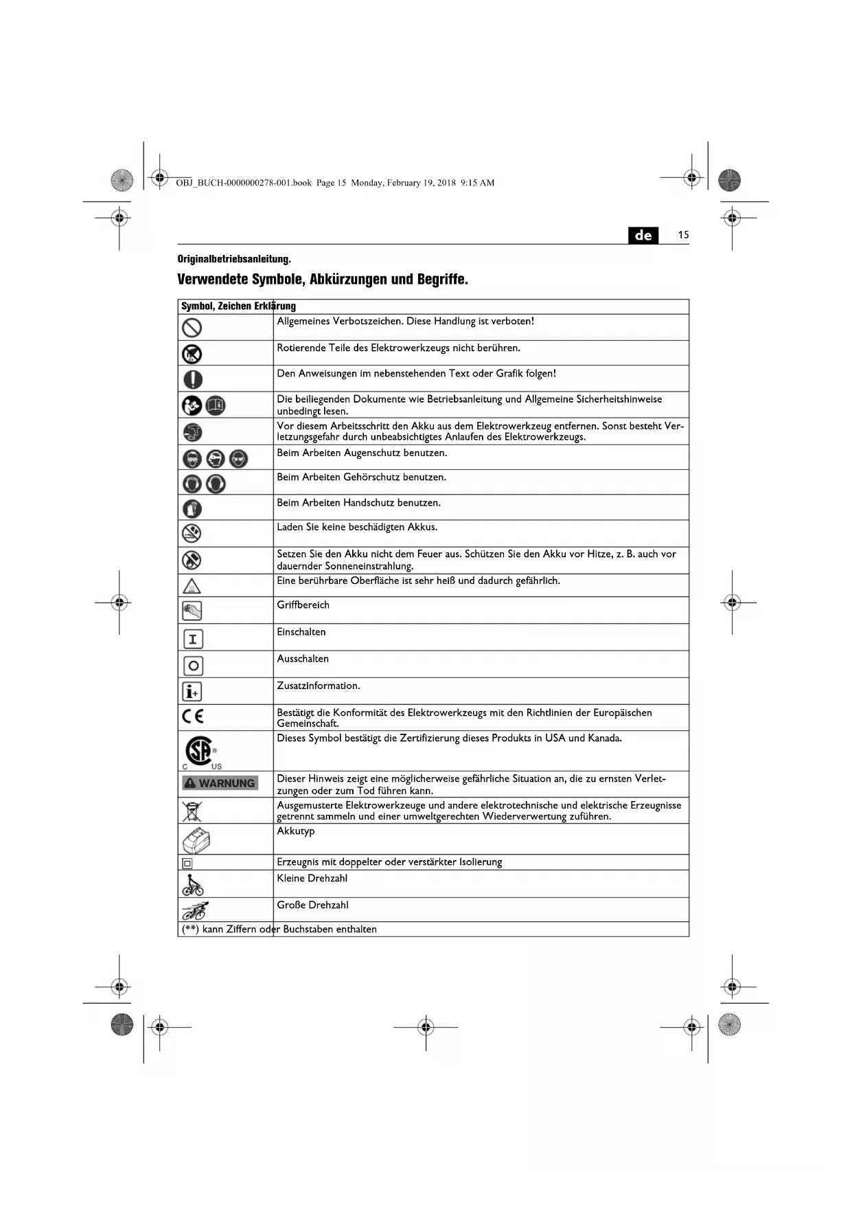 Originalbetriebsanleitung. Verwendete Symbole, Abkürzungen und Begriffe. Symbol, Zeichen Erklärung Allgemeines Verbotszeichen. Diese Handlung ist verboten! Rotierende Teile des Elektrowerkzeugs nicht berühren. Den Anweisungen im nebenstehenden Text oder Grafik folgen! Die beiliegenden Dokumente wie Betriebsanleitung und Allgemeine Sicherheitshinweise unbedingt lesen. Vor diesem Arbeitsschritt den Akku aus dem Elektrowerkzeug entfernen. Sonst besteht Ver- letzungsgefahr durch unbeabsichtigtes Anlaufen des Elektrowerkzeugs. Beim Arbeiten Augenschutz benutzen. Beim Arbeiten Gehörschutz benutzen. Beim Arbeiten Handschutz benutzen. Laden Sie keine beschädigten Akkus. Setzen Sie den Akku nicht dem Feuer aus. Schützen Sie den Akku vor Hitze, z. B. auch vor dauernder Sonneneinstrahlung. Eine berührbare Oberfläche ist sehr heiß und dadurch gefährlich. Griffbereich Einschalten Ausschalten Zusatzinformation. Bestätigt die Konformität des Elektrowerkzeugs mit den Richtlinien der Europäischen Gemeinschaft. Dieses Symbol bestätigt die Zertifizierung dieses Produkts in USA und Kanada. Dieser Hinweis zeigt eine möglicherweise gefährliche Situation an, die zu ernsten Verlet- zungen oder zum Tod führen kann. Ausgemusterte Elektrowerkzeuge und andere elektrotechnische und elektrische Erzeugnisse getrennt sammeln und einer umweltgerechten Wiederverwertung zuführen. Akkutyp Erzeugnis mit doppelter oder verstärkter Isolierung Kleine Drehzahl Große Drehzahl (**) kann Ziffern oder Buchstaben enthalten WARNUNG OBJ_BUCH-0000000278-001.book Page 15 Monday, February 19, 2018 9:15 AM16