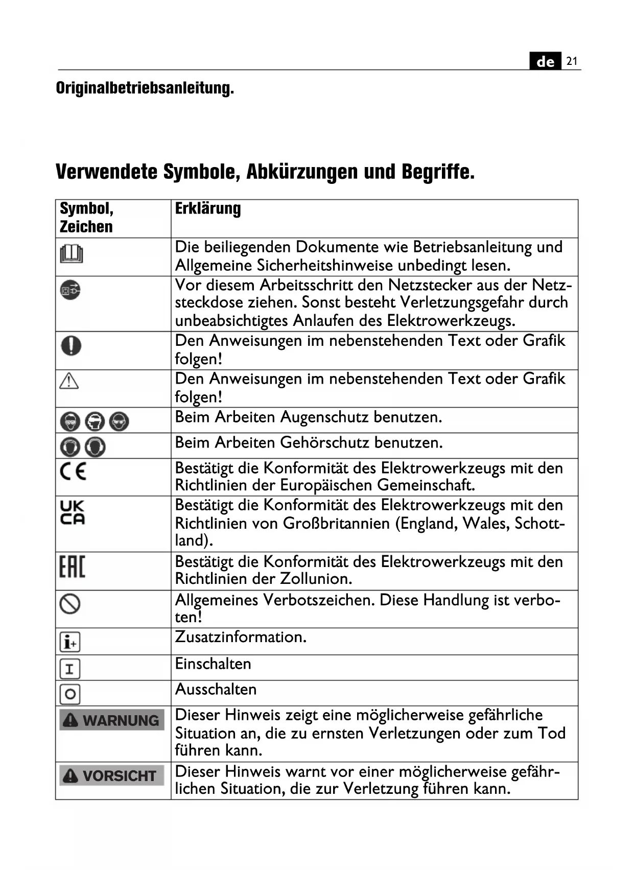Originalbetriebsanleitung.Übersetzung der Originalbetriebsanleitung. Produktionsdatum: Produktionsjahr und -monat sind auf dem Typenschild des Saugers angegeben. Dabei geben die ersten 4 Ziffern das Produktions- jahr, die weiteren 2 Ziffern den Produktionsmonat an. Verwendete Symbole, Abkürzungen und Begriffe. Symbol, Zeichen Erklärung Die beiliegenden Dokumente wie Betriebsanleitung und Allgemeine Sicherheitshinweise unbedingt lesen. Vor diesem Arbeitsschritt den Netzstecker aus der Netz- steckdose ziehen. Sonst besteht Verletzungsgefahr durch unbeabsichtigtes Anlaufen des Elektrowerkzeugs. Den Anweisungen im nebenstehenden Text oder Grafik folgen! Den Anweisungen im nebenstehenden Text oder Grafik folgen! Beim Arbeiten Augenschutz benutzen. Beim Arbeiten Gehörschutz benutzen. Bestätigt die Konformität des Elektrowerkzeugs mit den Richtlinien der Europäischen Gemeinschaft. Bestätigt die Konformität des Elektrowerkzeugs mit den Richtlinien von Großbritannien (England, Wales, Schott- land). Bestätigt die Konformität des Elektrowerkzeugs mit den Richtlinien der Zollunion. Allgemeines Verbotszeichen. Diese Handlung ist verbo- ten! Zusatzinformation. Einschalten Ausschalten Dieser Hinweis zeigt eine möglicherweise gefährliche Situation an, die zu ernsten Verletzungen oder zum Tod führen kann. Dieser Hinweis warnt vor einer möglicherweise gefähr- lichen Situation, die zur Verletzung führen kann. WARNUNG VORSICHT nur für RU22