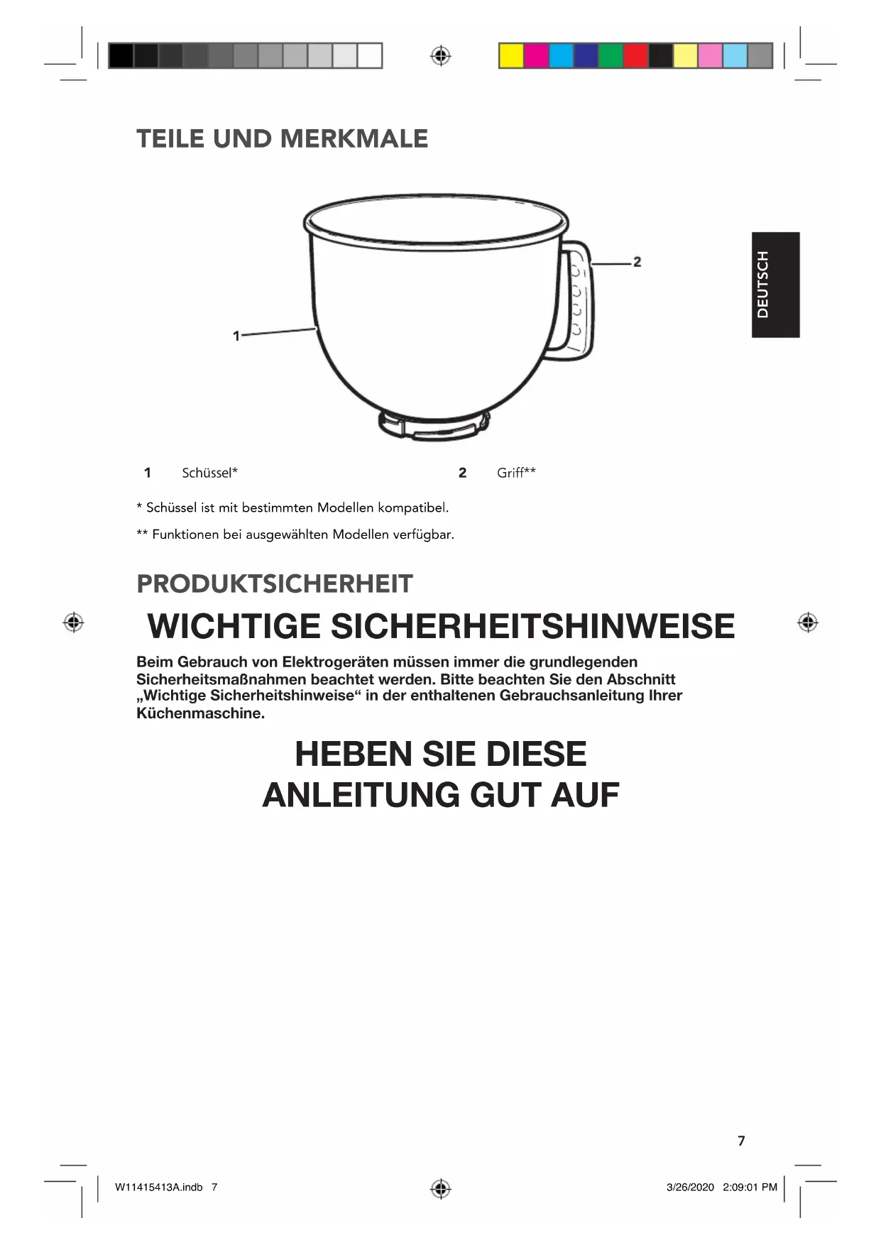 PRODUKTSICHERHEIT WICHTIGE SICHERHEITSHINWEISE Beim Gebrauch von Elektrogeräten müssen immer die grundlegenden Sicherheitsmaßnahmen beachtet werden. Bitte beachten Sie den Abschnitt „Wichtige Sicherheitshinweise“ in der enthaltenen Gebrauchsanleitung Ihrer Küchenmaschine.