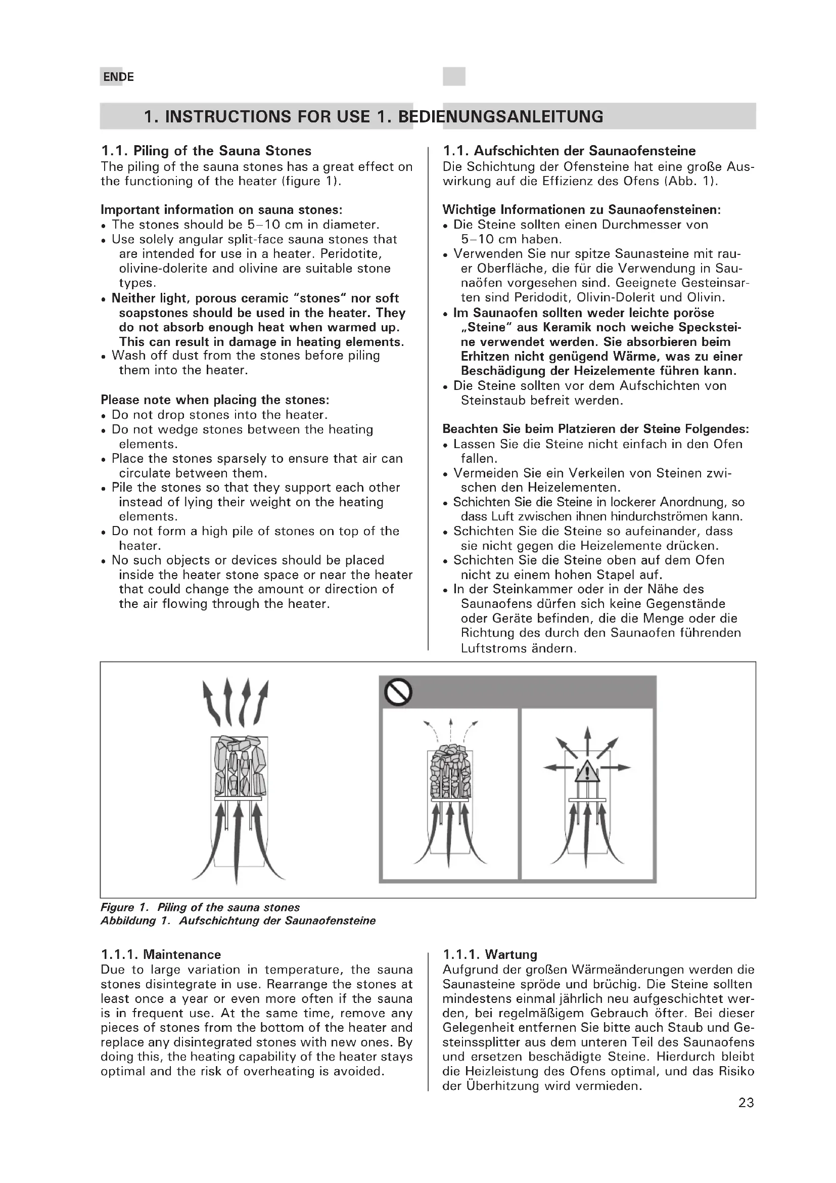 Aufgrund der großen Wärmeänderungen werden die Saunasteine spröde und brüchig. Die Steine sollten mindestens einmal jährlich neu aufgeschichtet wer- den, bei regelmäßigem Gebrauch öfter. Bei dieser Gelegenheit entfernen Sie bitte auch Staub und Ge- steinssplitter aus dem unteren Teil des Saunaofens und ersetzen beschädigte Steine. Hierdurch bleibt die Heizleistung des Ofens optimal, und das Risiko der Überhitzung wird vermieden.EN DE