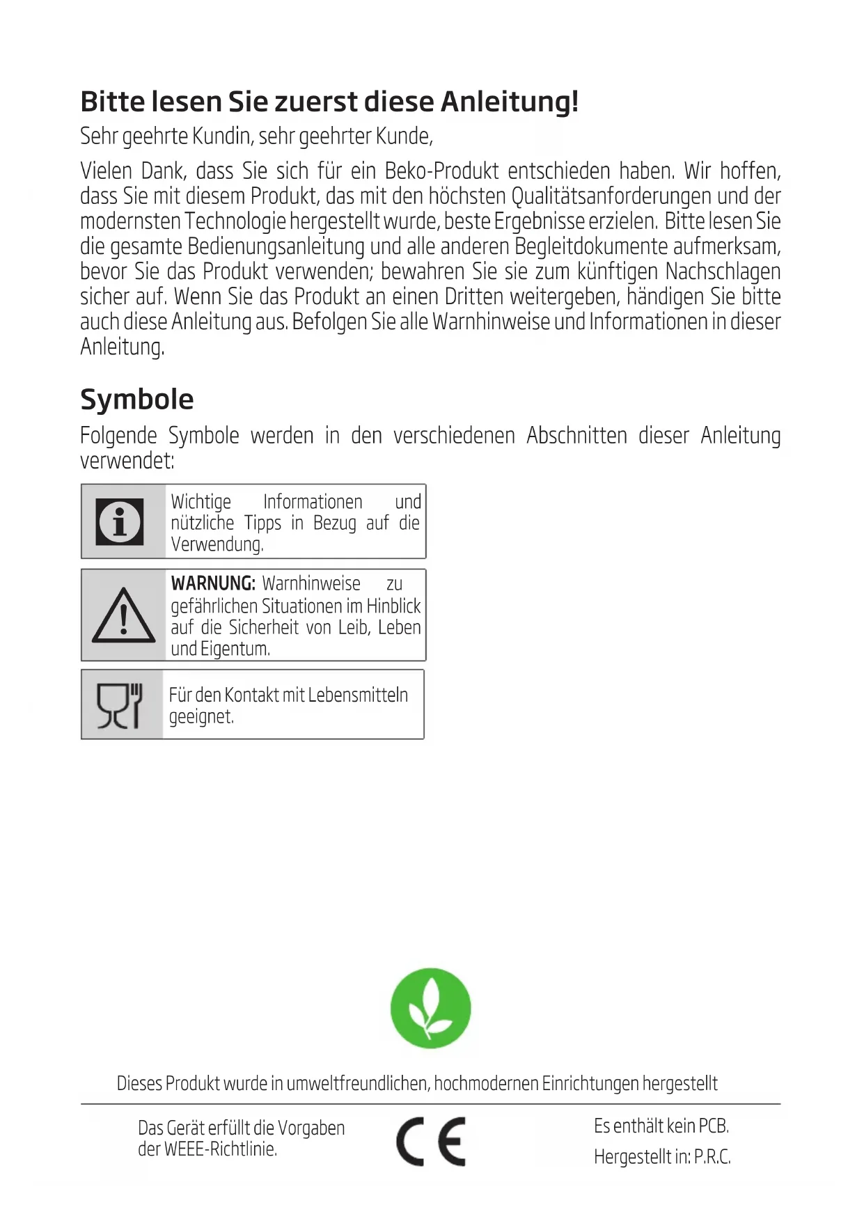 - Dropping the appliance will render it non- operational or cause permanent damage.Bitte lesen Sie zuerst diese Anleitung! Sehr geehrte Kundn, sehr geehrter Kunde, Velen Dank, dass Se sch für en Beko-Produkt entscheden haben. Wr hoffen, dass Se mt desem Produkt, das mt den höchsten Qualtätsanforderungen und der modernsten Technologe hergestellt wurde, beste Ergebnsse erzelen. Btte lesen Se de gesamte Bedenungsanletung und alle anderen Begletdokumente aufmerksam, bevor Se das Produkt verwenden; bewahren Se se zum künftgen Nachschlagen scher auf. Wenn Se das Produkt an enen Drtten wetergeben, händgen Se btte auch dese Anletung aus. Befolgen Se alle Warnhnwese und Informatonen n deser Anletung. Symbole Folgende Symbole werden n den verschedenen Abschntten deser Anletung verwendet:
