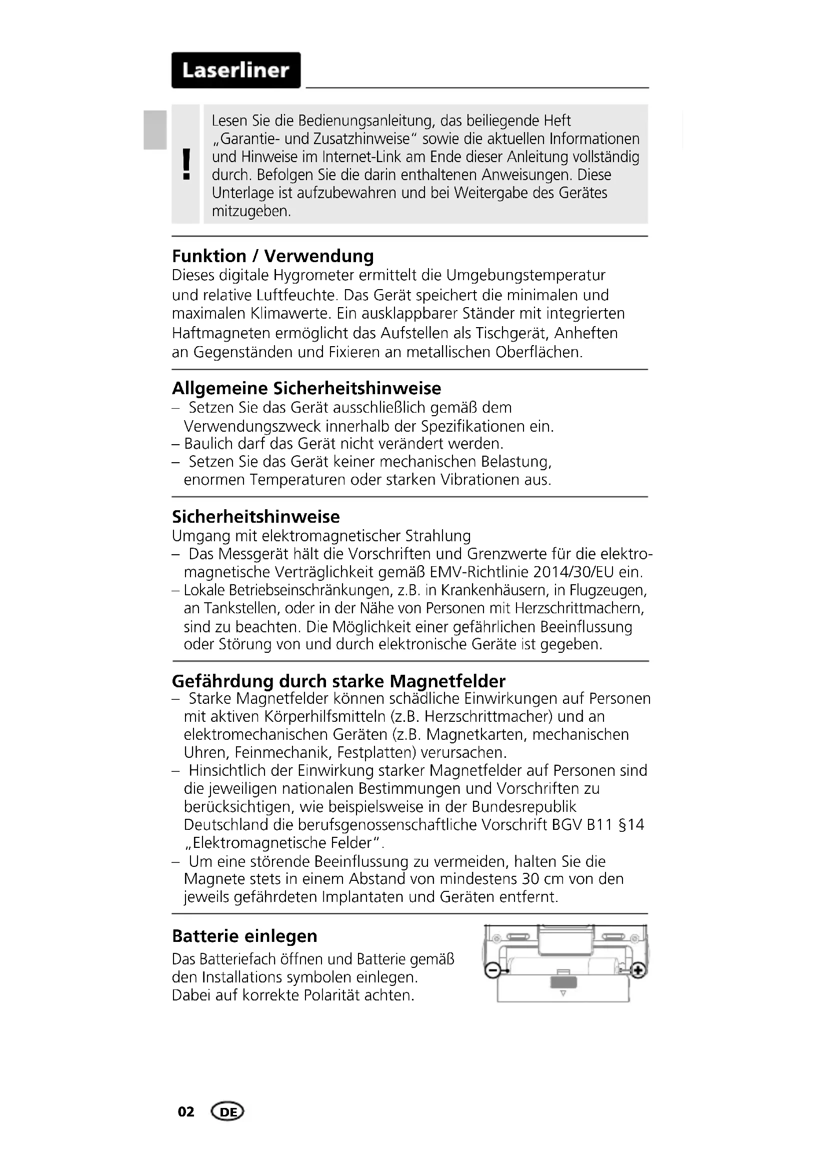 Lokale Betriebseinschränkungen, z.B. in Krankenhäusern, in Flugzeugen, an Tankstellen, oder in der Nähe von Personen mit Herzschrittmachern, sind zu beachten. Die Möglichkeit einer gefährlichen Beeinussung oder Störung von und durch elektronische Geräte ist gegeben. Gefährdung durch starke Magnetfelder – Starke Magnetfelder können schädliche Einwirkungen auf Personen mit aktiven Körperhilfsmitteln (z.B. Herzschrittmacher) und an elektromechanischen Geräten (z.B. Magnetkarten, mechanischen Uhren, Feinmechanik, Festplatten) verursachen. – Hinsichtlich der Einwirkung starker Magnetfelder auf Personen sind die jeweiligen nationalen Bestimmungen und Vorschriften zu berücksichtigen, wie beispielsweise in der Bundesrepublik Deutschland die berufsgenossenschaftliche Vorschrift BGV B11 §14 „Elektromagnetische Felder“. – Um eine störende Beeinussung zu vermeiden, halten Sie die Magnete stets in einem Abstand von mindestens 30 cm von den jeweils gefährdeten Implantaten und Geräten entfernt. Batterie einlegen Allgemeine Sicherheitshinweise – Setzen Sie das Gerät ausschließlich gemäß dem Verwendungszweck innerhalb der Spezikationen ein. – Baulich darf das Gerät nicht verändert werden. – Setzen Sie das Gerät keiner mechanischen Belastung, enormen Temperaturen oder starken Vibrationen aus. Das Batteriefach öffnen und Batterie gemäß den Installations symbolen einlegen. Dabei auf korrekte Polarität achten. Funktion / Verwendung Dieses digitale Hygrometer ermittelt die Umgebungstemperatur und relative Luftfeuchte. Das Gerät speichert die minimalen und maximalen Klimawerte. Ein ausklappbarer Ständer mit integrierten Haftmagneten ermöglicht das Aufstellen als Tischgerät, Anheften an Gegenständen und Fixieren an metallischen Oberächen.ClimaHome-Check